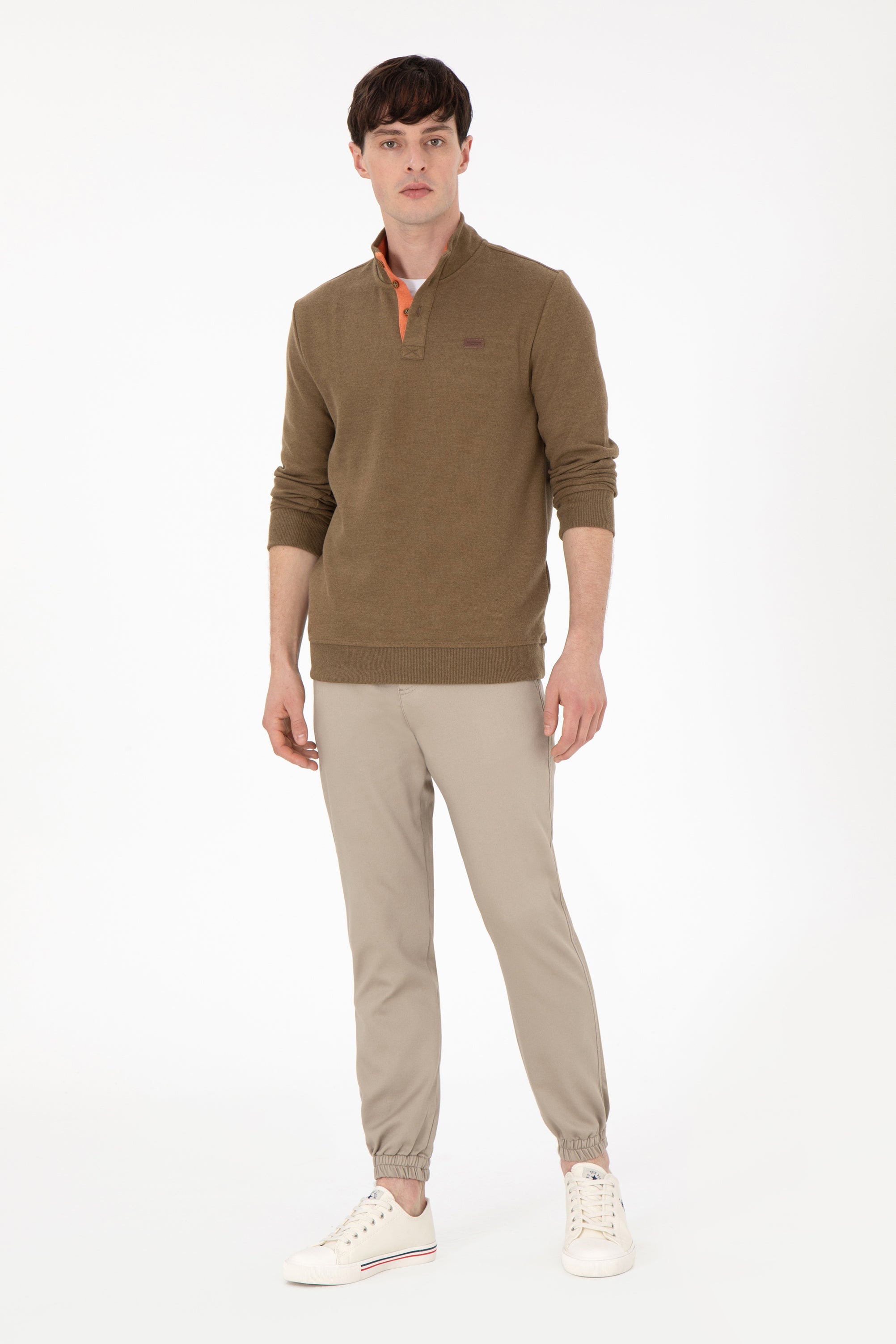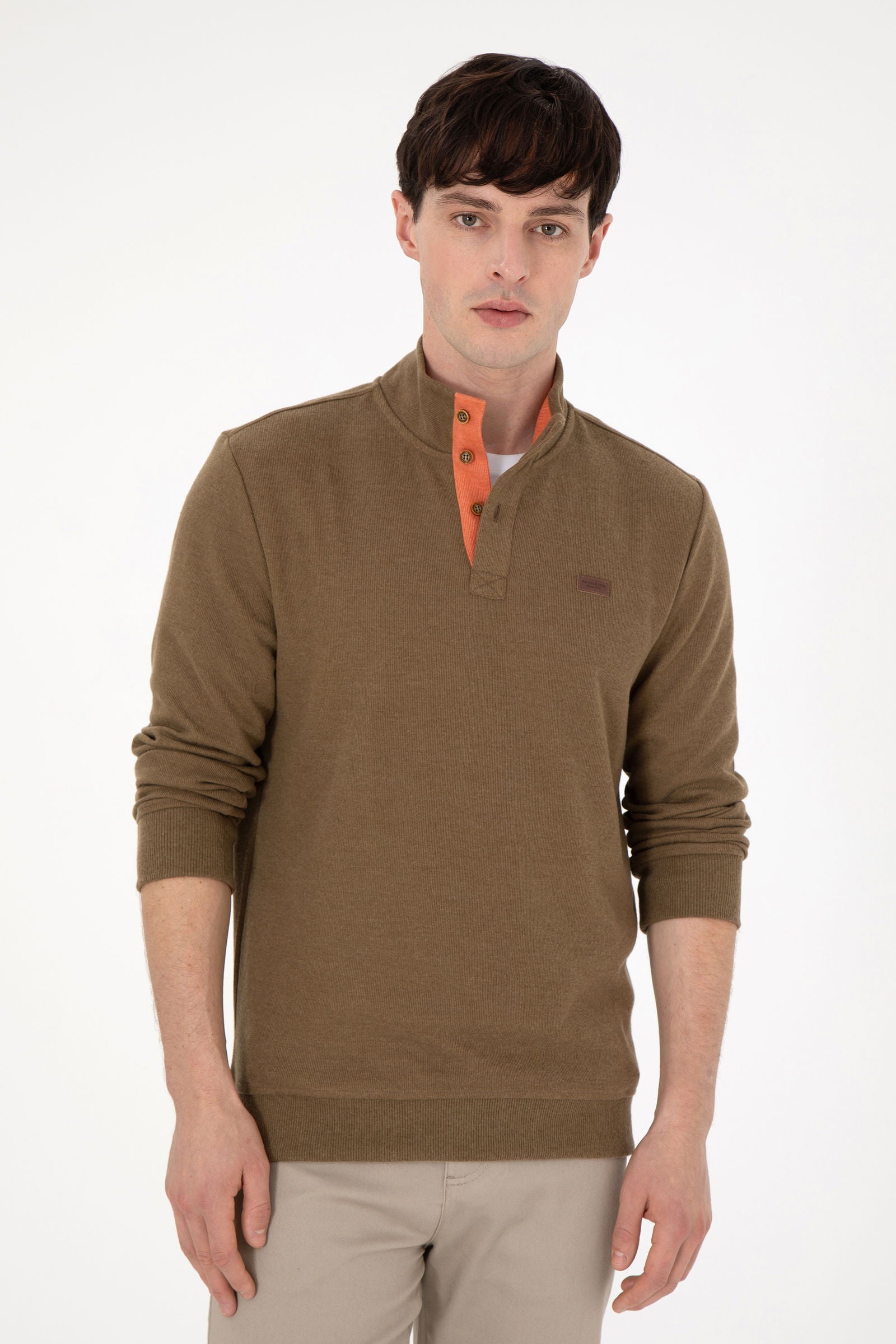 Ova dukserica u elegantnoj maslinastoj boji donosi savršenu kombinaciju udobnosti i stila. Karakteriše je mekani pamuk koji pruža prijatan osjećaj na koži i idealna je za svakodnevno nošenje. Na prednjem dijelu se nalaze diskretni dugmići u kontrastnoj narandžastoj boji koji dodaju zanimljiv detalj, dok je rebrasti rub na rukavima i dnu osiguranje dodatne udobnosti. Ova dukserica je savršen izbor za ležerne kombinacije, bilo da se radi o izlasku sa prijateljima ili opuštenoj šetnji, i lako se može kombinovati sa farmerkama, chinos hlačama ili kratkim hlačama.