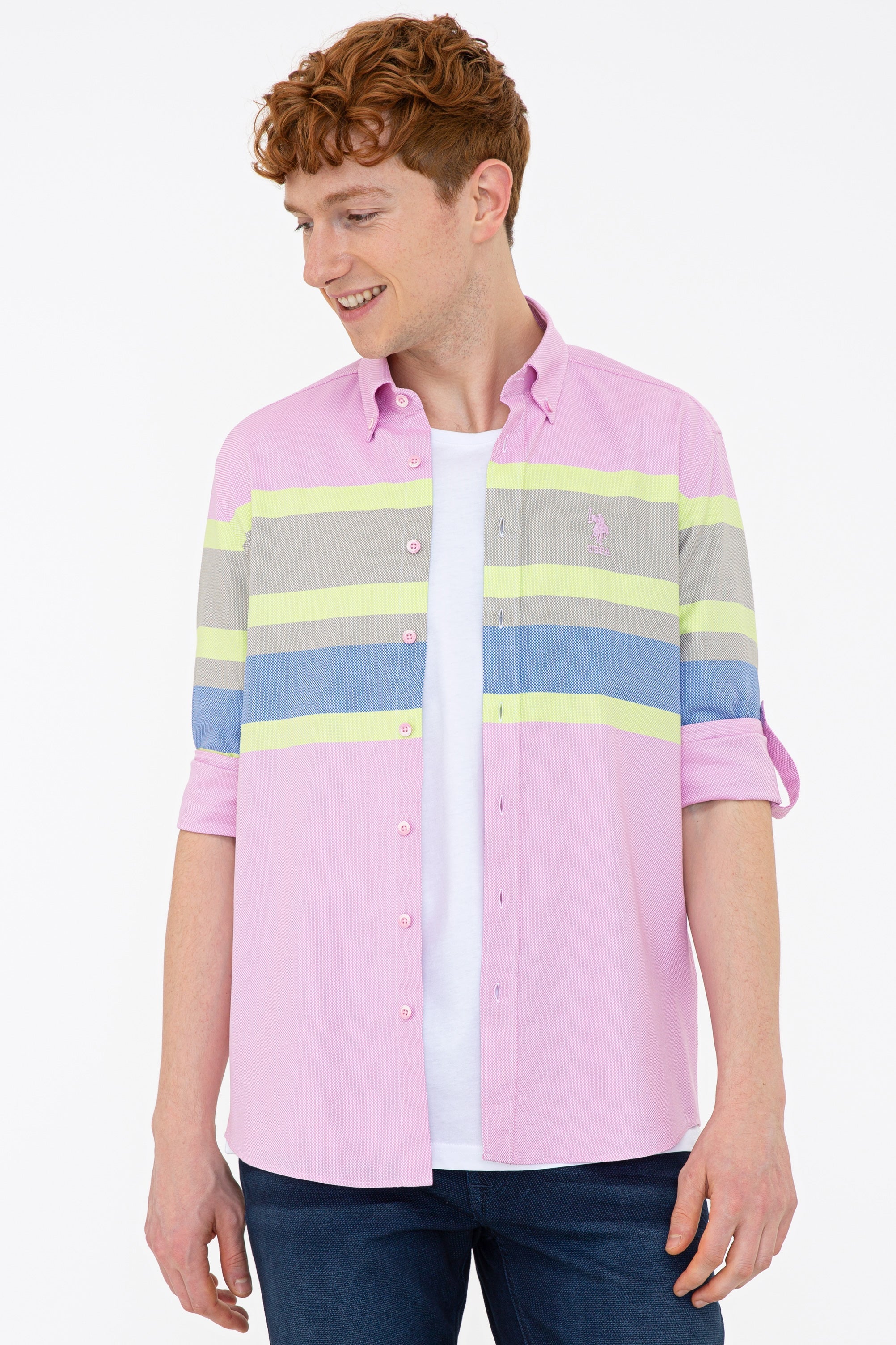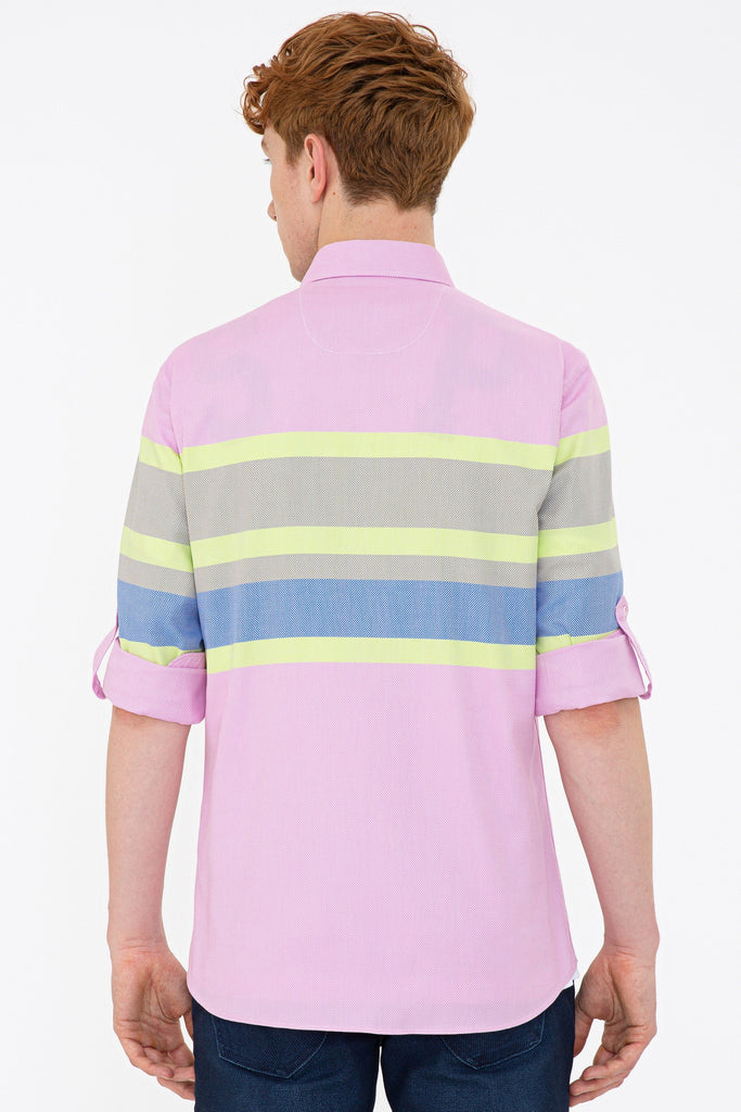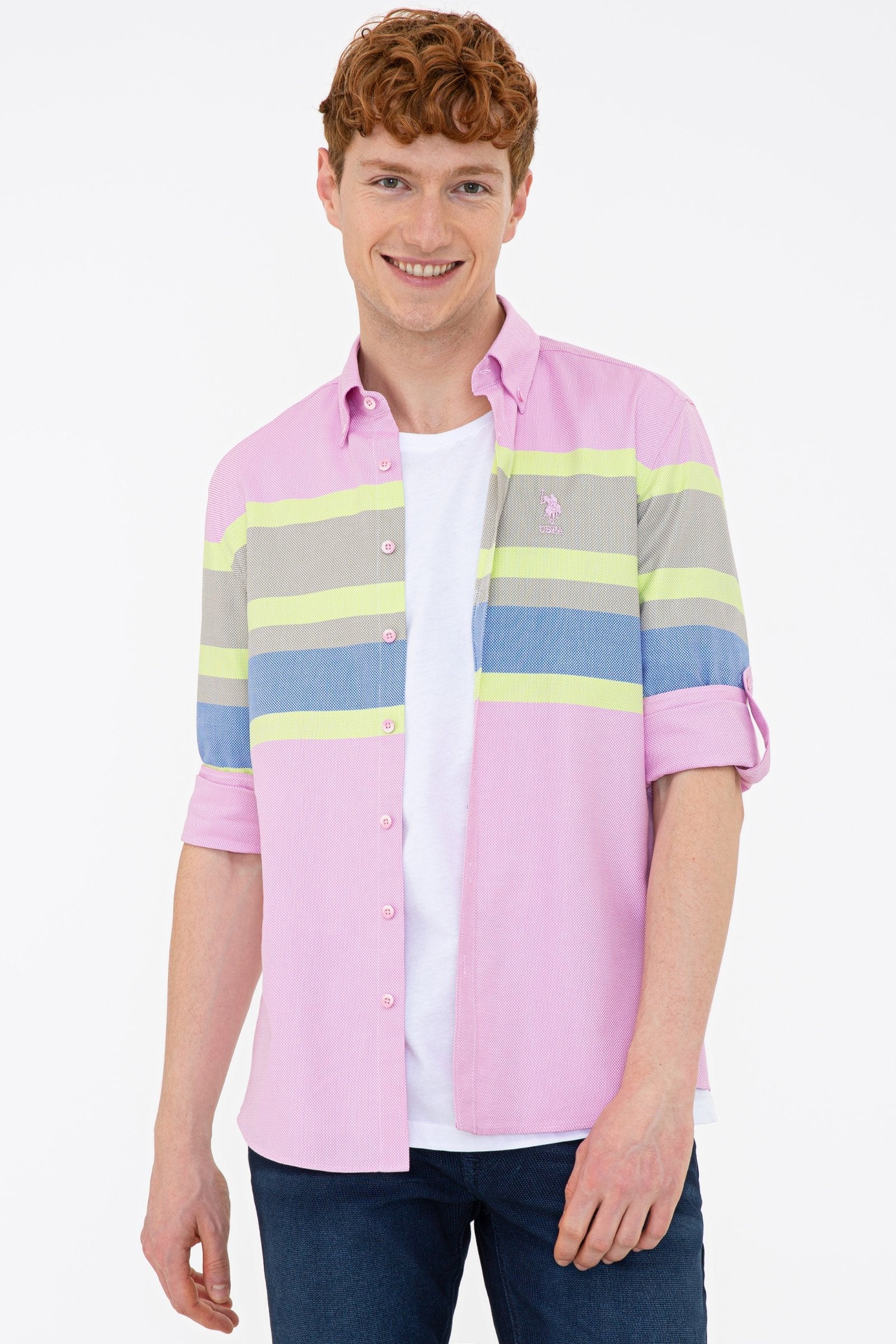Šarmantna košulja u nježnoj roza boji sa šarenim prugama donosi dašak svježine i stila za svaki dan. Karakteriše je kvalitetan materijal koji osigurava udobno nošenje i odličnu prozračnost. Na prednjem dijelu košulje nalazi se diskretan logotip, što dodatno naglašava njen modni identitet. Ova košulja je savršena za razne prilike, bilo da se radi o casual izlasku ili nekim udobnijim dnevnim aktivnostima, a može se lako kombinovati sa farmerkama, kratkim hlačama ili chinos hlačama.