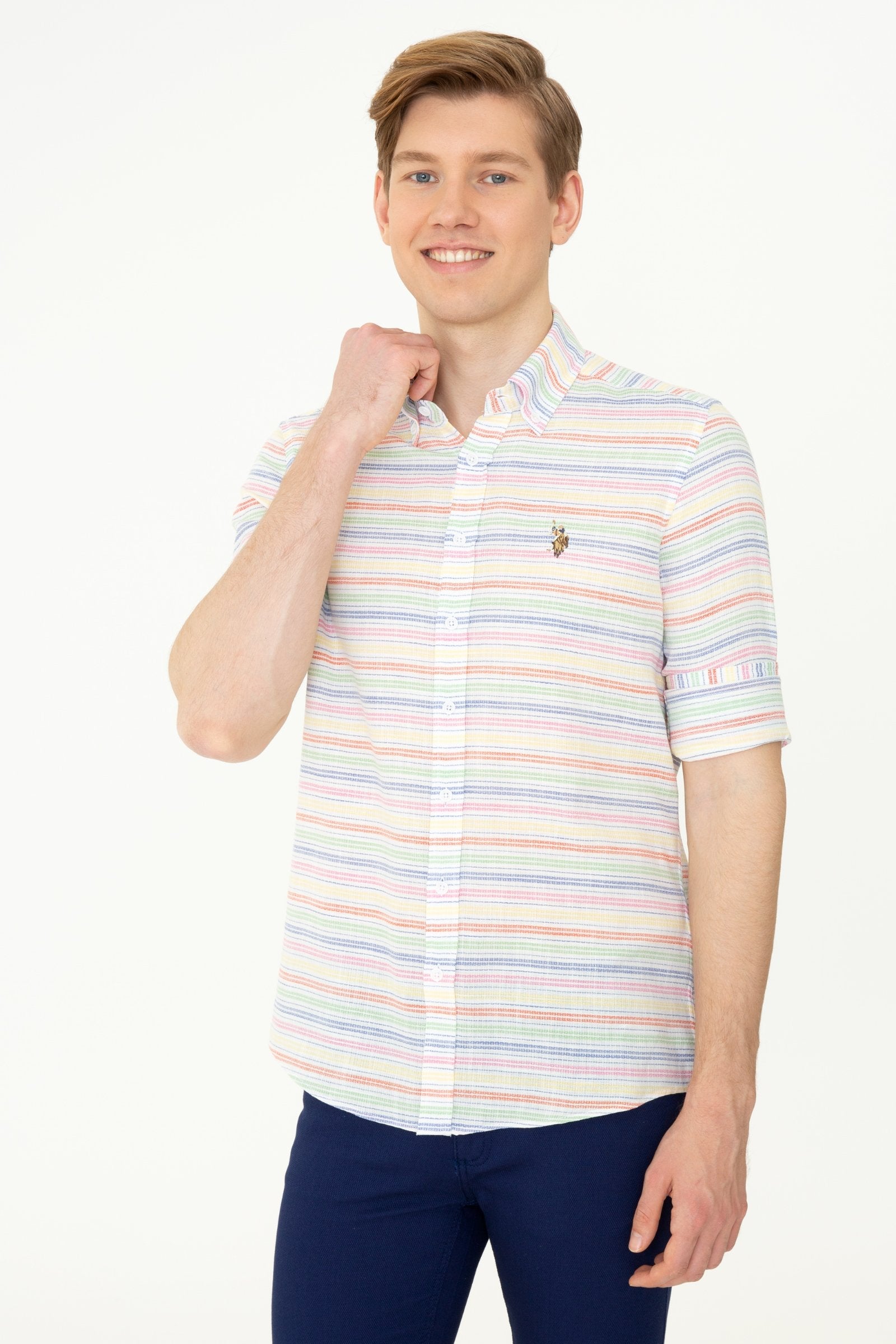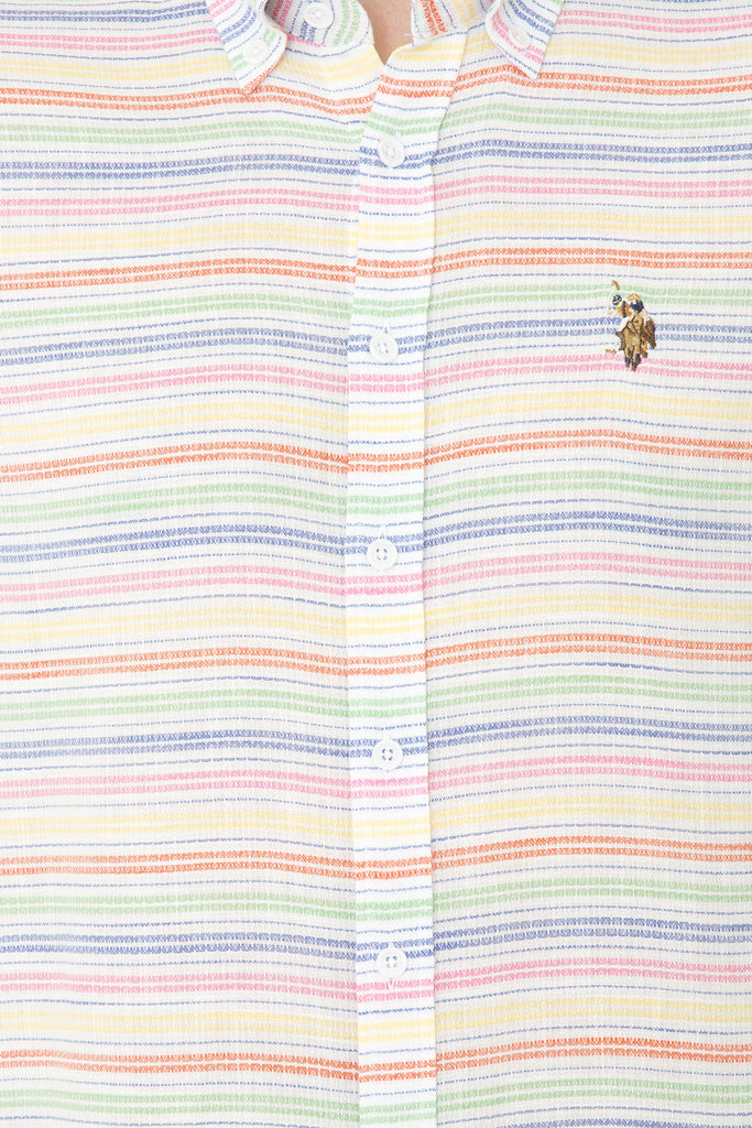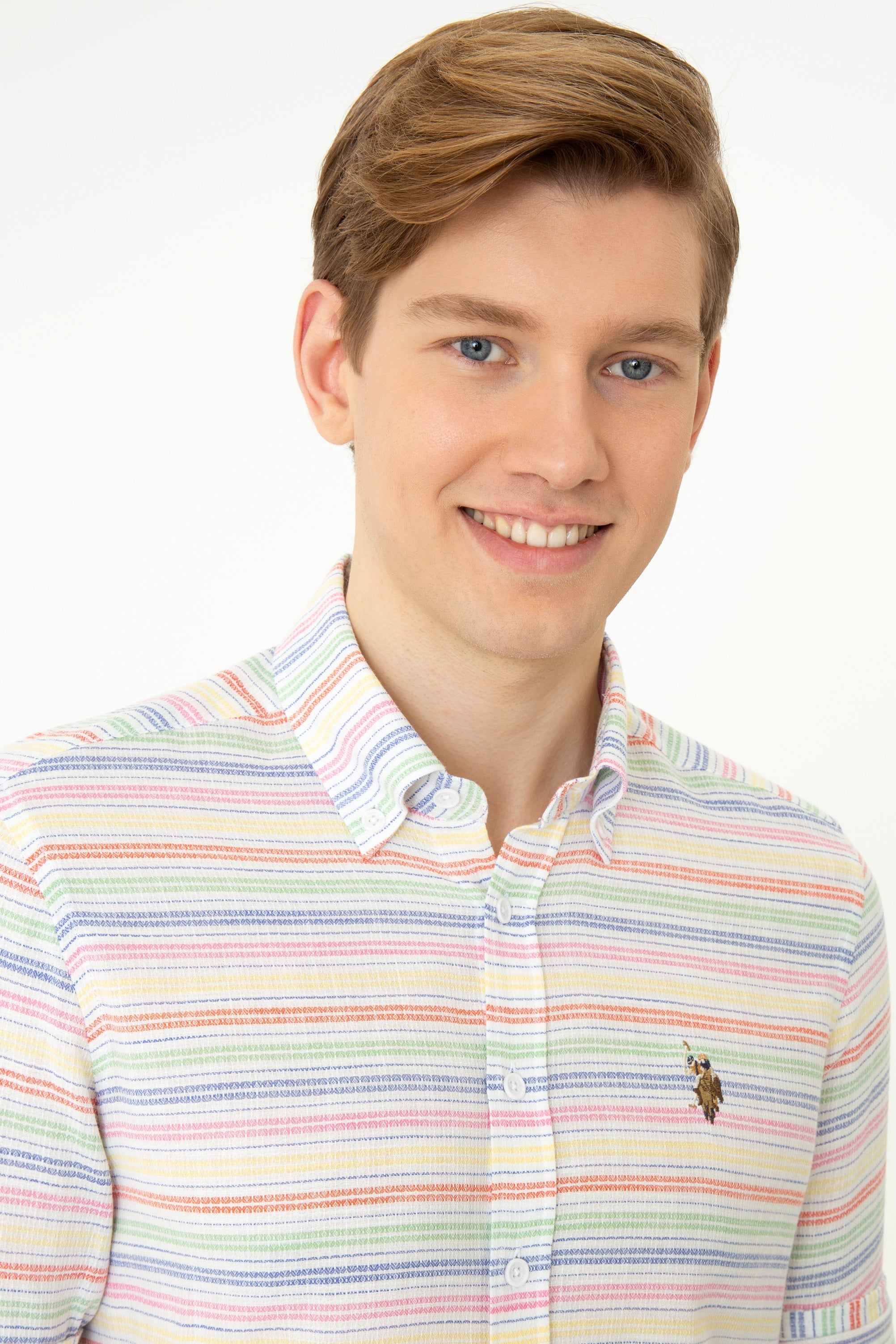 Elegantna košulja sa šarenom prugastom šablonom u pastelno tonovima pruža osvježavajući izgled i udobnost tokom svih godišnjih doba. Karakteriše je lagani materijal koji omogućava prozračnost i lako nošenje. Na prednjem dijelu košulje nalazi se diskretan logo, koji dodaje dašak sofisticiranosti. Ova košulja je savršen izbor za različite prilike, bilo da se radi o poslovnom sastanku ili opuštenom izlasku, a lako se može kombinovati sa pantalonama ili šortsevima za savršen izgled.
