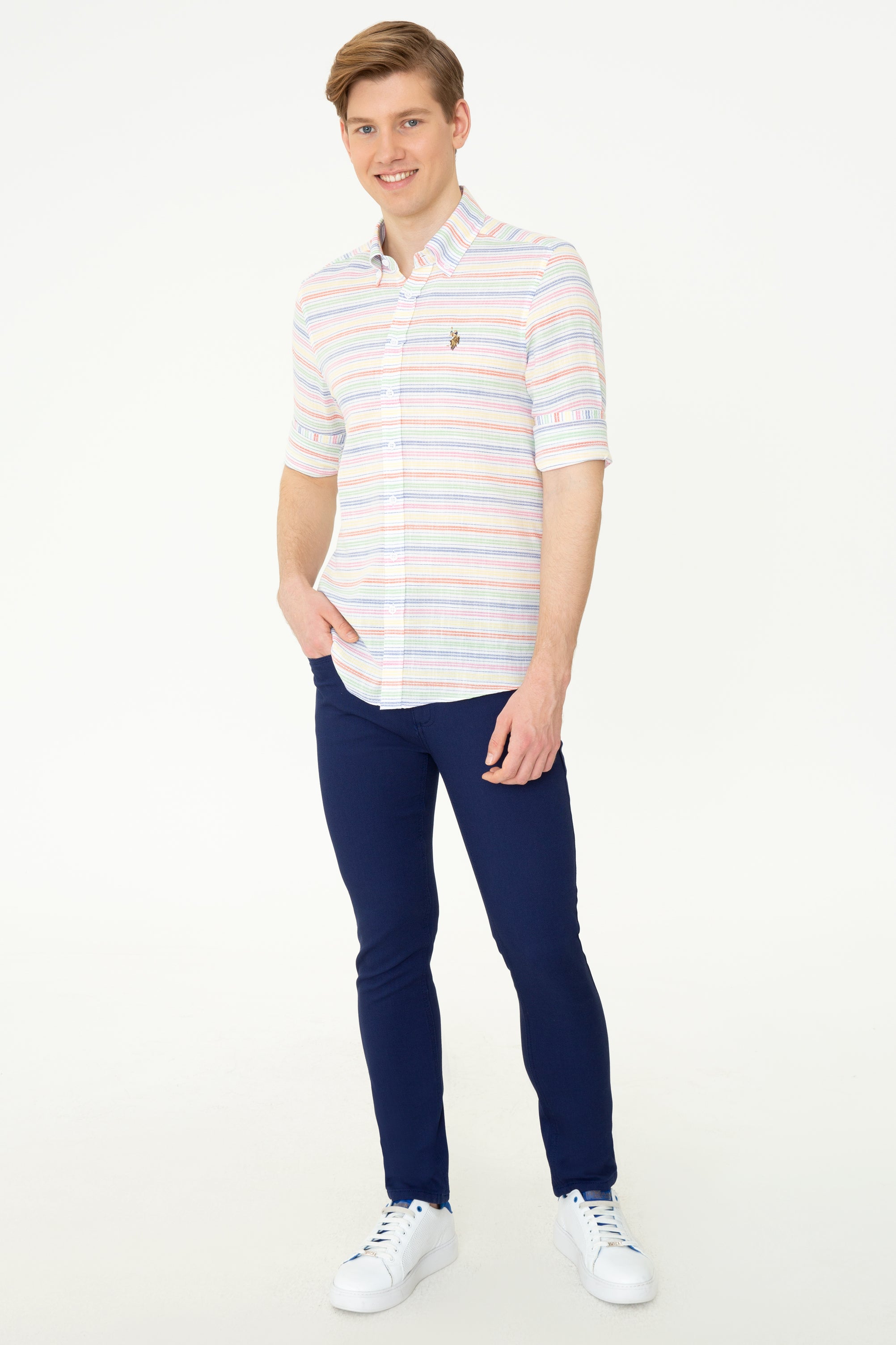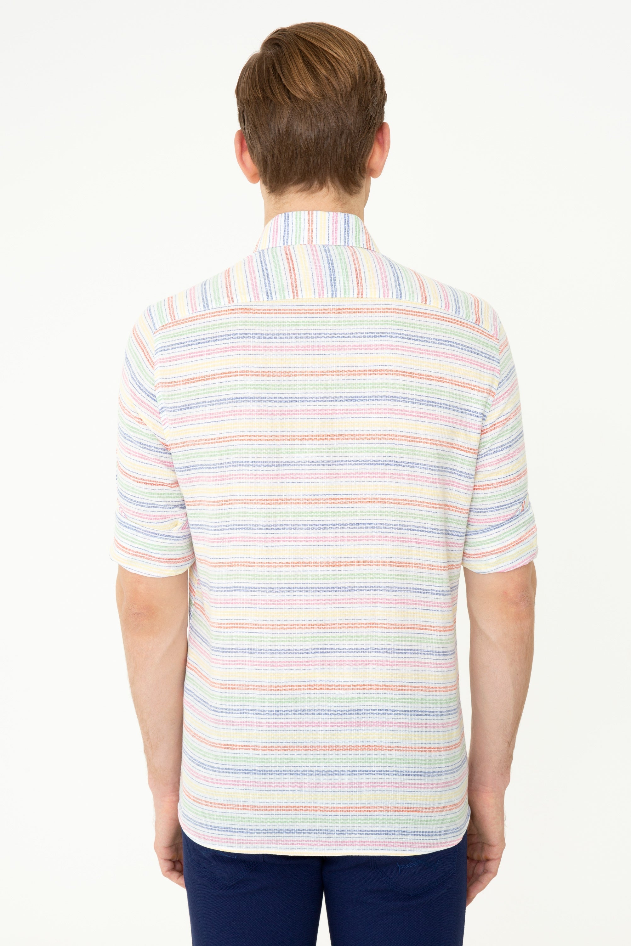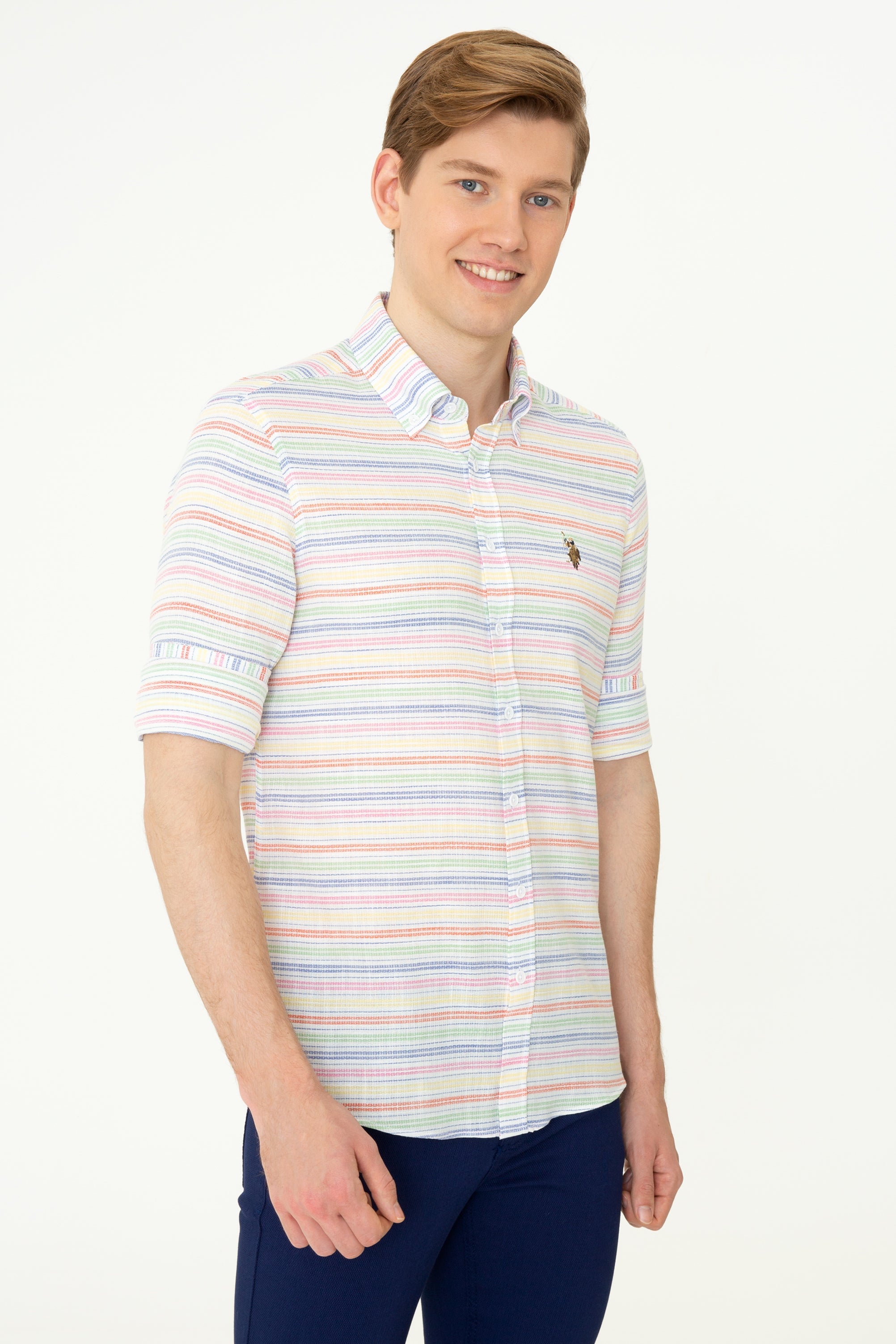 Elegantna košulja sa šarenom prugastom šablonom u pastelno tonovima pruža osvježavajući izgled i udobnost tokom svih godišnjih doba. Karakteriše je lagani materijal koji omogućava prozračnost i lako nošenje. Na prednjem dijelu košulje nalazi se diskretan logo, koji dodaje dašak sofisticiranosti. Ova košulja je savršen izbor za različite prilike, bilo da se radi o poslovnom sastanku ili opuštenom izlasku, a lako se može kombinovati sa pantalonama ili šortsevima za savršen izgled.