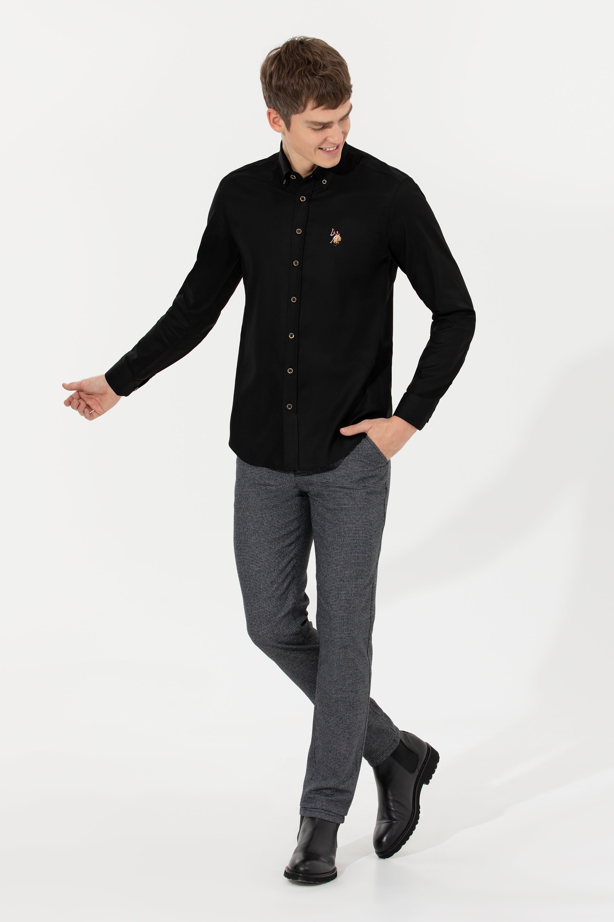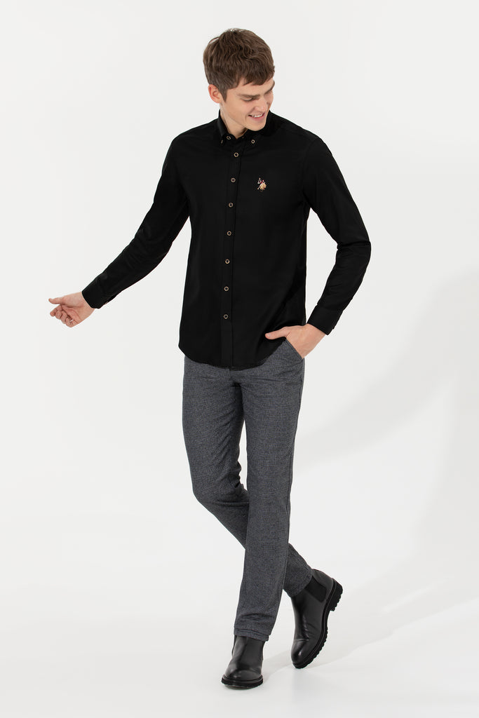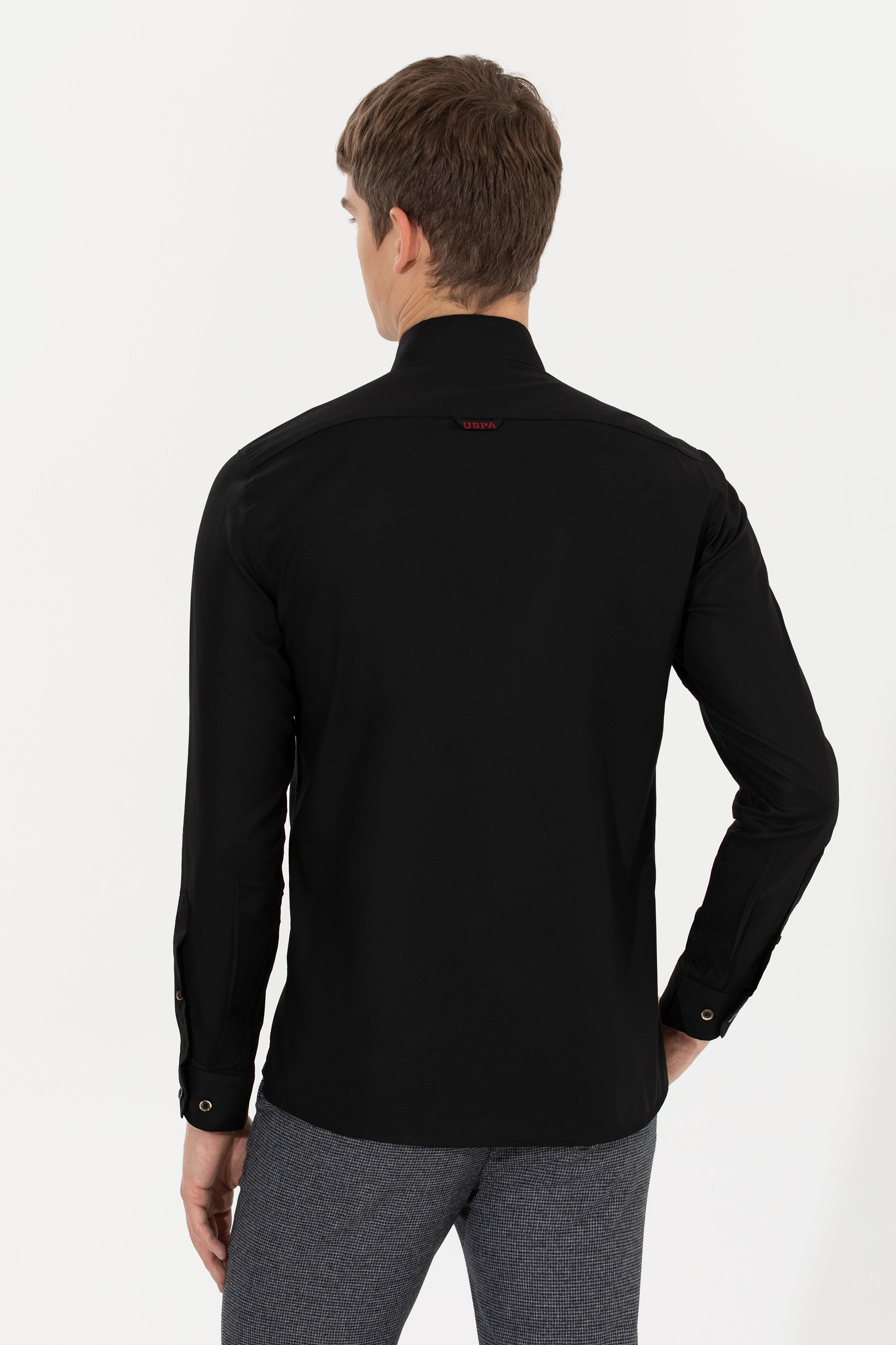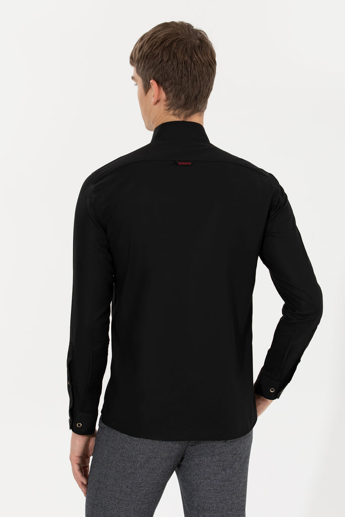 Elegantna košulja u klasičnoj crnoj boji savršena je za razne prilike, pružajući sofisticiranost i stil. Karakteriše je nježna tkanina koja osigurava udobno nošenje i dobro prijanjanje uz tijelo. Na prednjem dijelu košulje nalazi se diskretan ukrasni detalj koji dodaje dozu luksuza. Ova košulja je idealan izbor za poslovne sastanke, večernje izlaske ili opuštene druženja, a može se kombinovati s različitim odjevnim predmetima poput sakoa, hlača ili denim jakni.