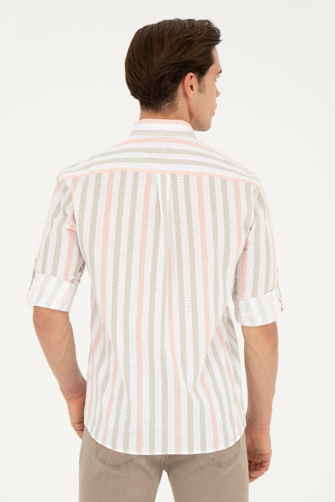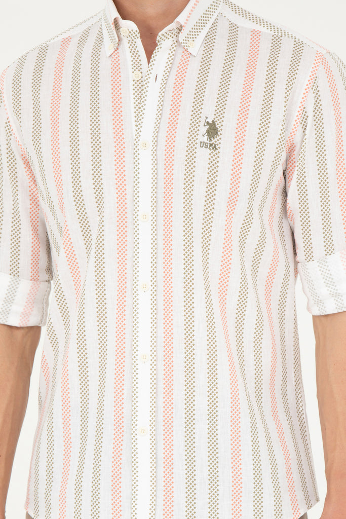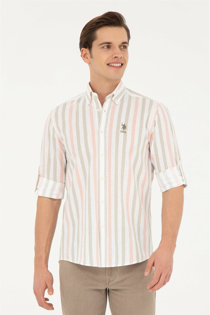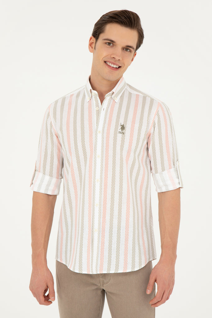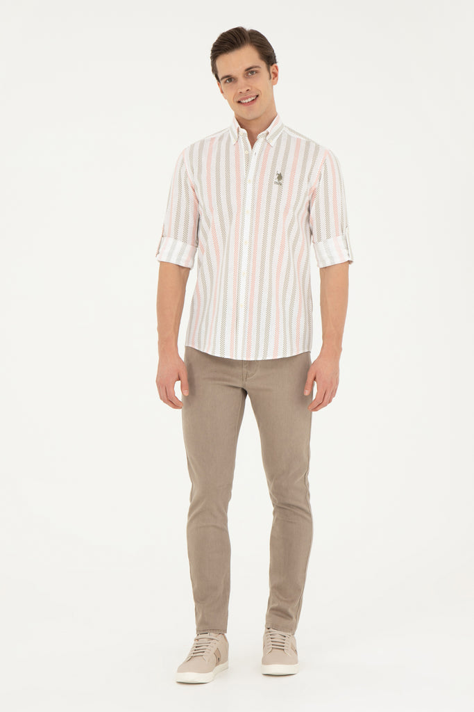 Elegantna košulja sa suptilnim prugastim dezenom u kombinaciji pastelnih tonova donosi dašak svežine i stila za svaku priliku. Karakteriše je lagan i prozračan materijal koji osigurava udobnost tokom cijelog dana, dok klasični kroj omogućava savršeno pristajanje. Na prednjem dijelu košulje nalazi se diskretna aplikacija koja dodaje malo sofisticiranosti. Ova košulja je idealan izbor za poslovne sastanke, ali i opuštene izlaske, i može se lako kombinovati sa raznim hlačama, od klasičnog modela do traperica, te dodatkom poput sakoa ili jakne za zimski look.