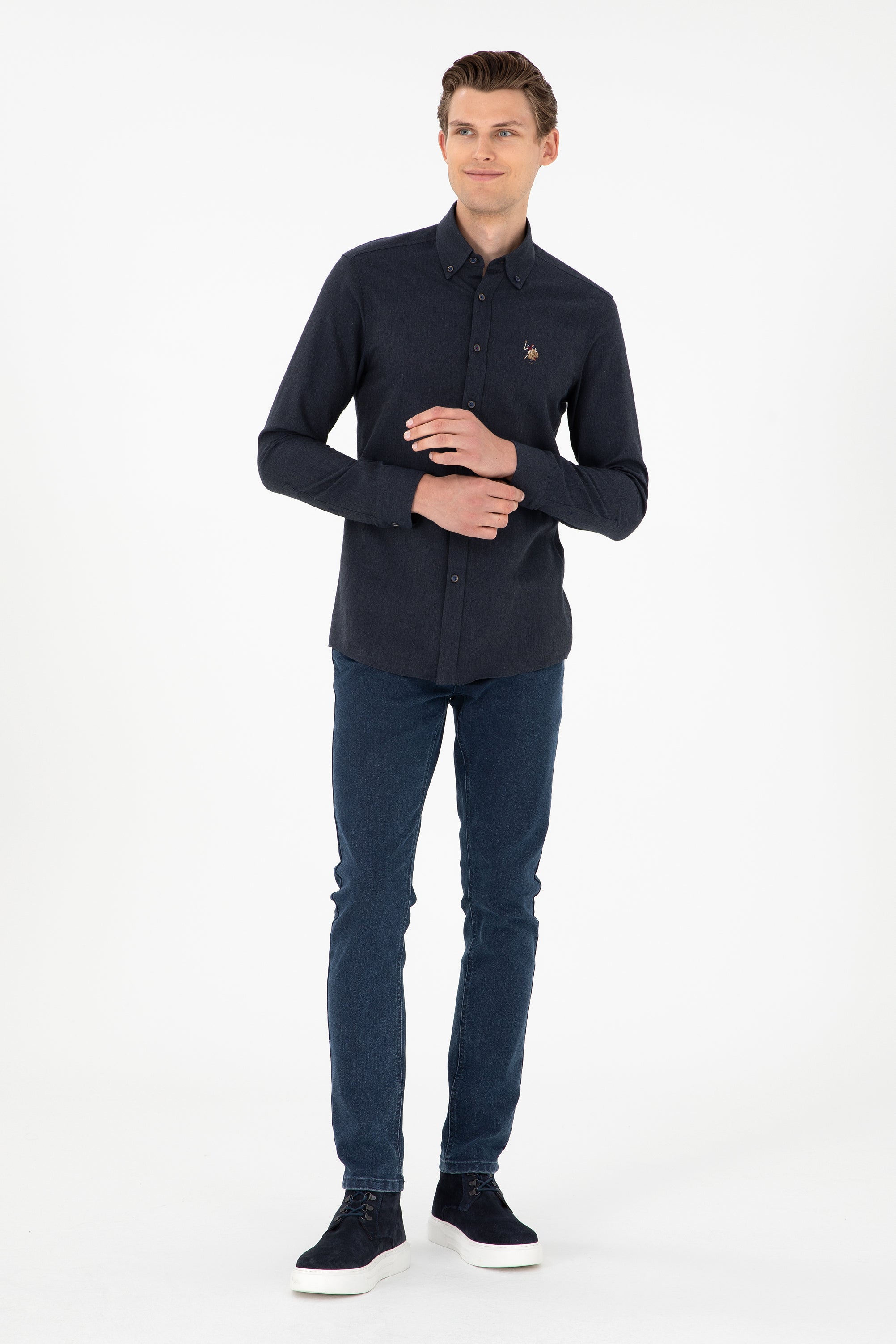 Elegantna košulja u tamnoj nijansi plave boje pruža savršenu kombinaciju stila i udobnosti. Karakteriše je kvalitetna, meka tkanina koja omogućava lako nošenje tokom cijelog dana. Na prednjem dijelu košulje nalazi se diskretan logo koji dodaje dozu sofisticiranosti. Ova košulja je idealna za razne prilike, bilo da se radi o poslovnom sastanku ili opuštenom izlasku s prijateljima, a može se kombinovati s različitim stilovima poput odijela, traperica ili hlača.