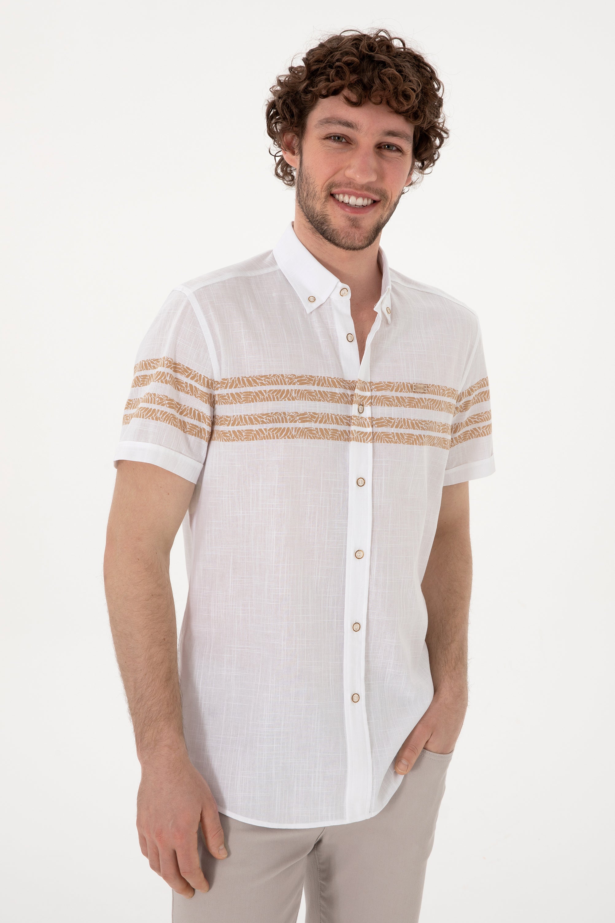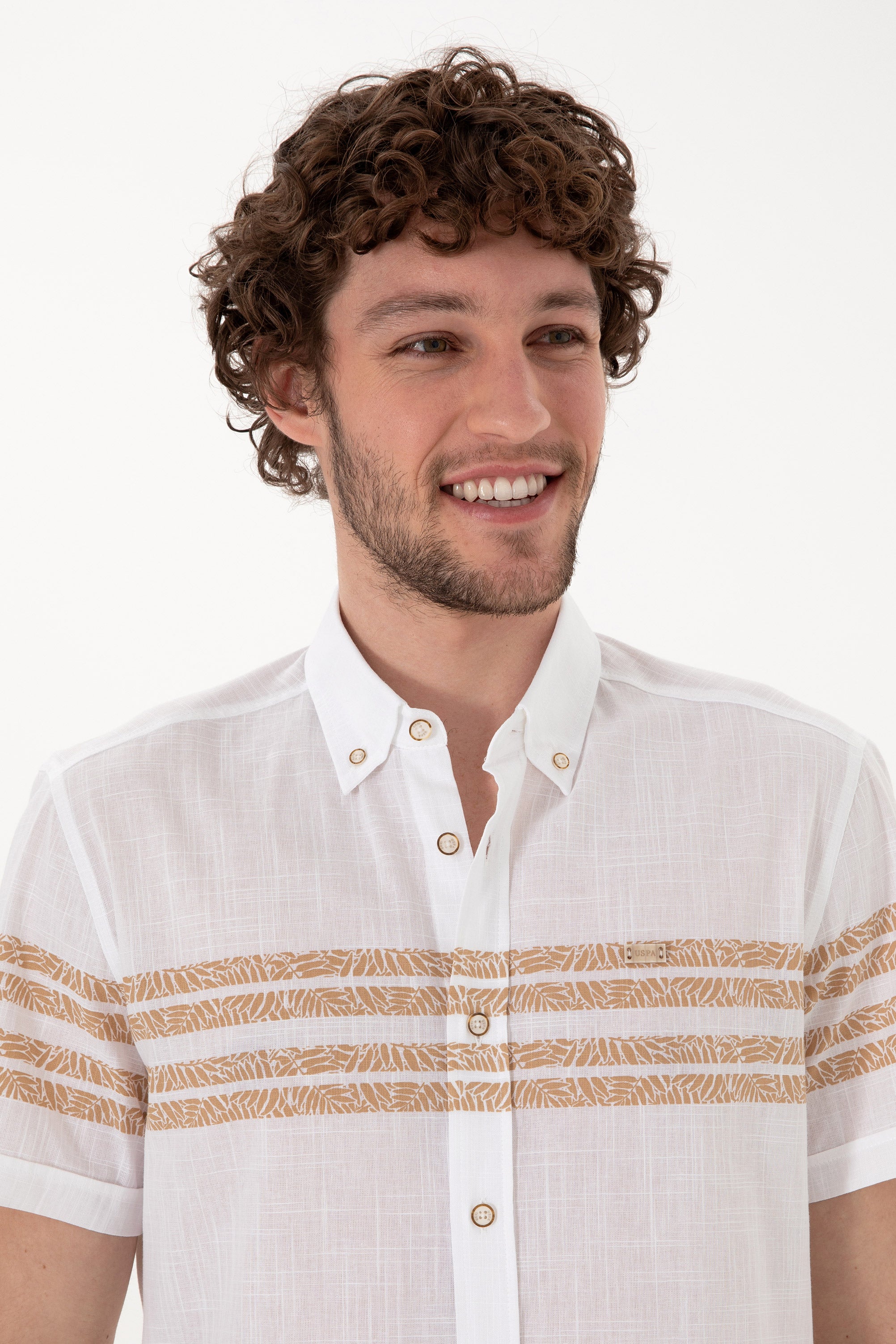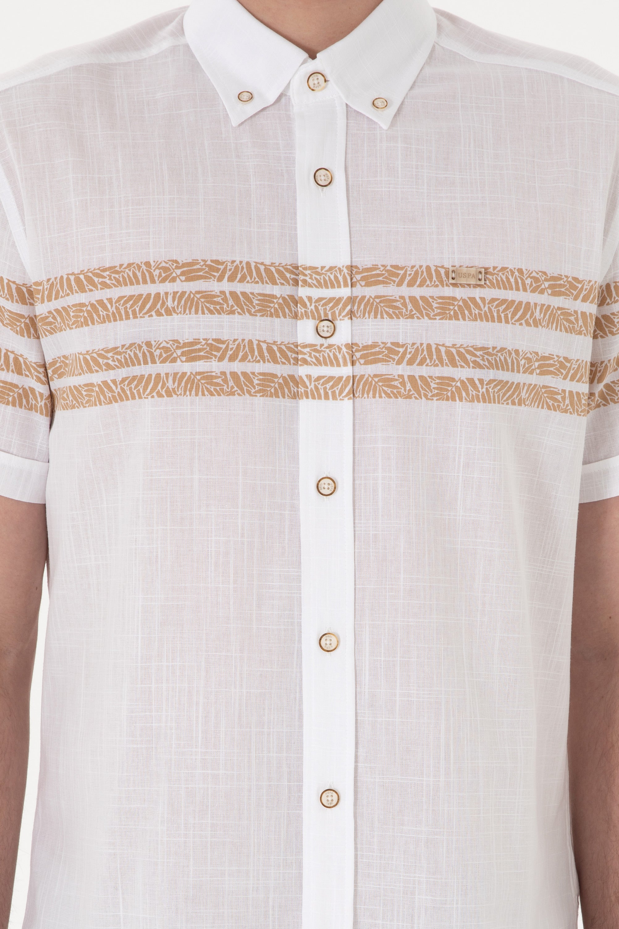 Elegantna košulja od laganog materijala u klasičnoj bijeloj boji donosi svježinu i sofisticiranost tokom toplih dana. Karakterišu je suptilni detalji u obliku traka u bež boji koje dodaju modernu notu, dok klasičan kroj osigurava udobno nošenje i savršeno pristajanje. Ova košulja je savršen izbor za različite prilike, bilo da se radi o poslovnom sastanku ili ležernom izlasku s prijateljima, a lako se može kombinovati s kratkim hlačama, trapericama ili elegantnim hlačama za savršen izgled.