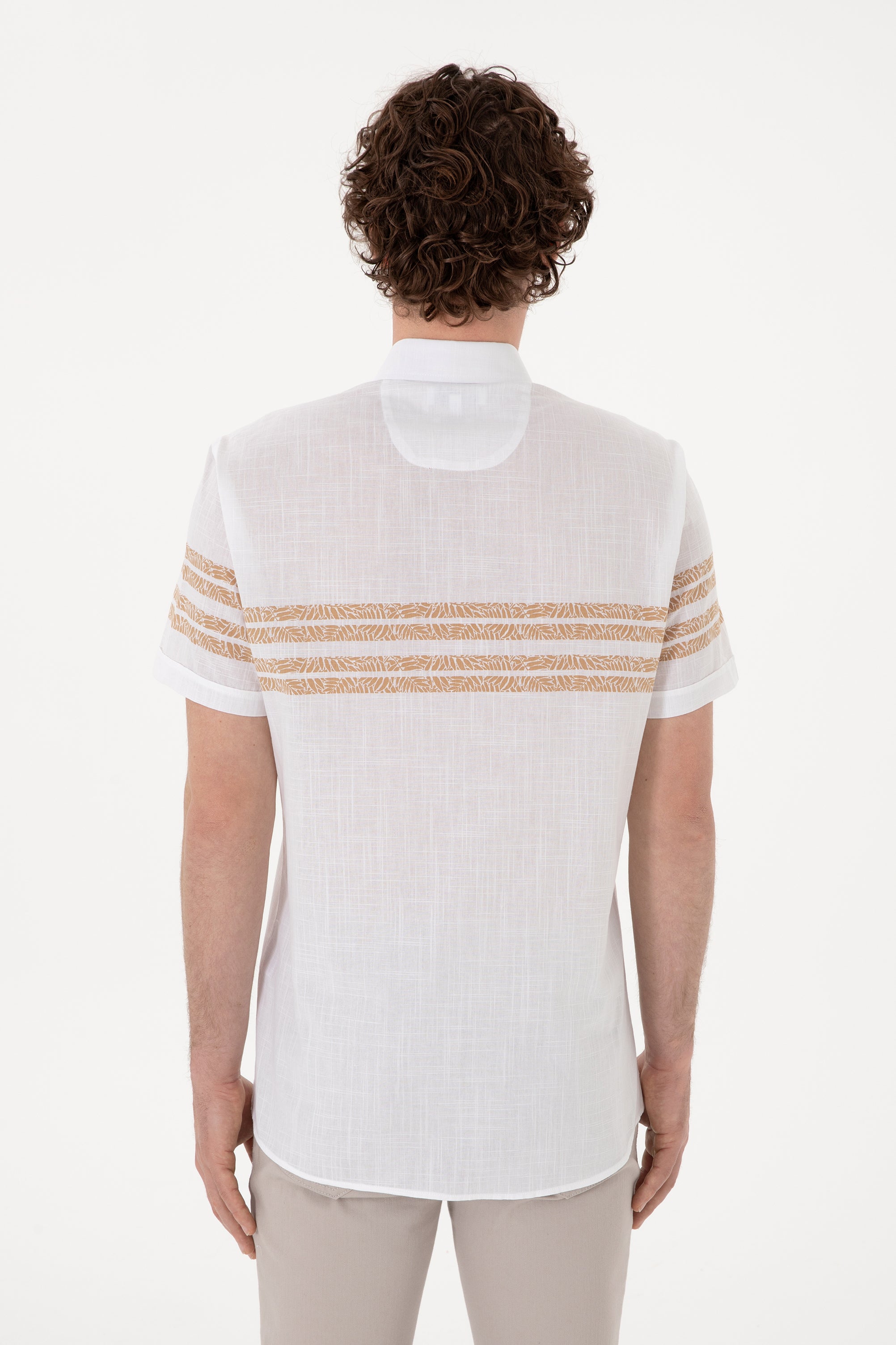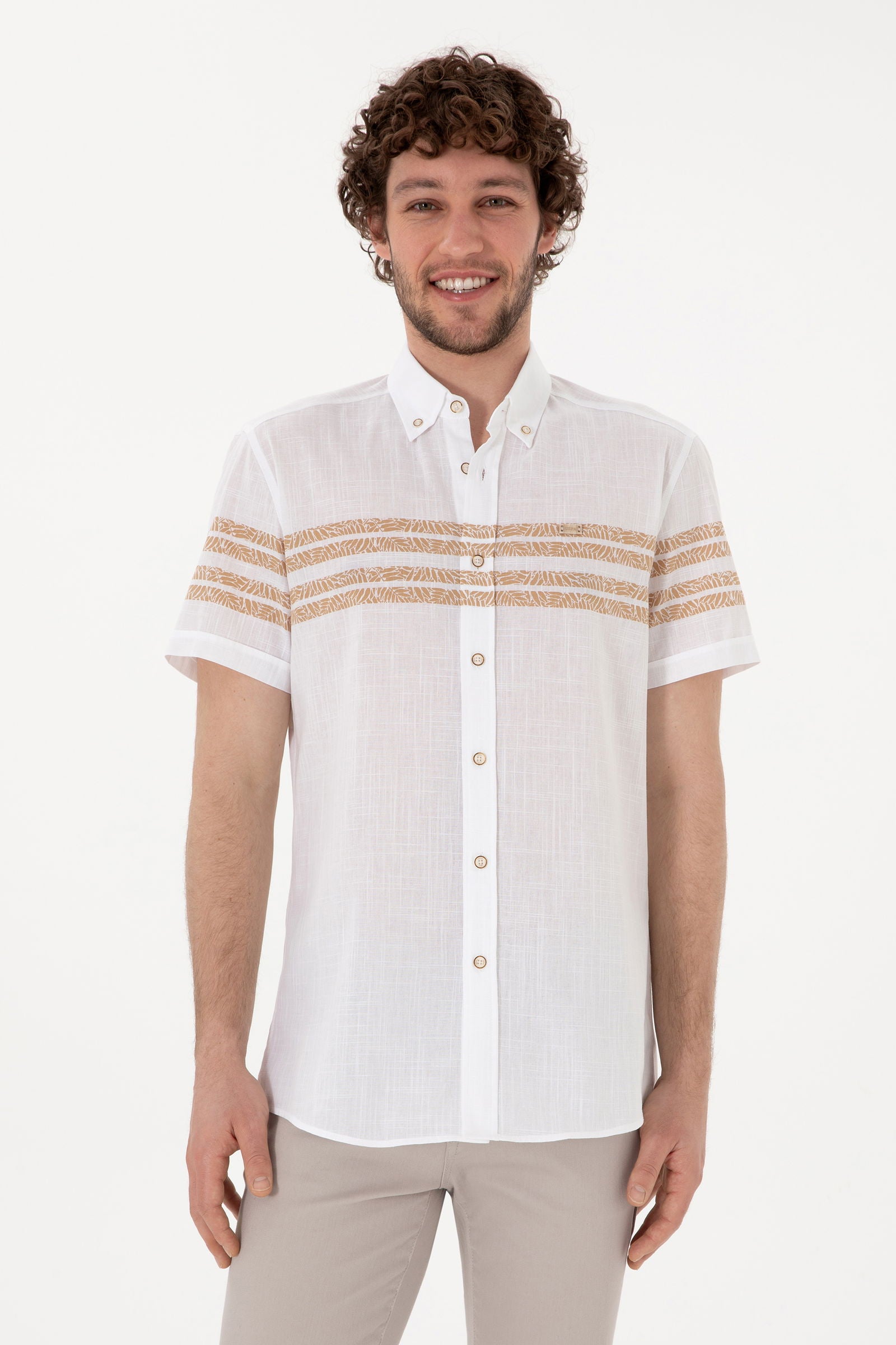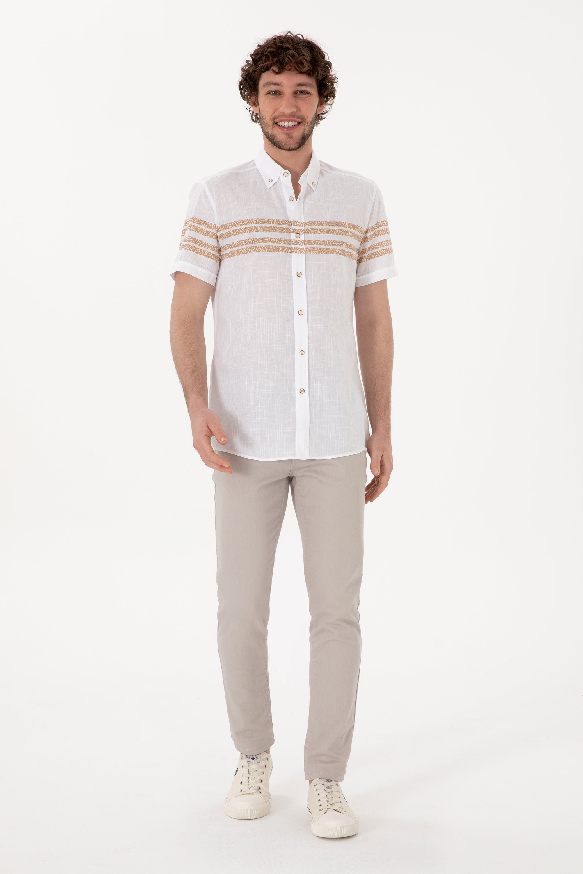 Elegantna košulja od laganog materijala u klasičnoj bijeloj boji donosi svježinu i sofisticiranost tokom toplih dana. Karakterišu je suptilni detalji u obliku traka u bež boji koje dodaju modernu notu, dok klasičan kroj osigurava udobno nošenje i savršeno pristajanje. Ova košulja je savršen izbor za različite prilike, bilo da se radi o poslovnom sastanku ili ležernom izlasku s prijateljima, a lako se može kombinovati s kratkim hlačama, trapericama ili elegantnim hlačama za savršen izgled.
