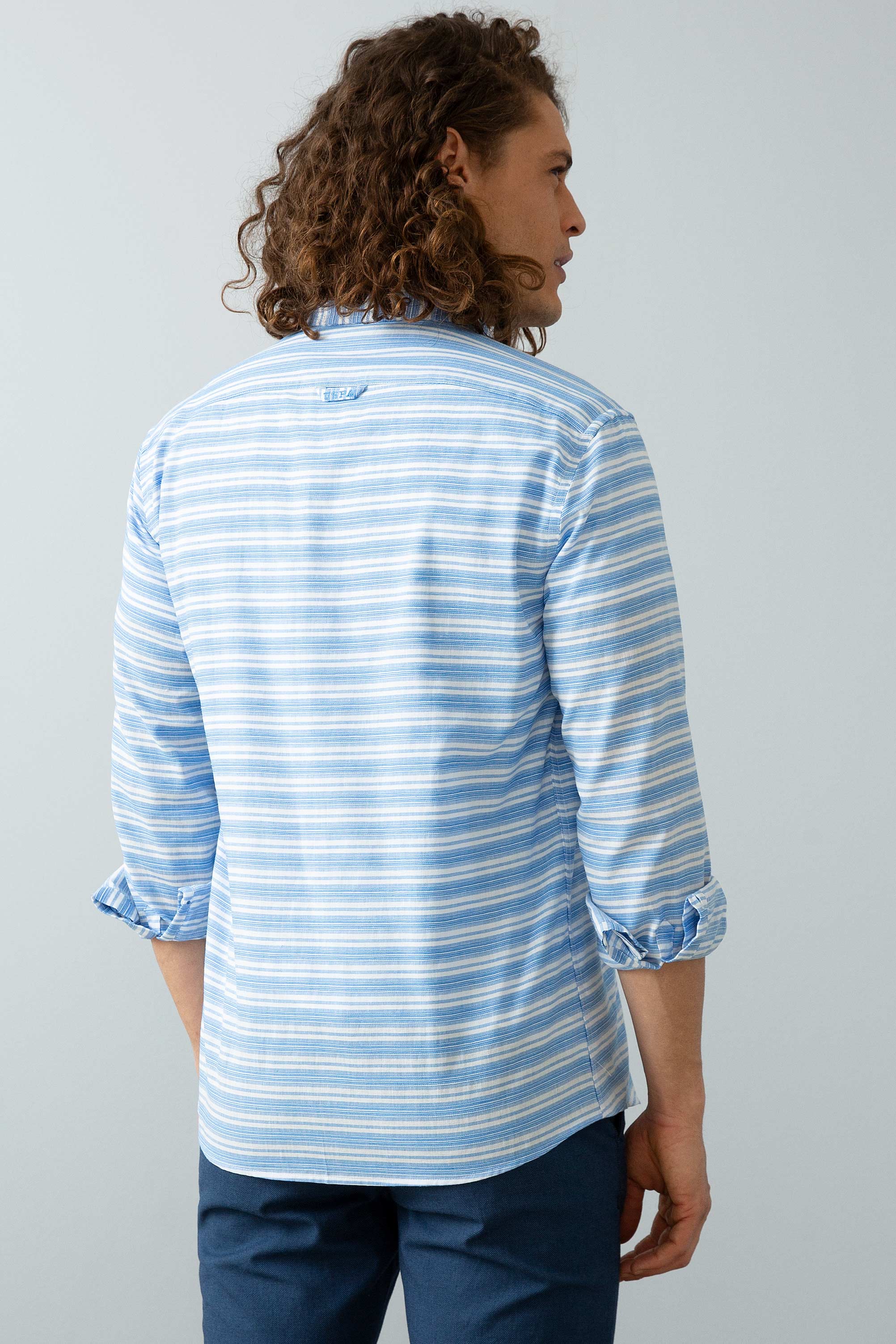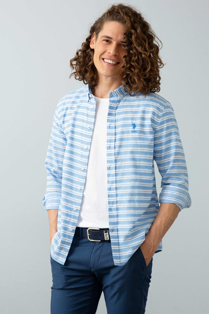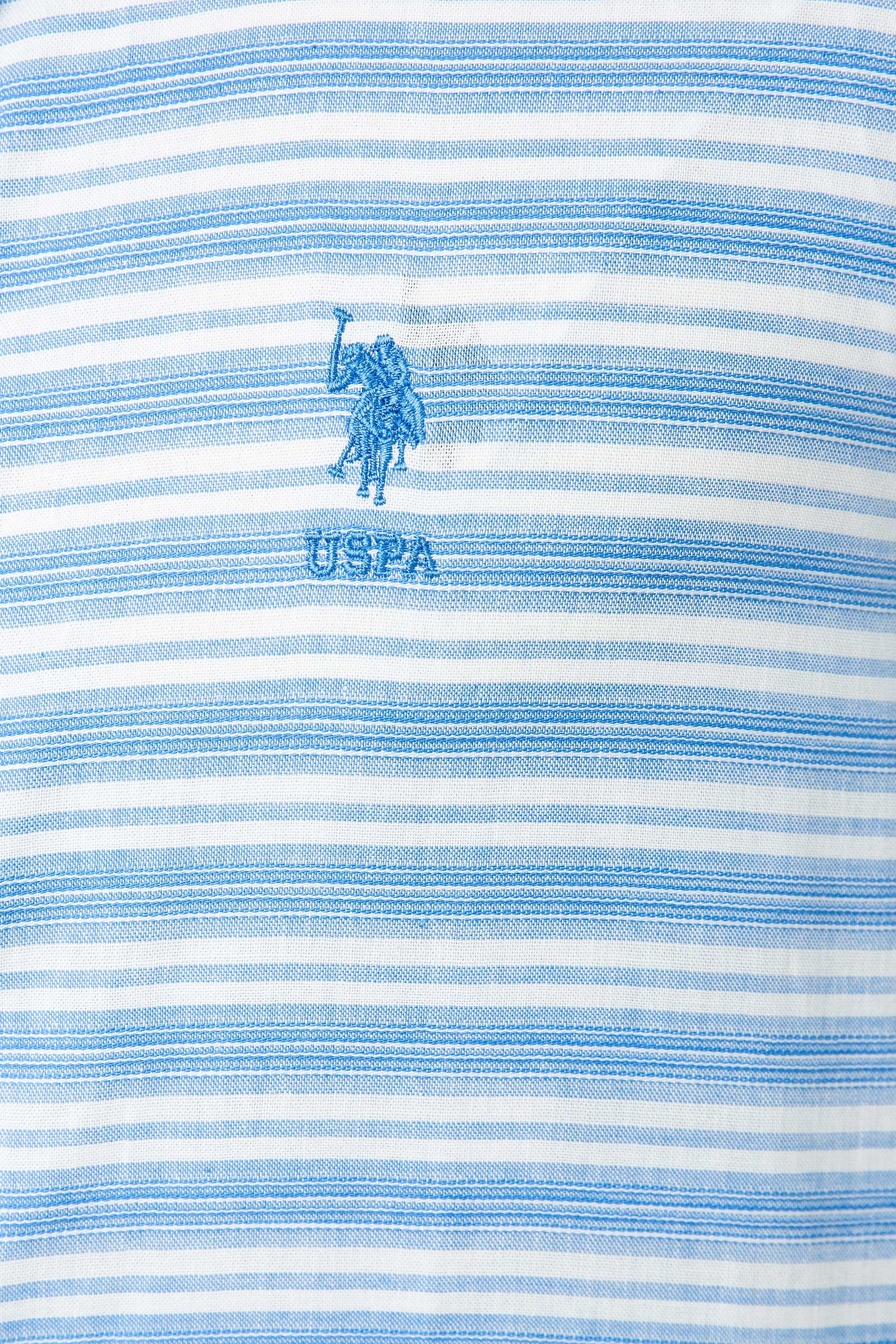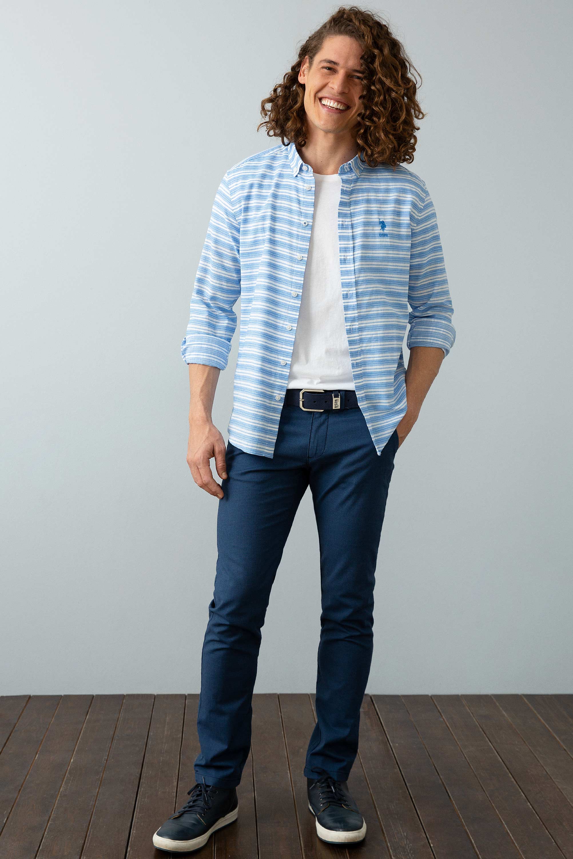 Ova košulja u svijetloplavoj boji sa suptilnim prugama donosi svježinu i stil u svakodnevne kombinacije. Karakteriše je lagani pamuk koji omogućava prozračnost i udobnost tokom čitavog dana. Na prednjem dijelu košulje nalazi se diskretni logo, koji dodaje dašak sofisticiranosti. Idealna je za neformalne prigode, bilo da se radi o izlasku s prijateljima ili ležernom danu na poslu, a može se savršeno kombinovati sa farmerkama, chinos hlačama ili šortsevima.