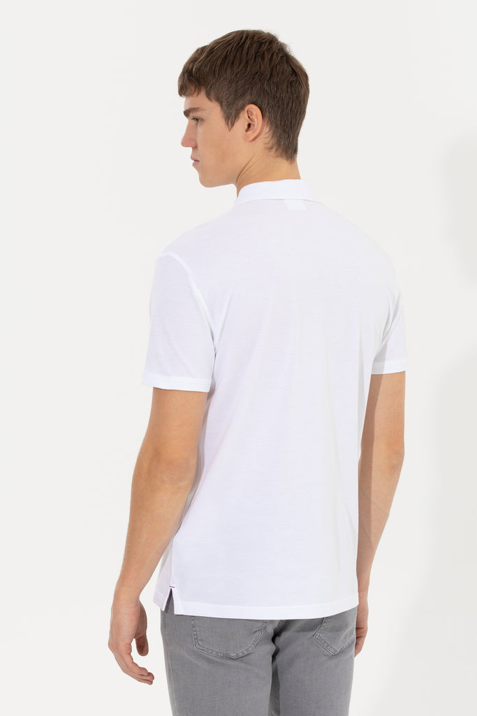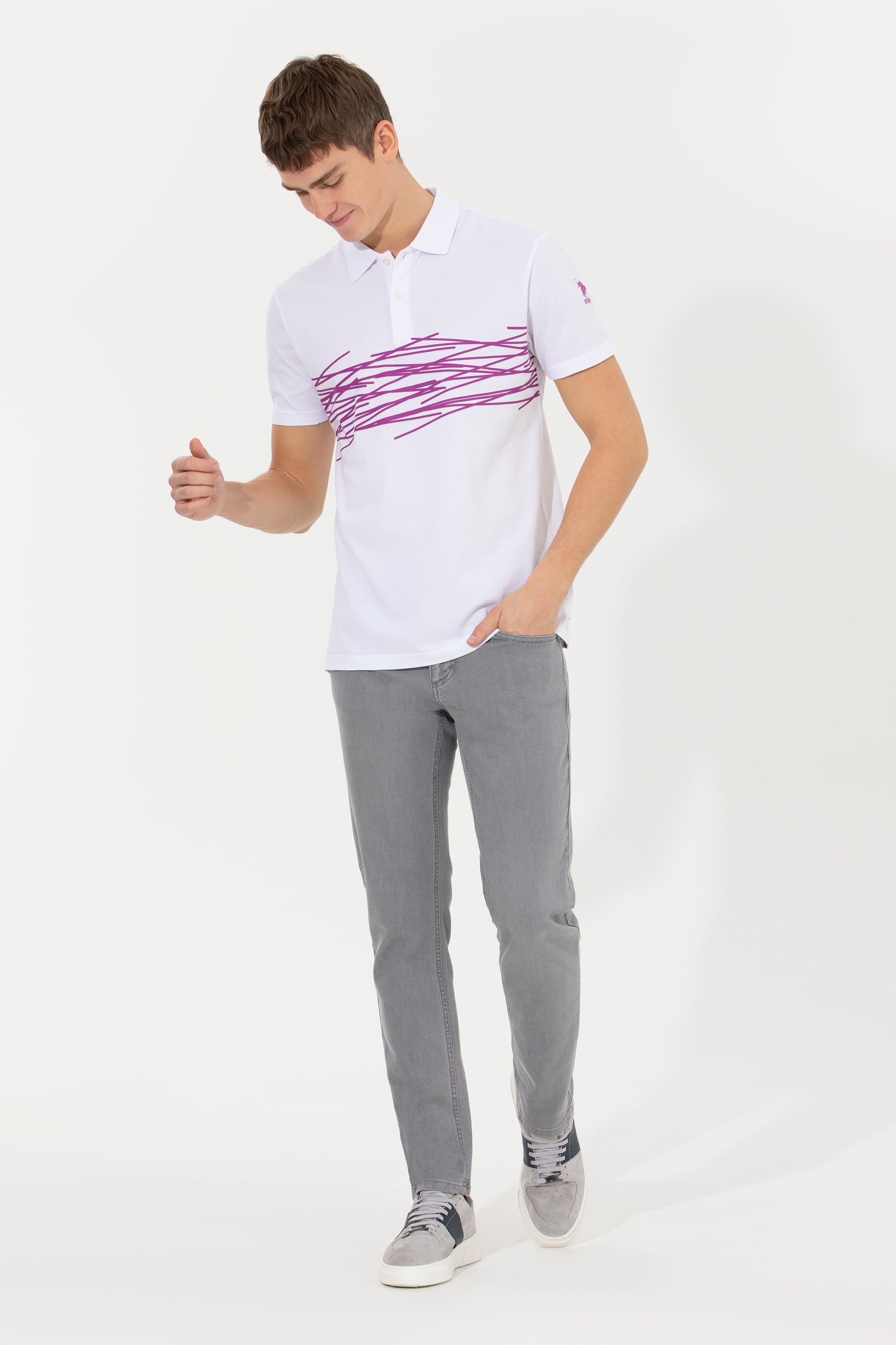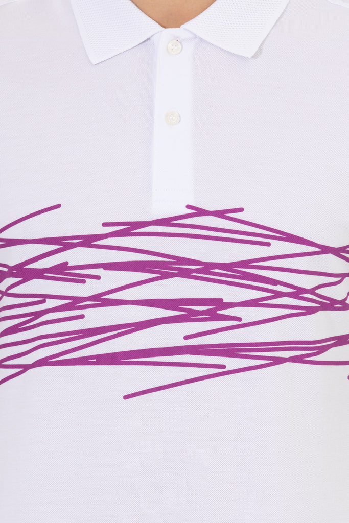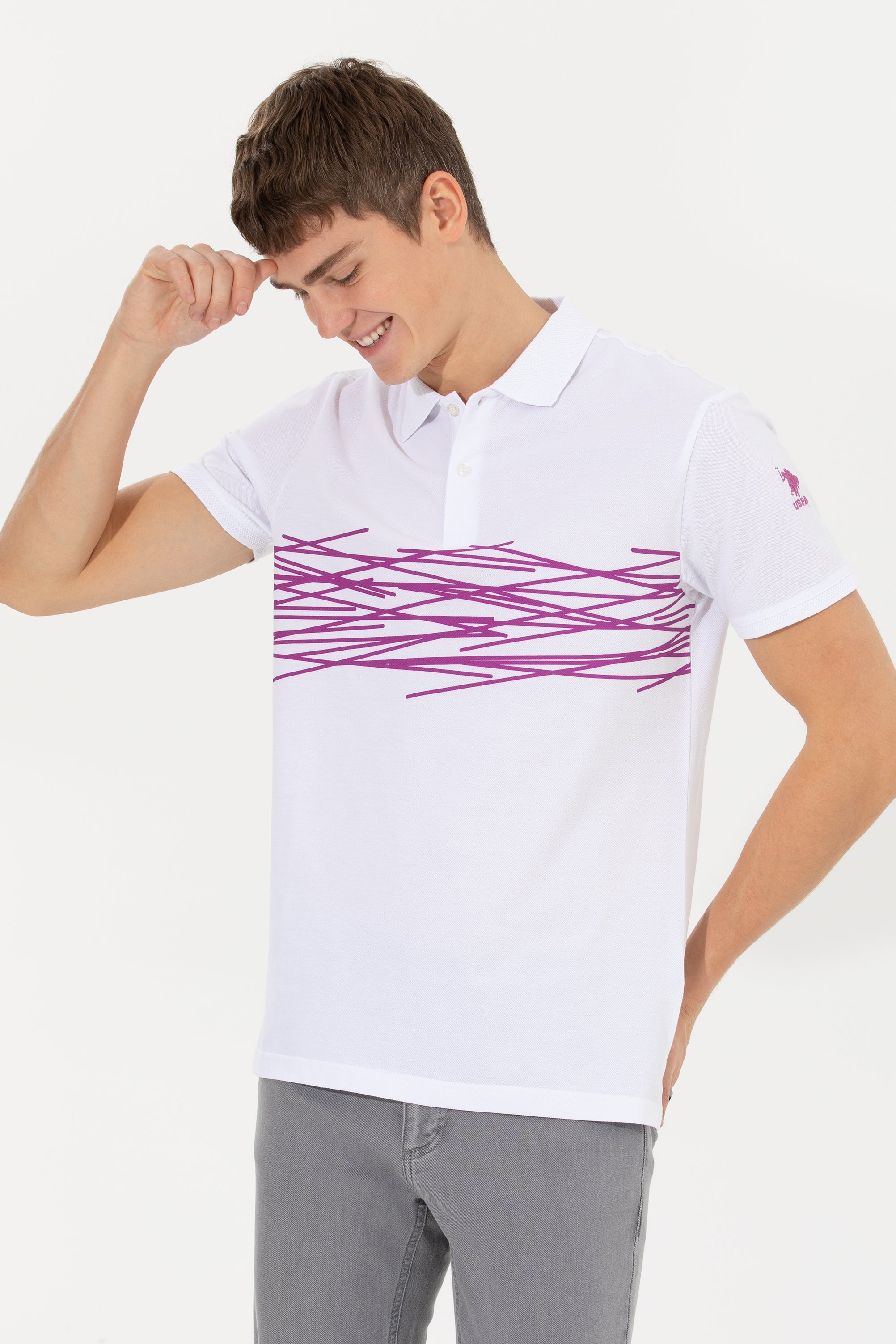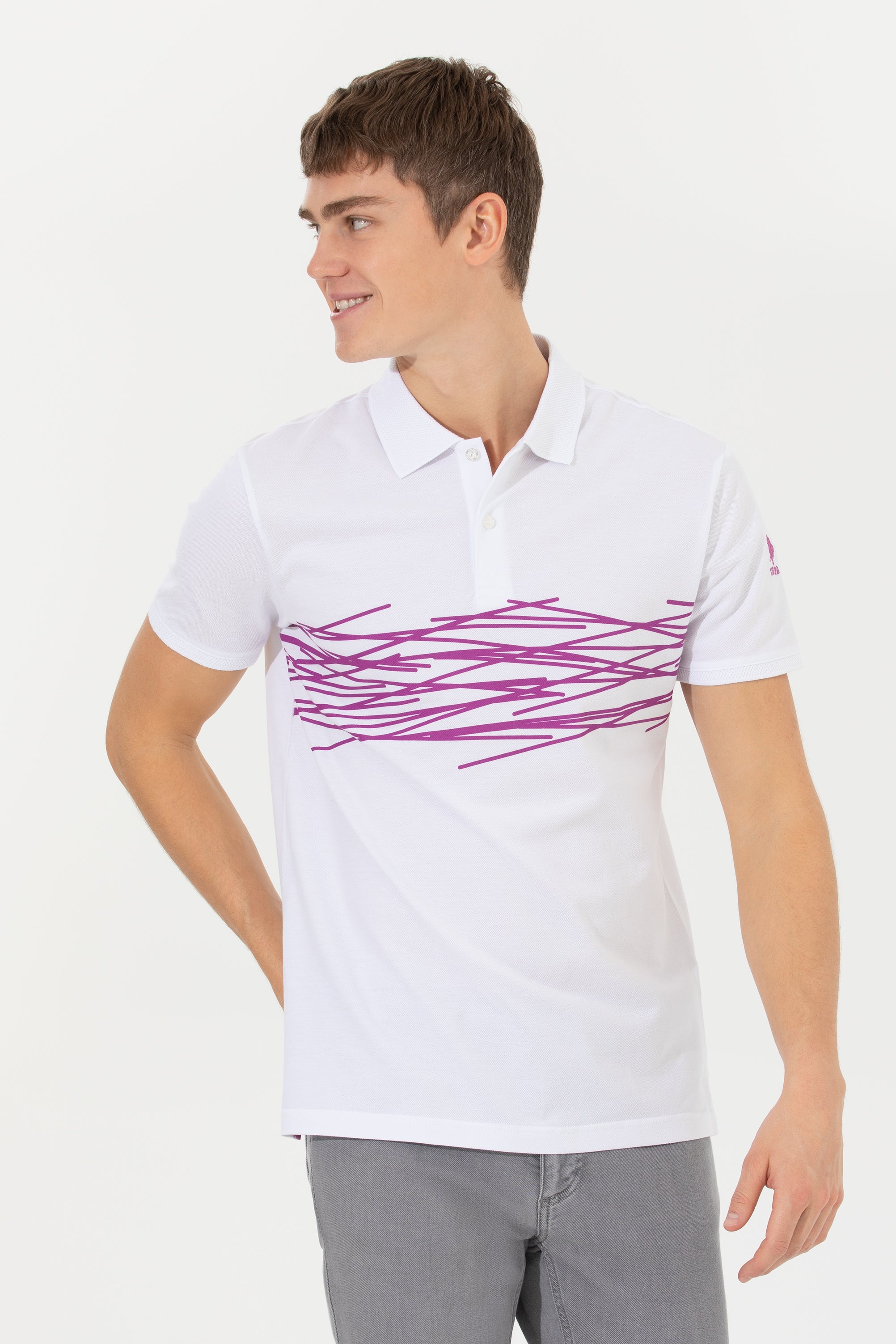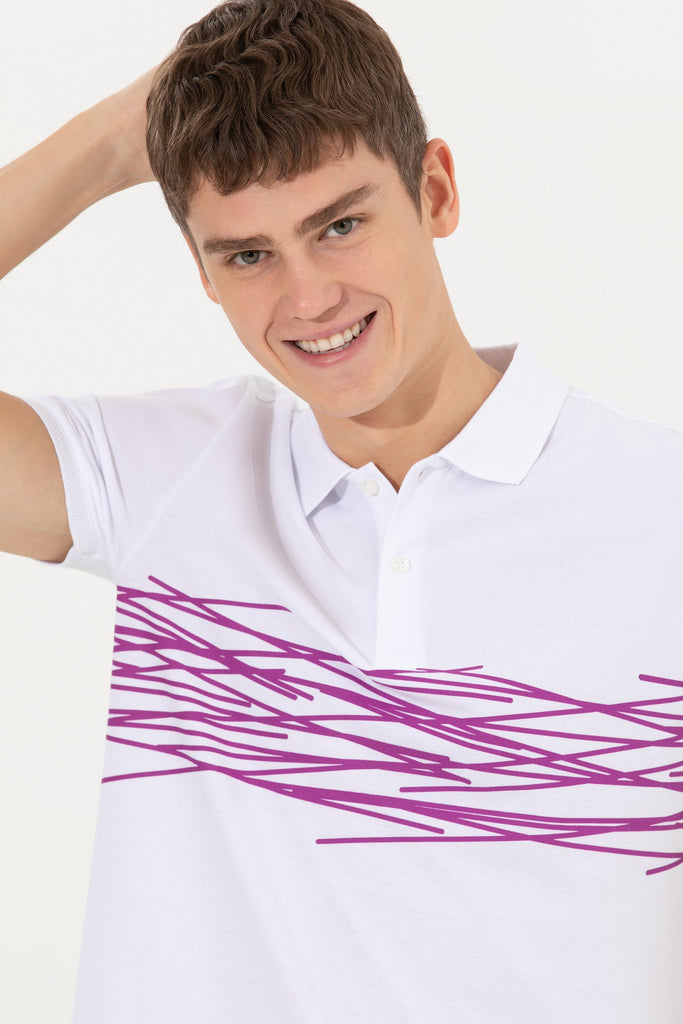 Ova sofisticirana polo majica u klasičnoj bijeloj boji s naglašenim uzorkom u vibrantnoj ljubičastoj boji donosi savršen spoj udobnosti i stila. Karakteriše je kvalitetan pamučni materijal koji osigurava prijatno nošenje i prozračnost tokom cijelog dana. Na prednjem dijelu majice nalazi se moderan geometrijski uzorak koji dodaje savremeni štih, čineći je idealnom za različite prigode. Ova polo majica je savršen izbor za ležerne izlaske ili poslovne sastanke, a lako se može kombinovati s trapericama, chinos hlačama ili šortsevima, omogućavajući vam da zračite samopouzdanjem u svakoj situaciji.