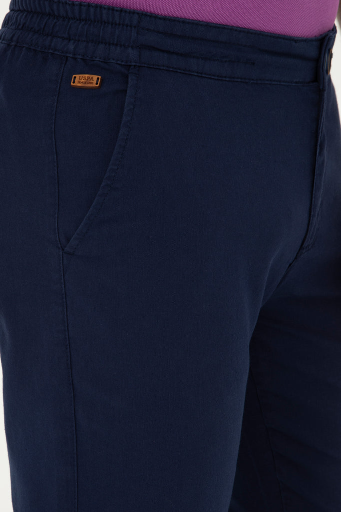 Elegantne pantalone u tamnoplavoj boji pružaju sofisticiran izgled i udobnost tokom cijelog dana. Karakteriše ih klasičan kroj koji osigurava savršeno pristajanje i slobodu pokreta. Na bočnim stranama nalaze se diskretne džepove koji dodatno ističu funkcionalnost. Ove pantalone su savršen izbor za formalne prilike, poslovne sastanke ili večernje izlaze, a lako se kombinuju s raznim majicama, košuljama ili sakoima, čineći ih svestranim dijelom svake garderobe.