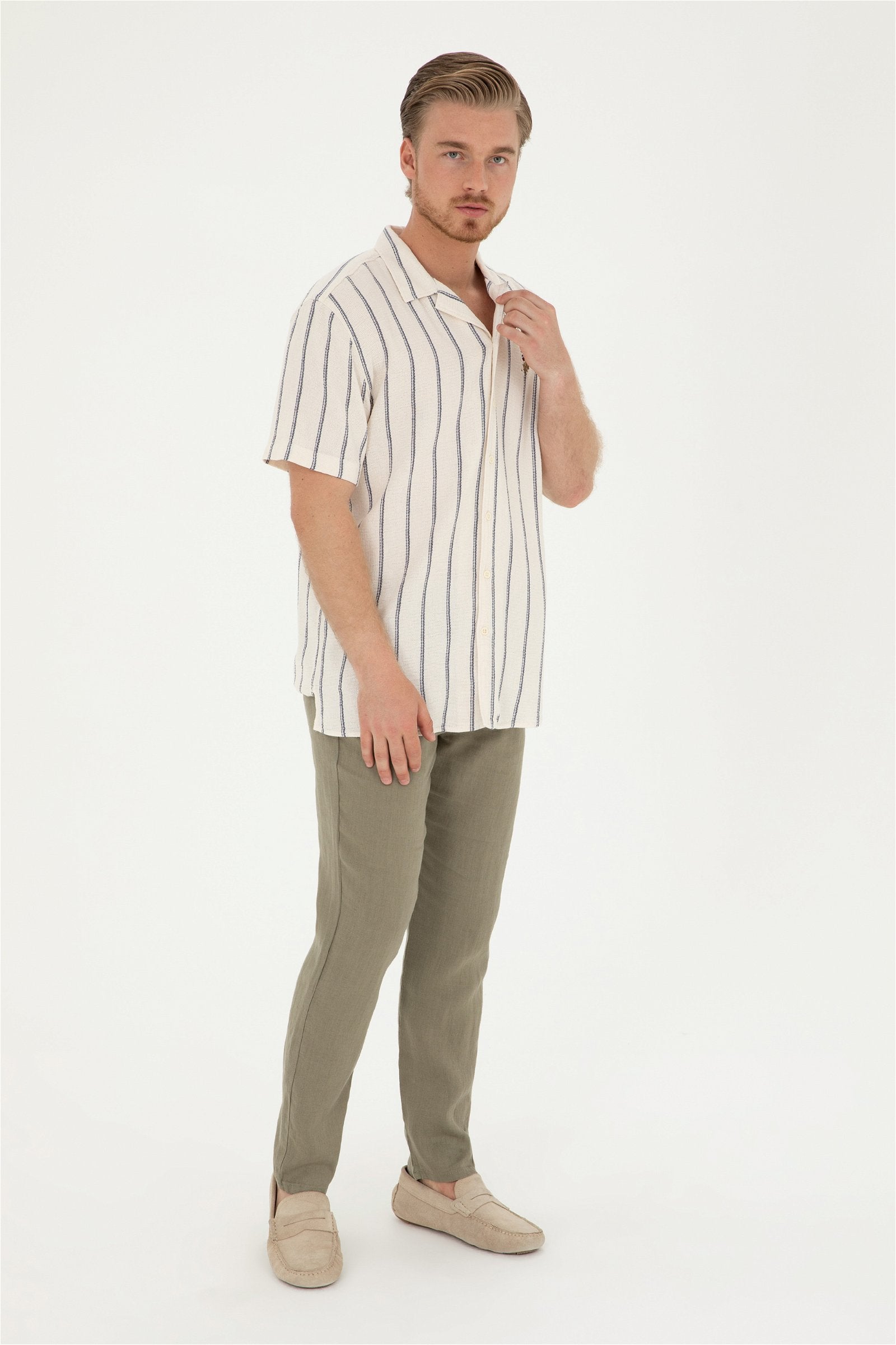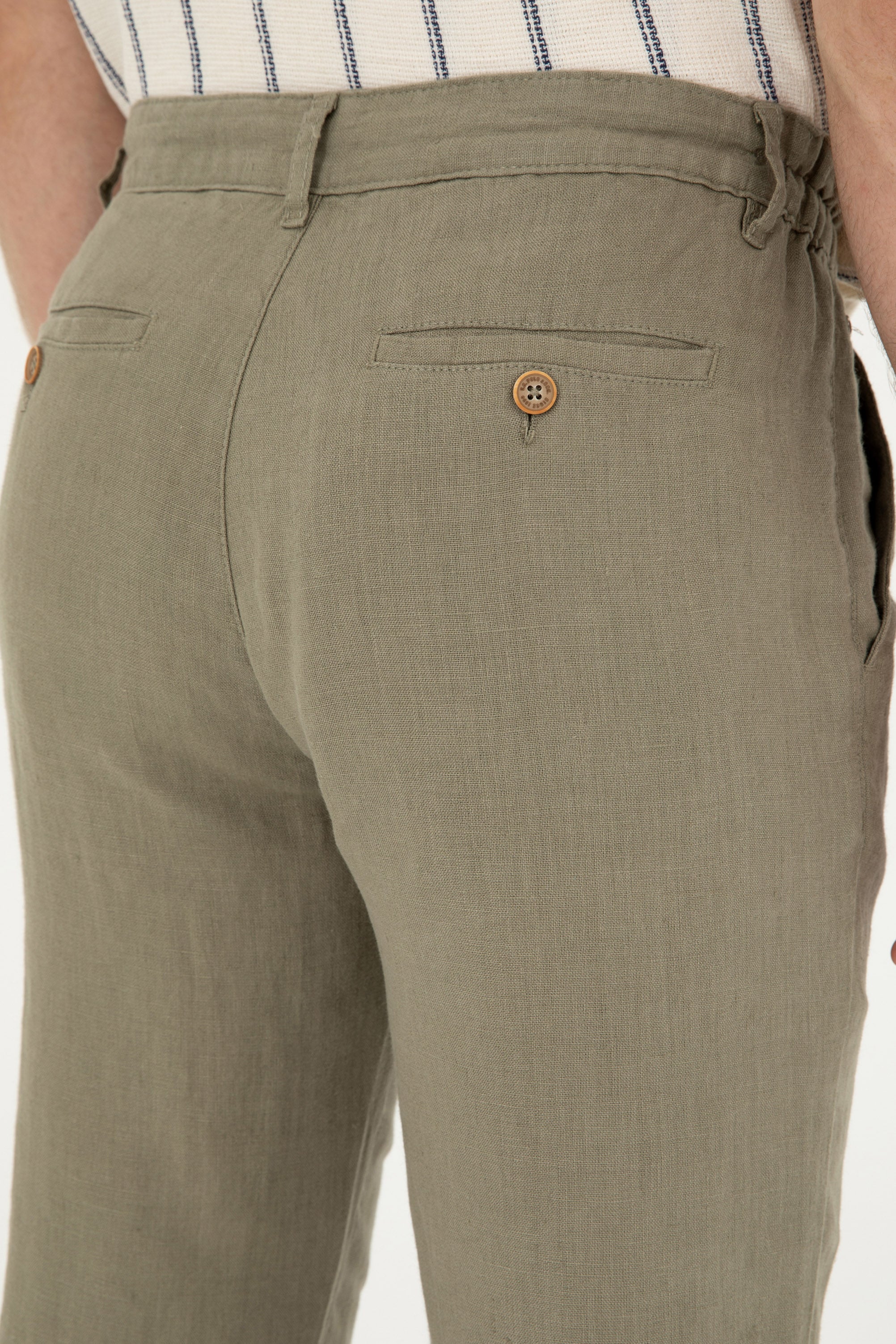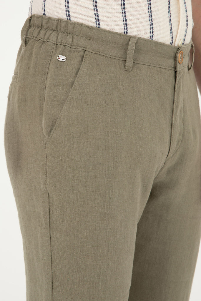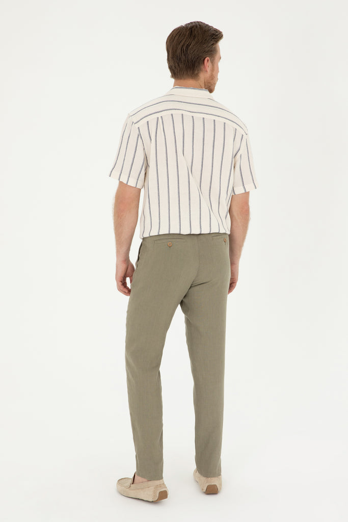 Pantalone u svijetloj maslinastoj boji predstavljaju savršen izbor za tople proljetne i ljetne dane, pružajući udobnost i stil. Karakterišu ih lagani materijali koji omogućavaju prozračnost, dok klasičan kroj osigurava dobar fit i slobodu kretanja. Diskretan detalj na bočnoj strani dodaje modernu nota, čineći ih prikladnim za različite prilike. Ove pantalone lako se kombinuju sa raznim majicama ili košuljama, savršene su za ležerne izlaske, kao i za opuštene poslovne kombinacije, pružajući svestranost i eleganciju.