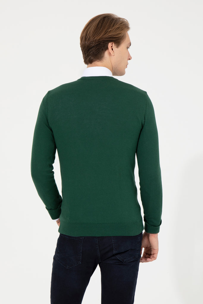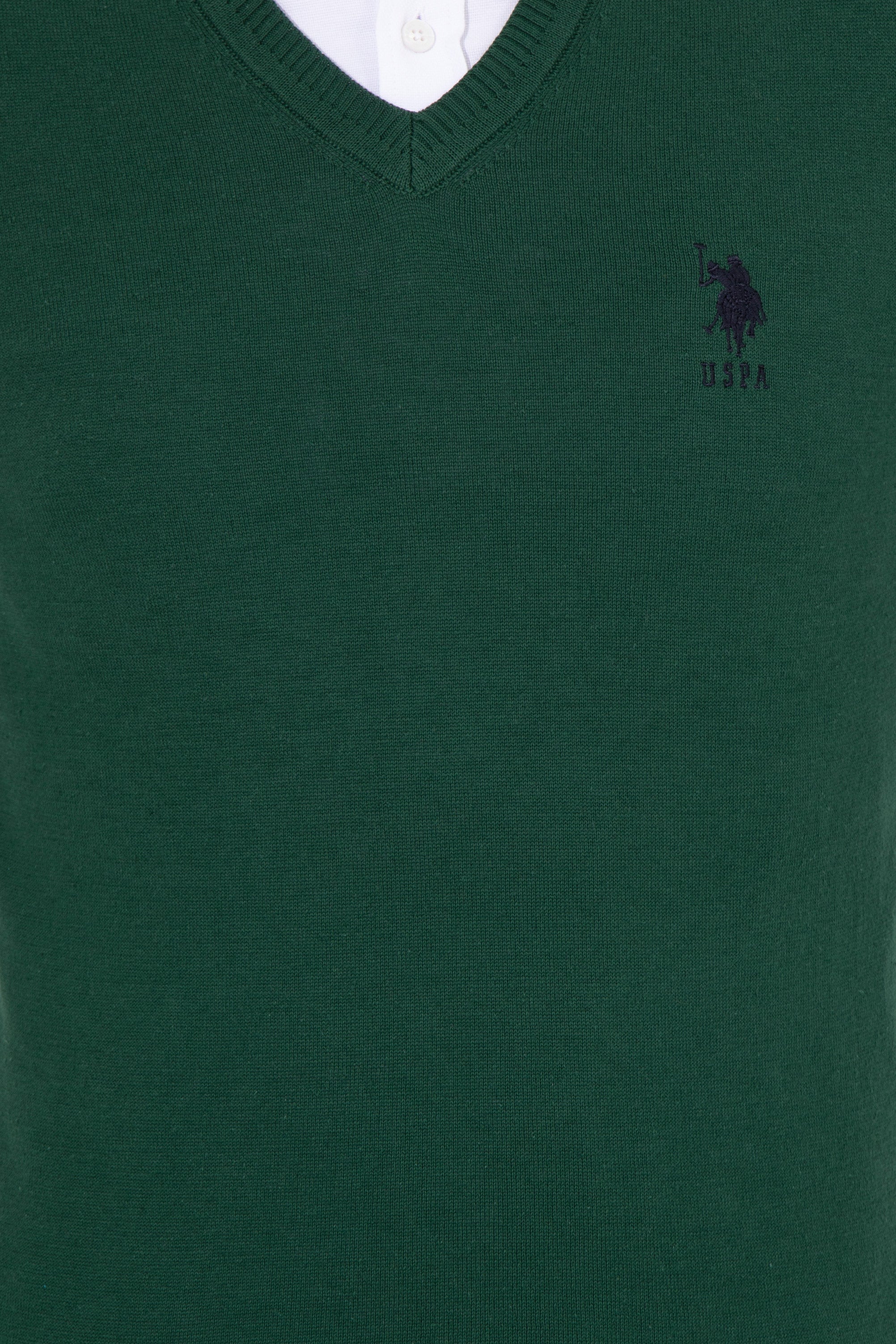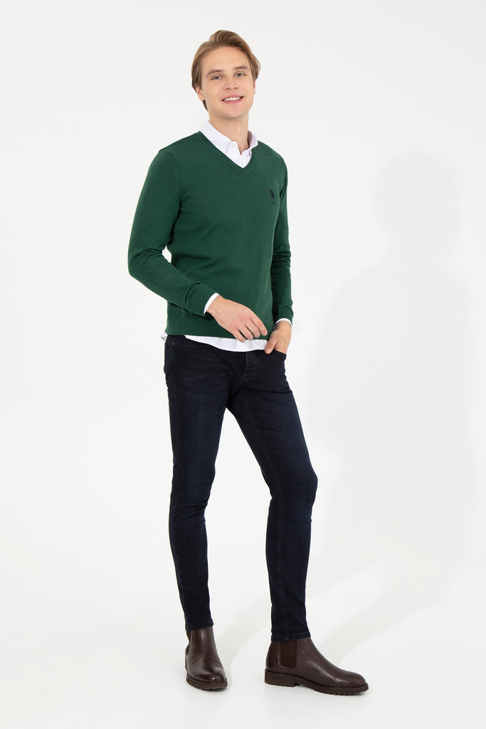 Elegantan pleteni džemper u dubokoj zelenoj boji donosi toplinu i udobnost tokom hladnih dana. Karakteriše ga meka tekstura koja osigurava prijatno nošenje i savršeno pristajanje. Džemper sa V-izrezom dodatno pruža sofisticiran izgled, dok diskretni logo na prednjem dijelu dodaje moderan akcent. Ovaj džemper je idealan za svakodnevne kombinacije, bilo da se radi o poslovnim prilikama ili ležernim izlascima, a lako se može kombinovati sa košuljama, jaknama ili drugim odjevnim predmetima.