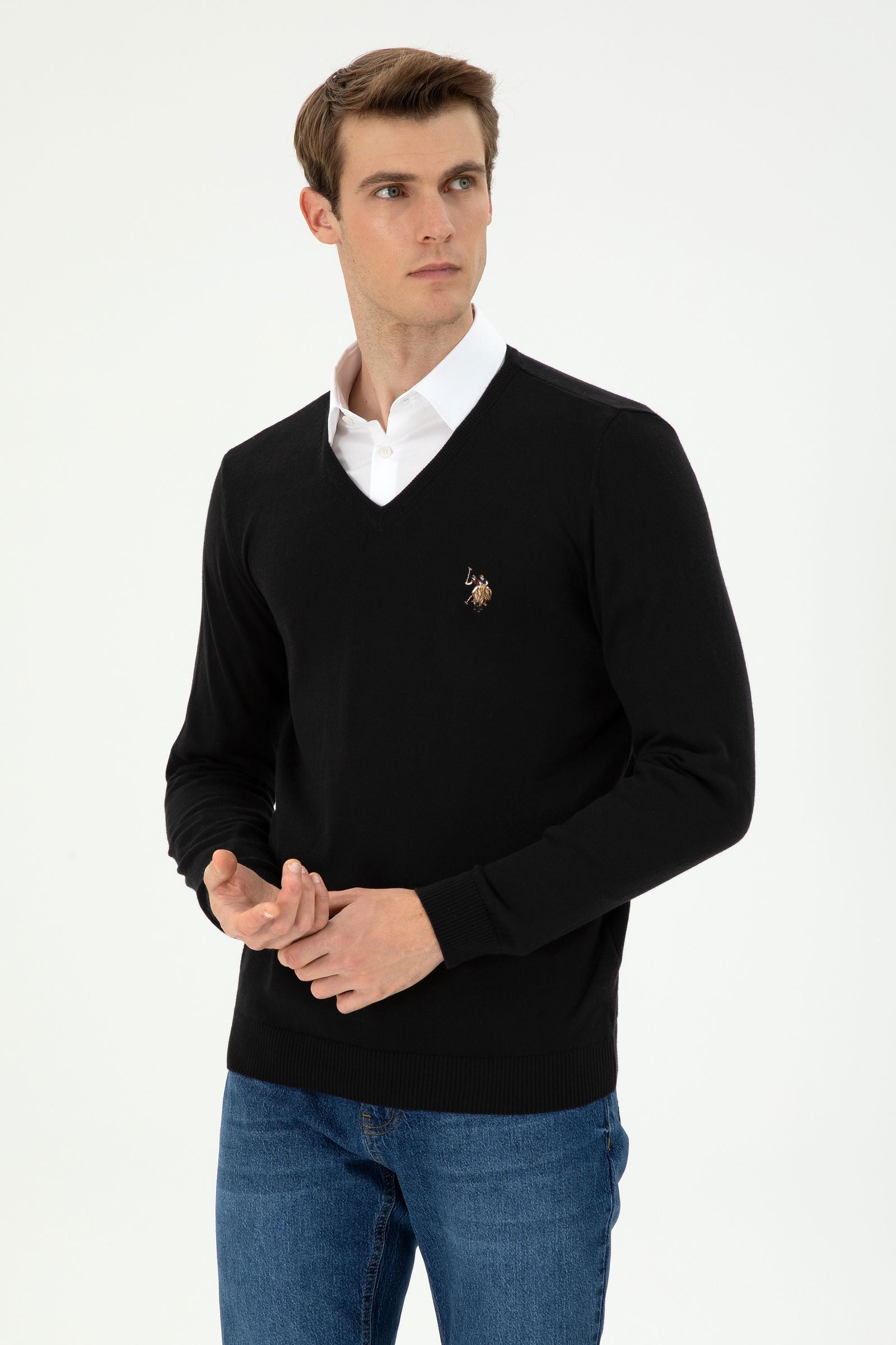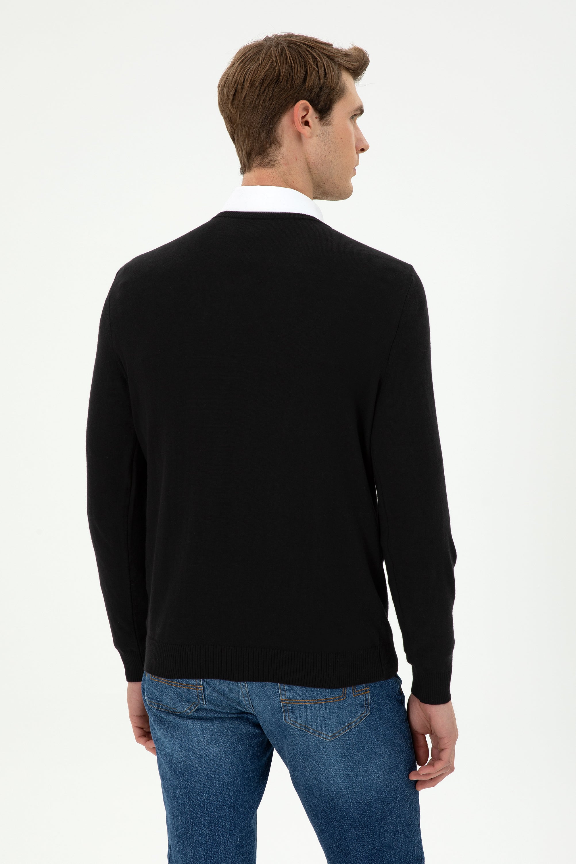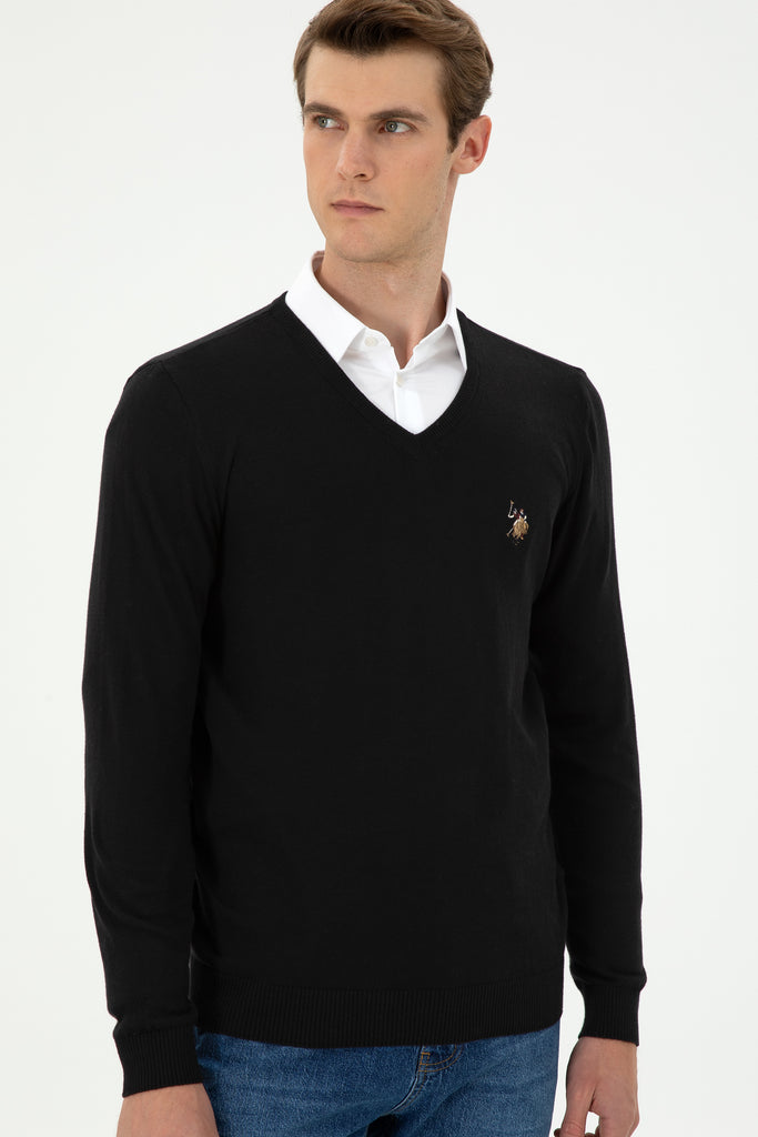 Elegantni džemper u klasičnoj crnoj boji nudi savršenu kombinaciju udobnosti i stila za svaku priliku. Izrađen je od kvalitetnog materijala koji osigurava toplinu i prijatan osjećaj tokom cijelog dana. Njegov sofisticirani V-izrez doprinosi modernom izgledu, dok se diskretan logo na prednjem dijelu ističe kao suptilan, ali efektan detalj. Ovaj džemper se lako uklapa u razne modne kombinacije, bilo da ga nosite uz traperice za ležeran izgled ili s elegantnim hlačama za poslovne prilike, čineći ga nezaobilaznim komadom u svakoj garderobi.