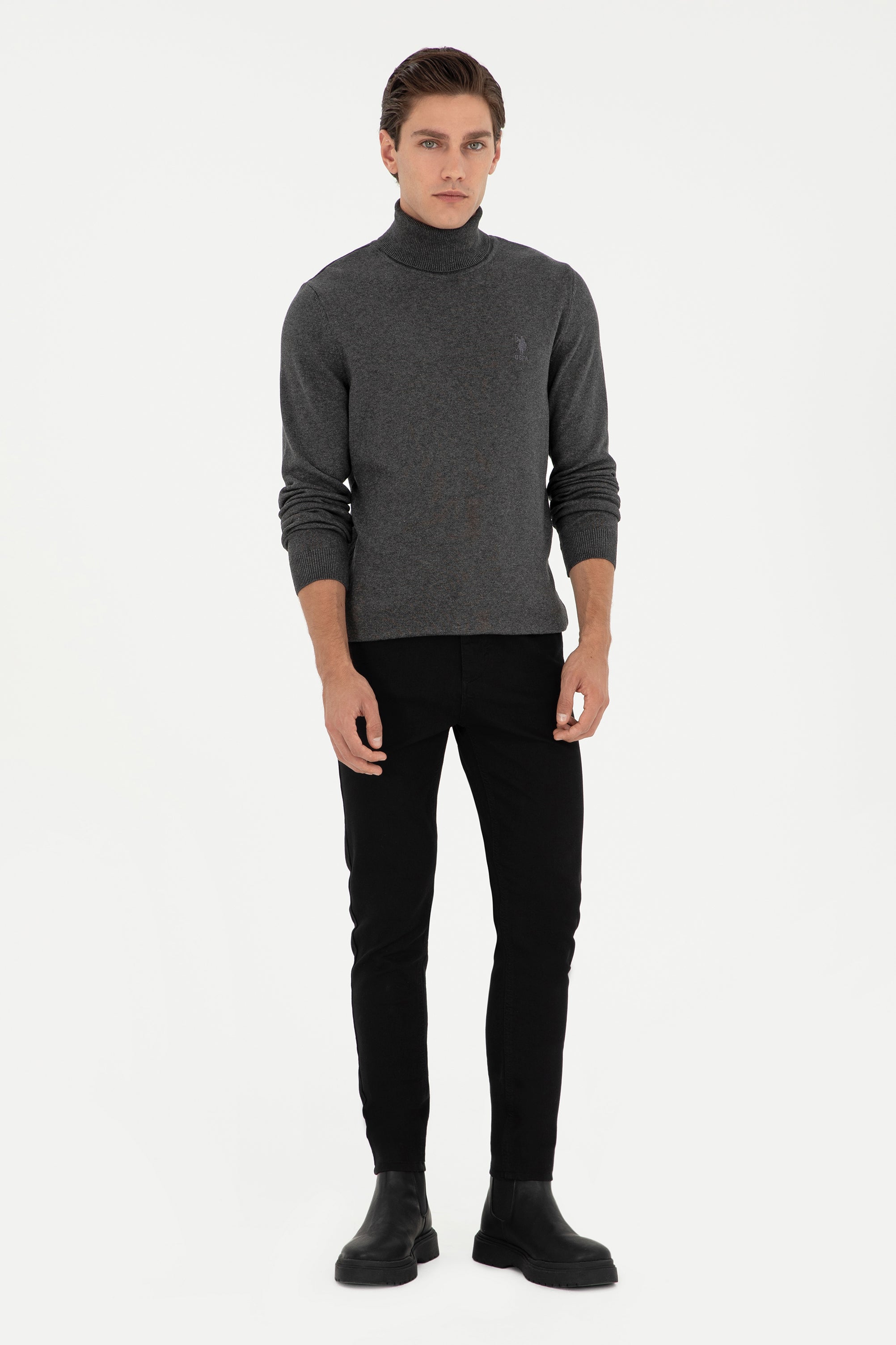 Elegantni džemper u tamno sivoj boji savršeno se uklapa u zimske garderobe, pružajući udobnost i sofisticiranost. Karakteriše ga fina pletena tekstura koja osigurava toplinu i prijatan osjećaj tokom hladnih dana. Džemper ima visok ovratnik, koji dodatno štiti od vjetra i niskih temperatura. Diskretni logo na prsima dodaje mu na stilu, dok jednostavan i klasičan kroj omogućava lako kombinovanje sa raznim odjevnim kombinacijama. Ovaj džemper je idealan izbor za svakodnevne izlaske, poslovne prilike ili opuštene vikende, te se može nositi uz traperice, chino hlače ili ispod jakne.