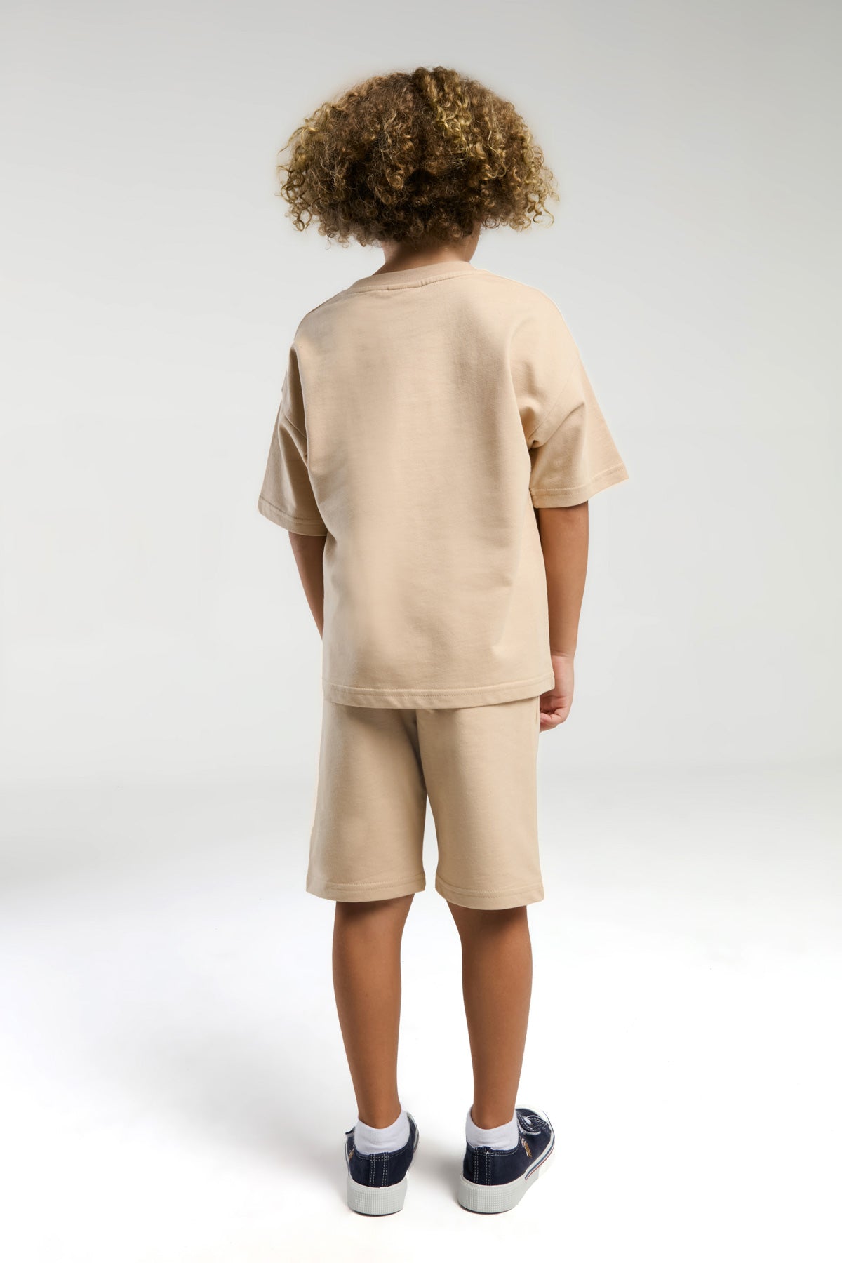 Set od majice i kratkih hlača u nježnoj bež boji savršeno je osmišljen za tople dane. Karakteriše ga udoban kroj koji omogućava lako kretanje i dobro pristajanje tijekom igre ili odmora. Majica ima jednostavan, ali moderan dizajn s diskretnim logotipom, dok kratke hlače dodatno naglašavaju ležernost i udobnost. Ovaj set predstavlja idealan izbor za svakodnevne aktivnosti, bilo da se radi o odlasku u školu, na plažu ili druženju s prijateljima. Lako se kombinira s različitim obućom i dodacima, čineći ga svestranim komadom garderobe za svaku priliku.