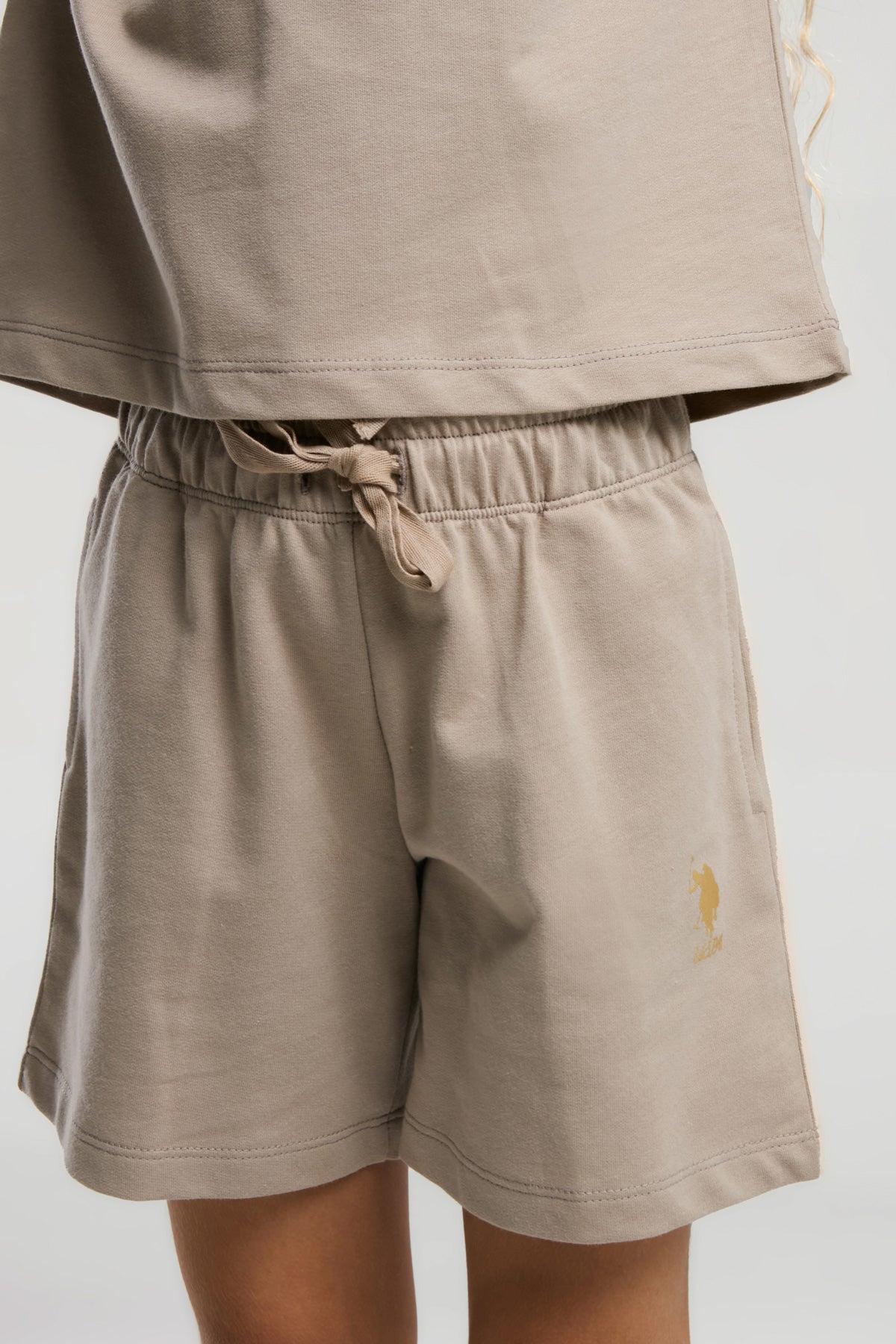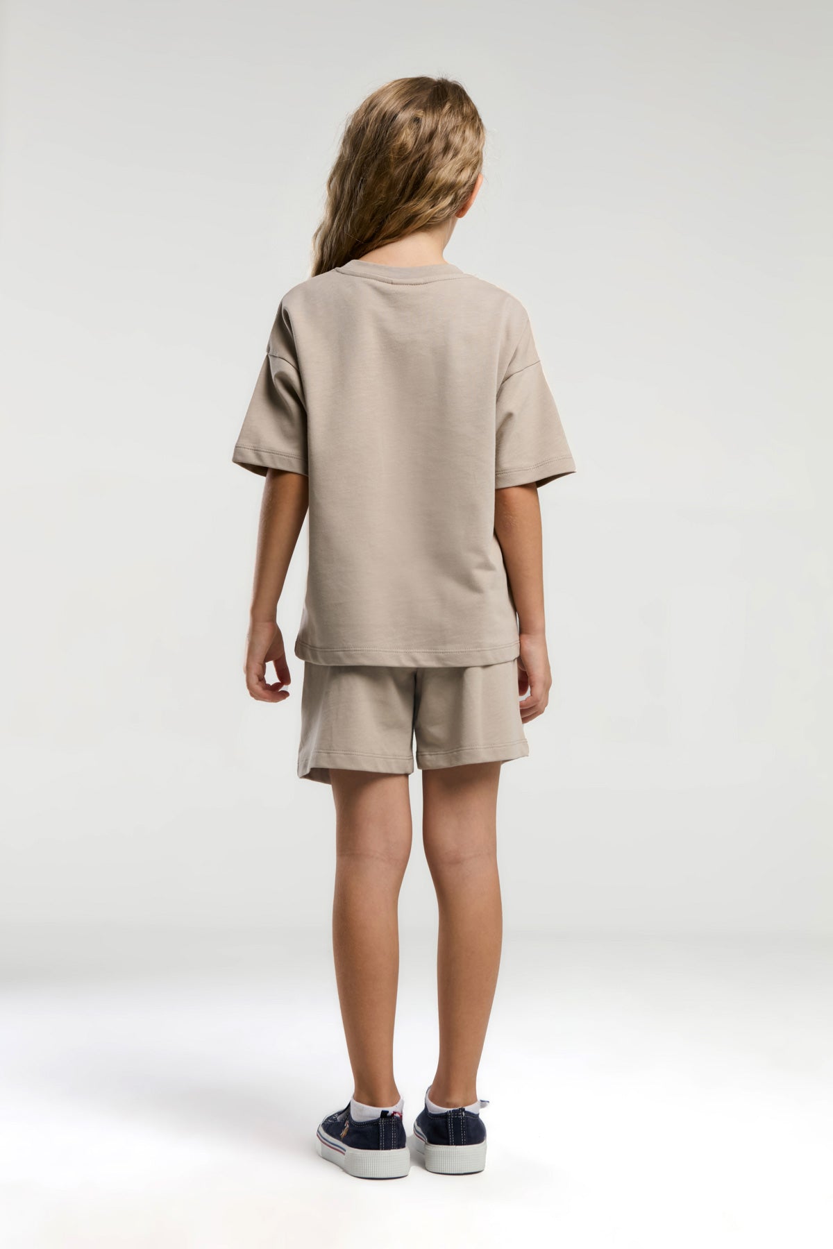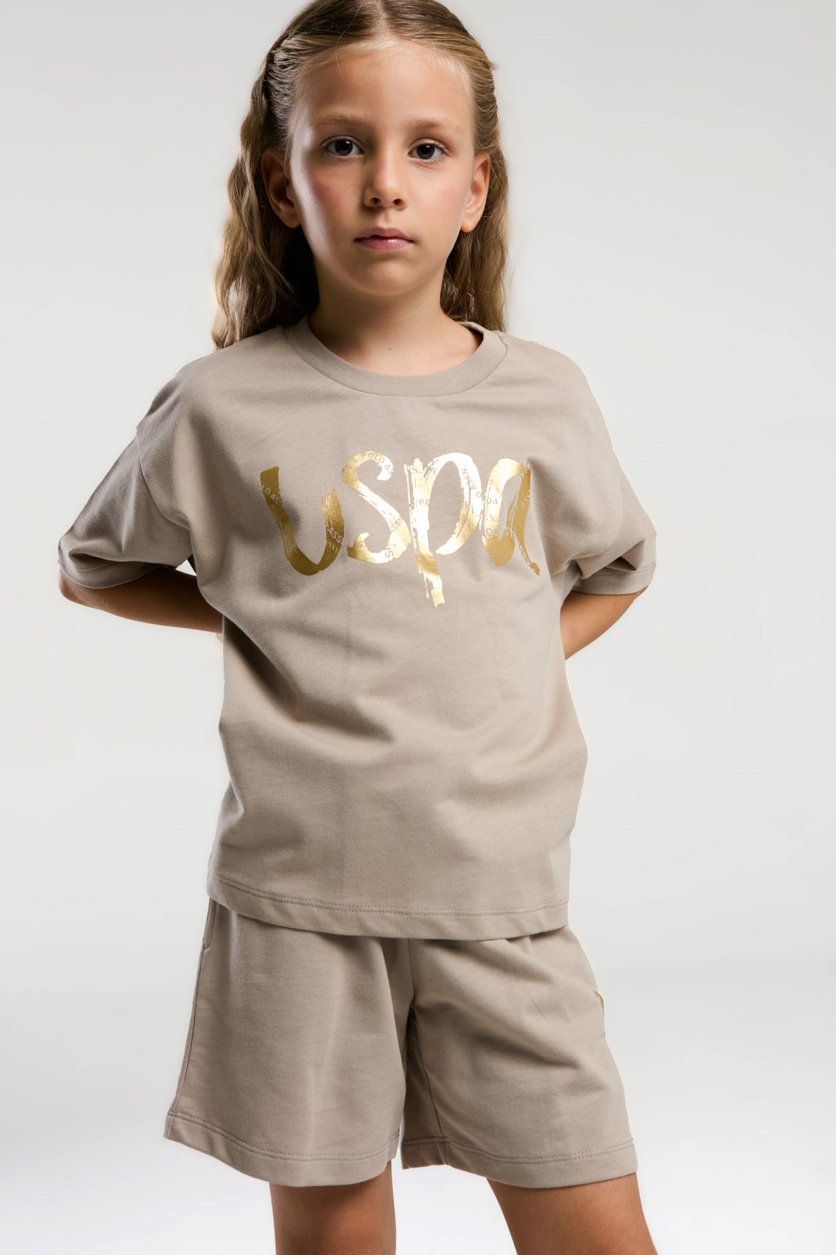 Ova moderna i udobna dječija kombinacija sastoji se od majice i kratkih hlača u nježnoj nijansi bež boje, savršena za tople sunny dane. Majica krasi zanimljiv natpis u zlatnoj boji koji dodaje dozu igrivosti i stila. Kratke hlače su praktične i pružaju slobodu pokreta, idealne za sve dnevne aktivnosti. Ovaj set je savršen izbor za ležerne trenutke, bilo da se radi o igri u parku ili odlasku na plažu, a lako se kombinira s različitim sportskim ili casual obućom.