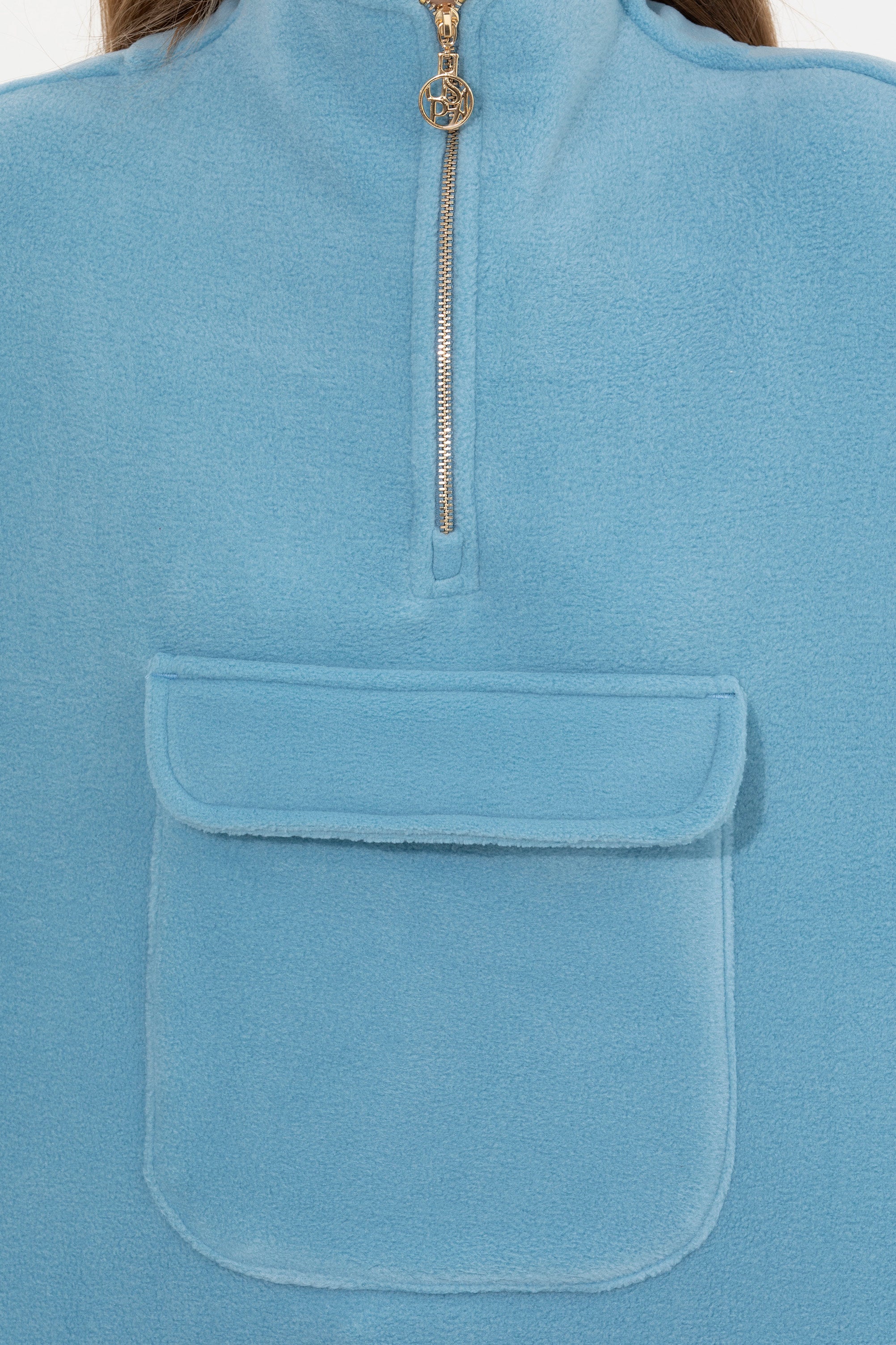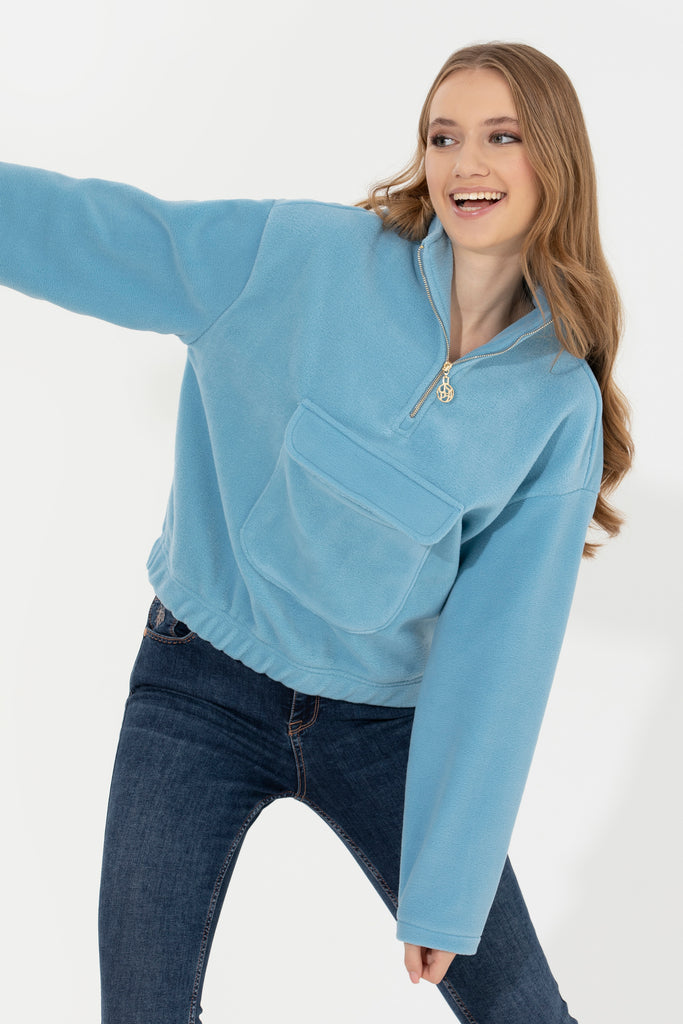 Moderna dukserica u svijetloplavoj boji donosi savršenu kombinaciju udobnosti i stila za svakodnevno nošenje. Karakteriše je mekani materijal koji pruža toplinu tokom hladnijih dana, dok kroj sa zip zatvaračem omogućava jednostavno oblačenje i sklanjanje. Na prednjem dijelu dukserice nalazi se praktična džepna pregrada koja dodaje funkcionalnost i ujedno stvara zanimljiv vizualni detalj. Ova dukserica je idealan izbor za ležerne izlete ili opuštene trenutke kod kuće, a lako se može kombinovati s farmerkama, trenirkama ili čak sa suknjama za chic izgled.