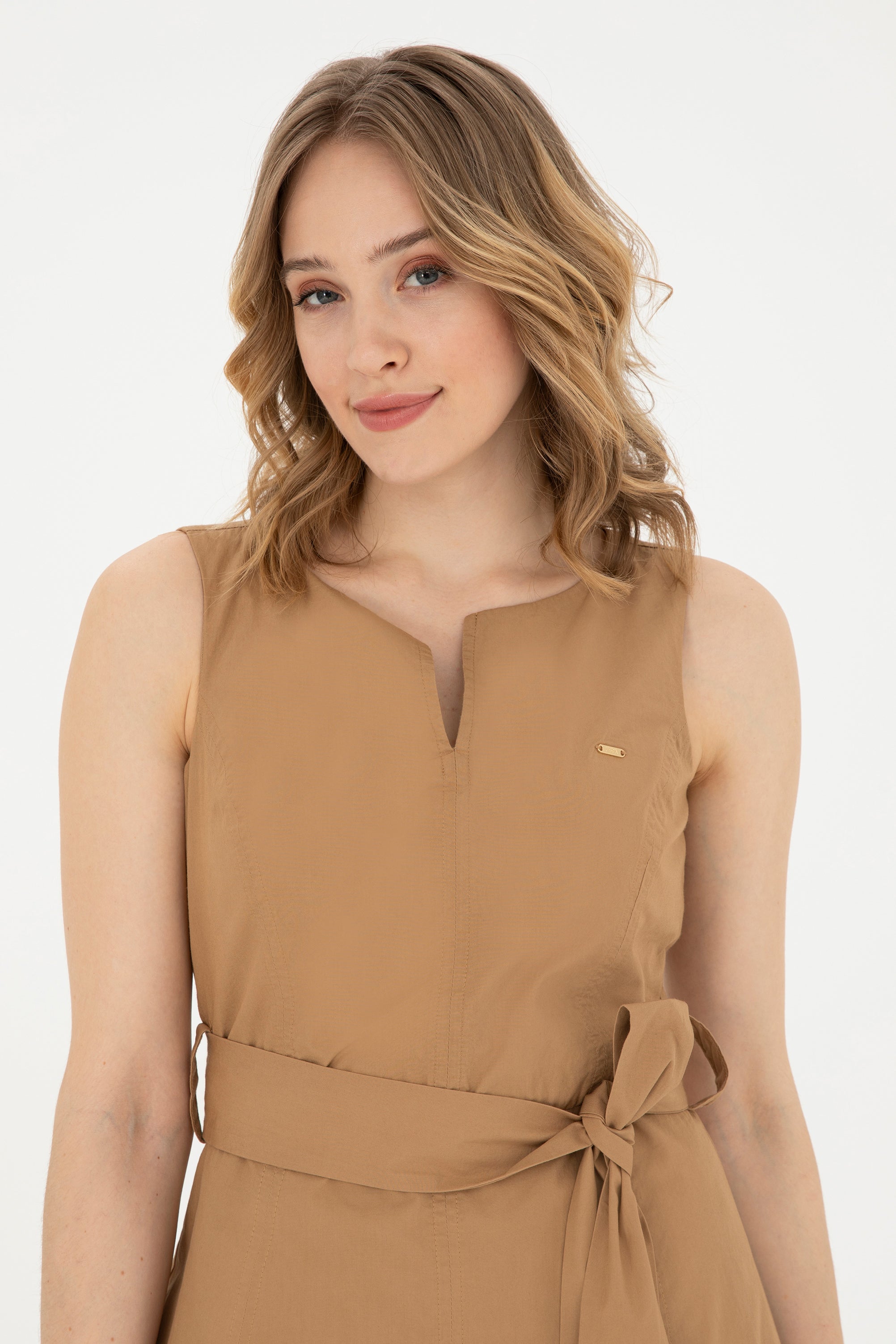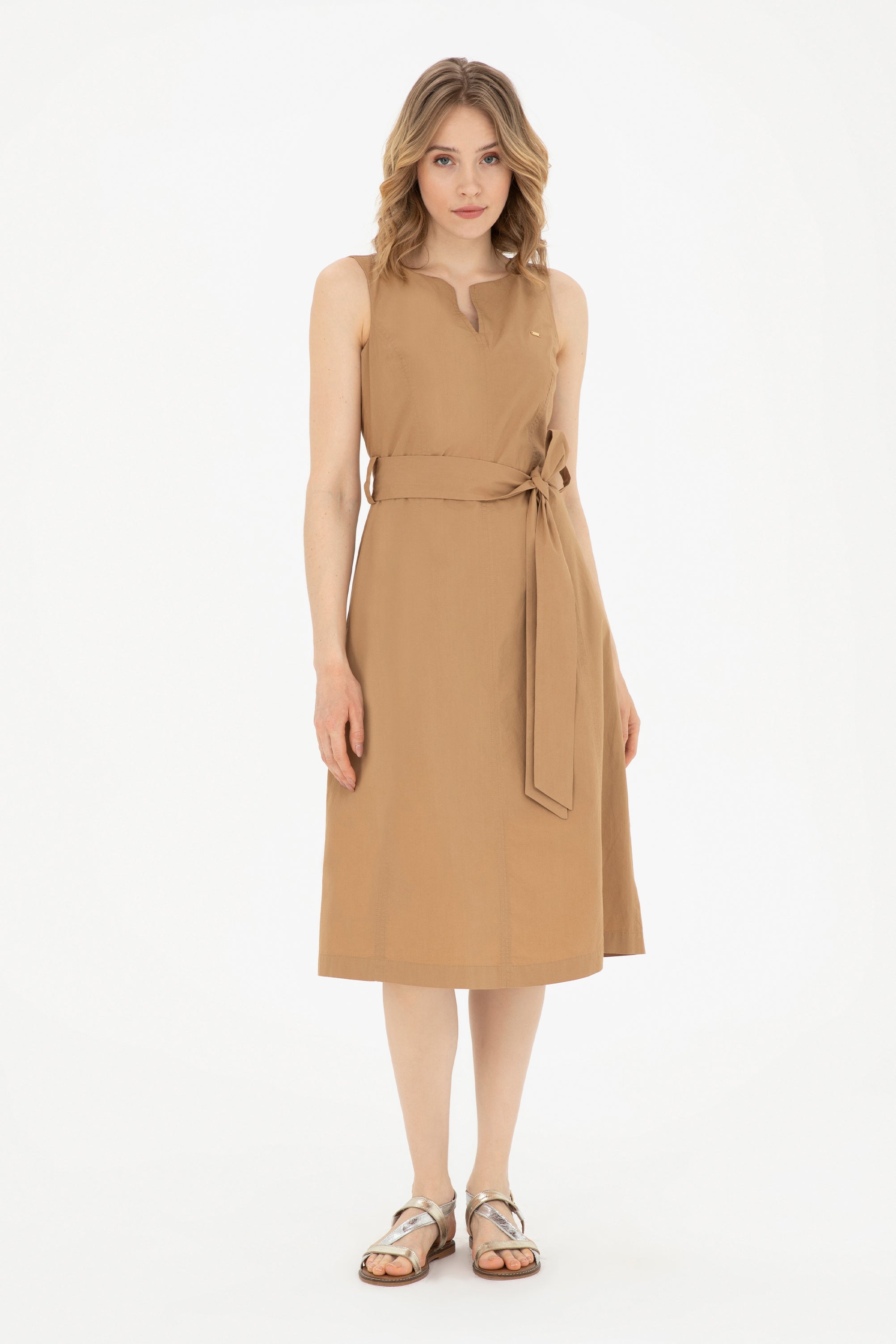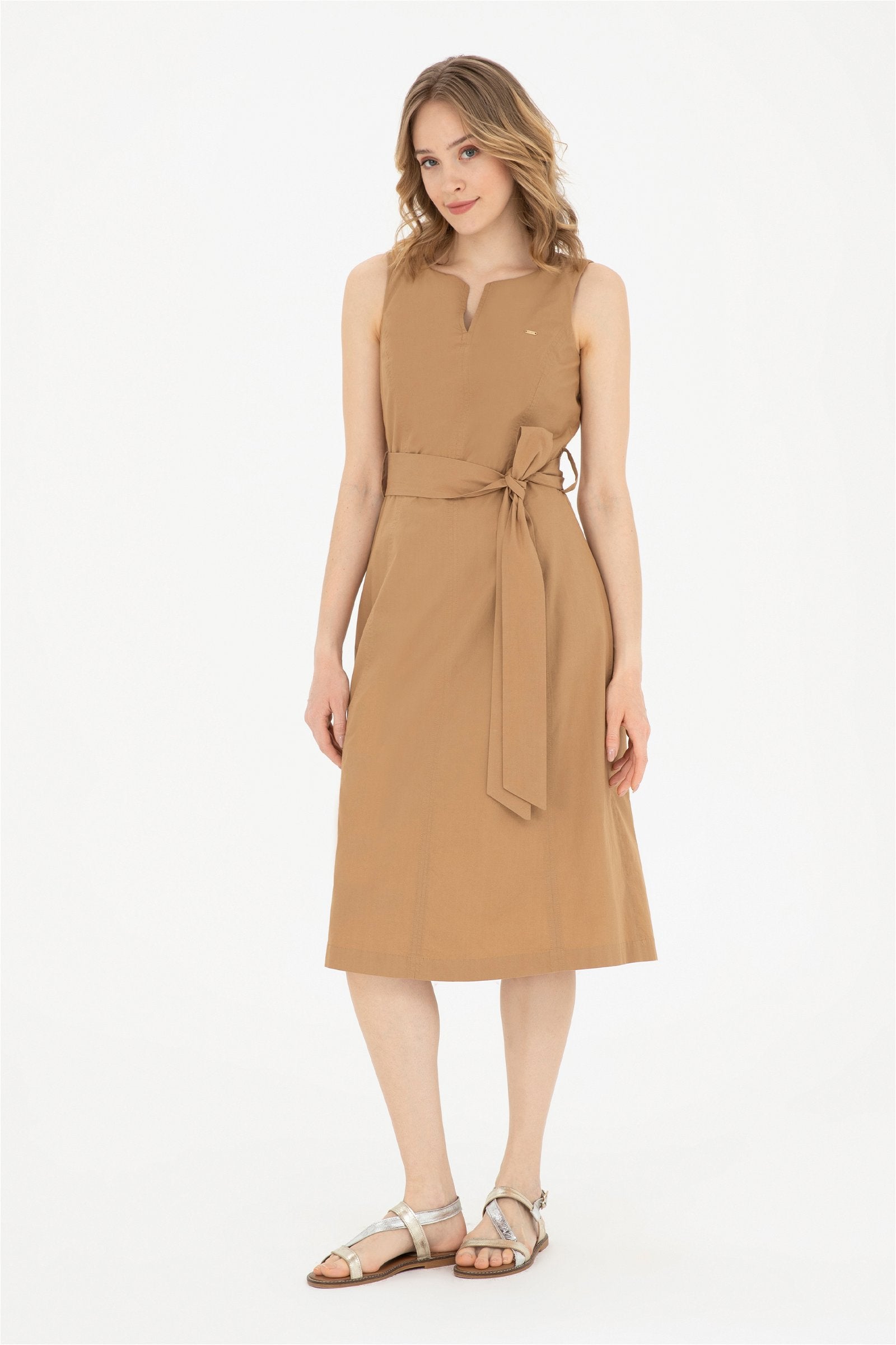 Elegantna haljina u zemljanoj boji pruža sofisticiran izgled i udobnost za različite prilike. Karakteriše je jednostavan kroj sa diskretnim dekolteom i pojasom koji naglašava struk, čineći je savršenom za isticanje ženskih oblika. Tkanina je lagana i prijatna za nošenje, idealna za tople dane. Ova haljina se lako kombinira s raznim modnim dodacima, kao što su sandale, narukvice ili torbe, a može se nositi na poslovnim sastancima ili opuštenim izlascima sa prijateljima.