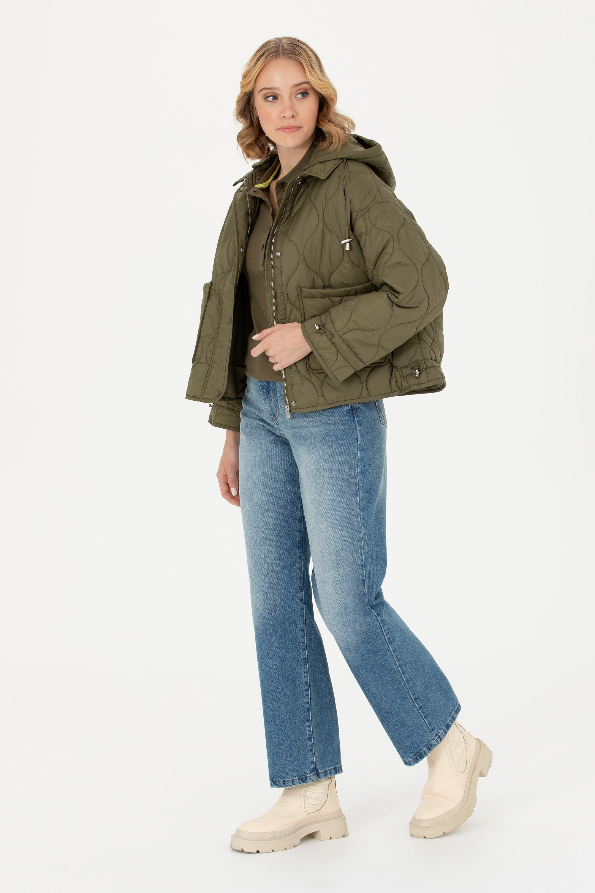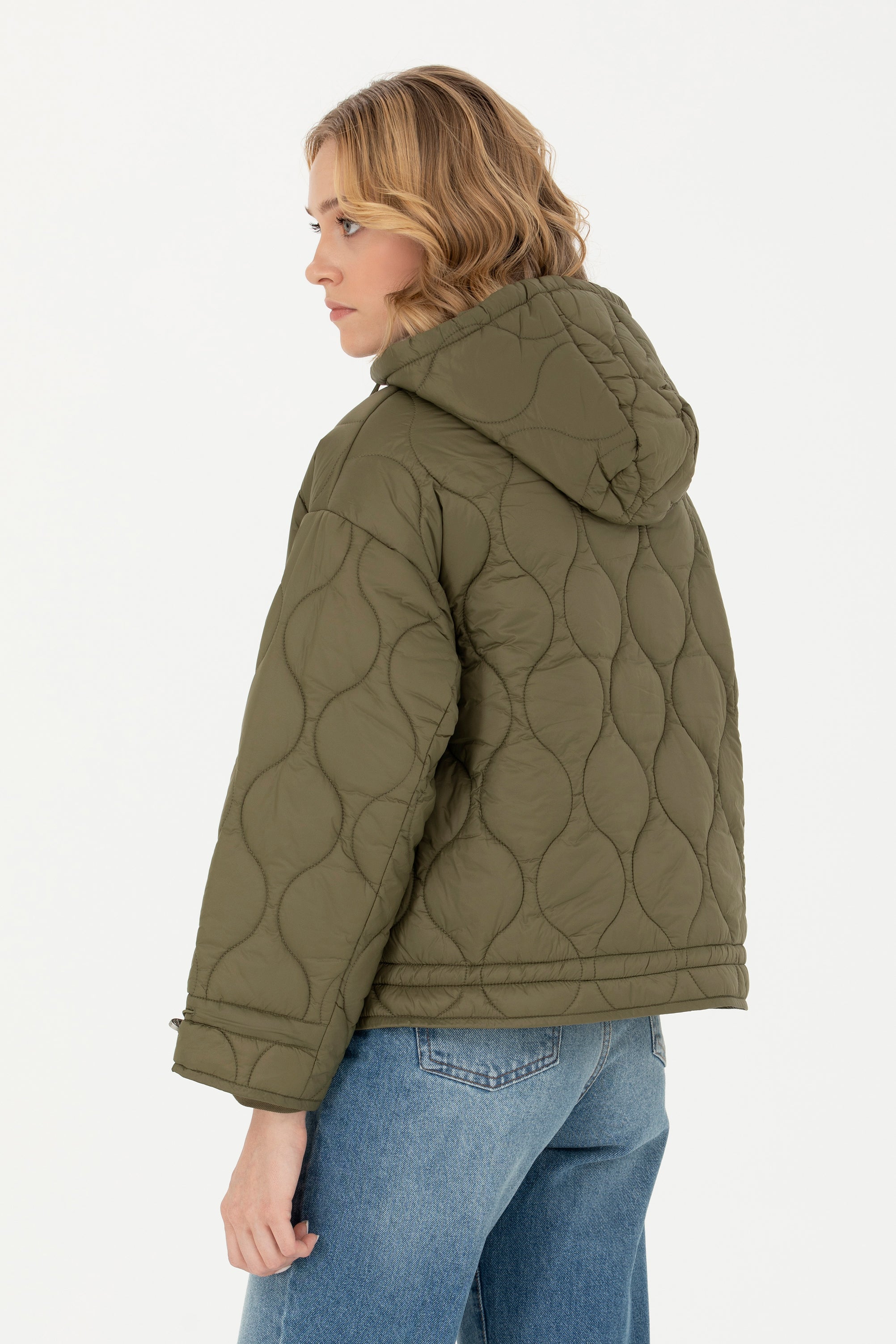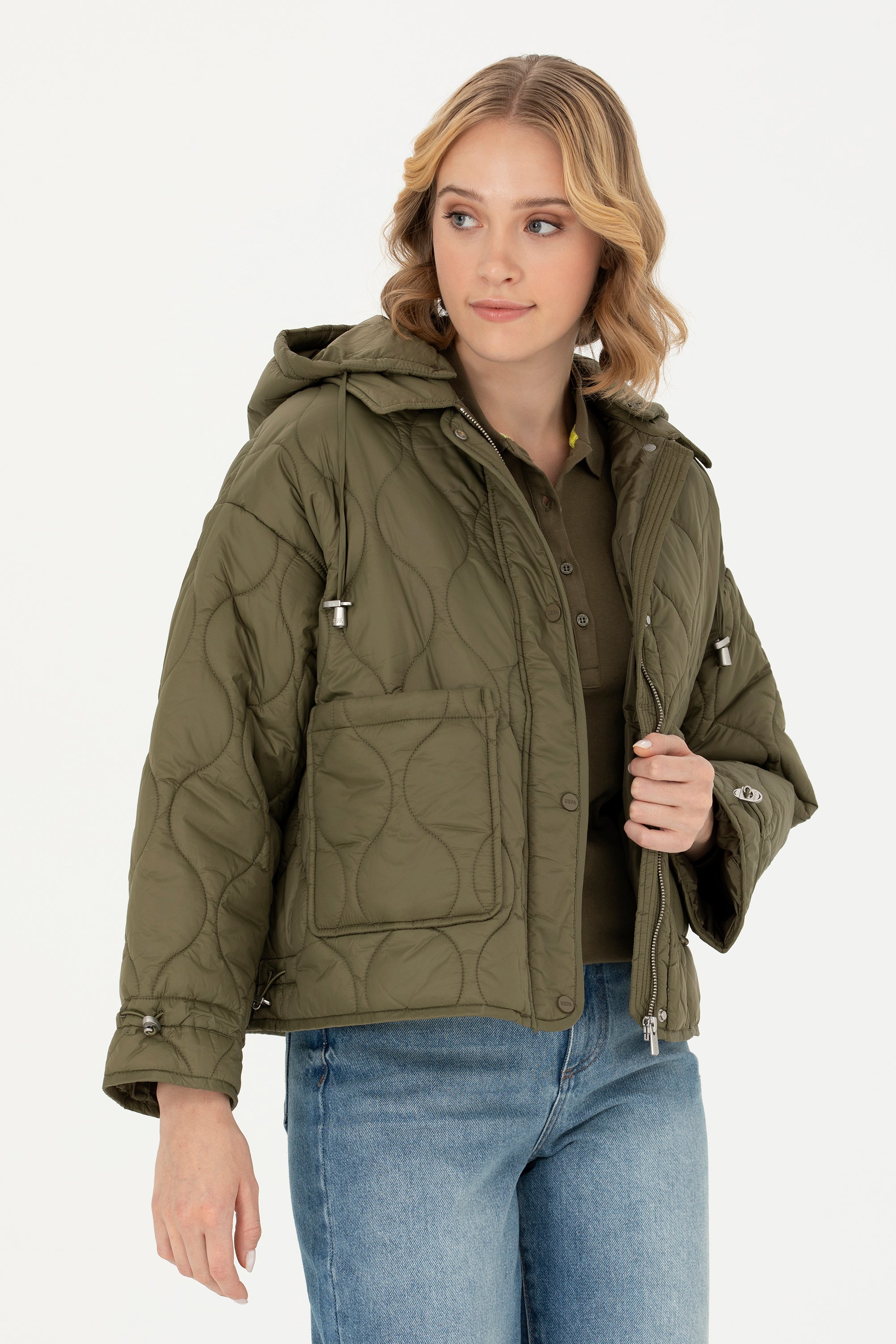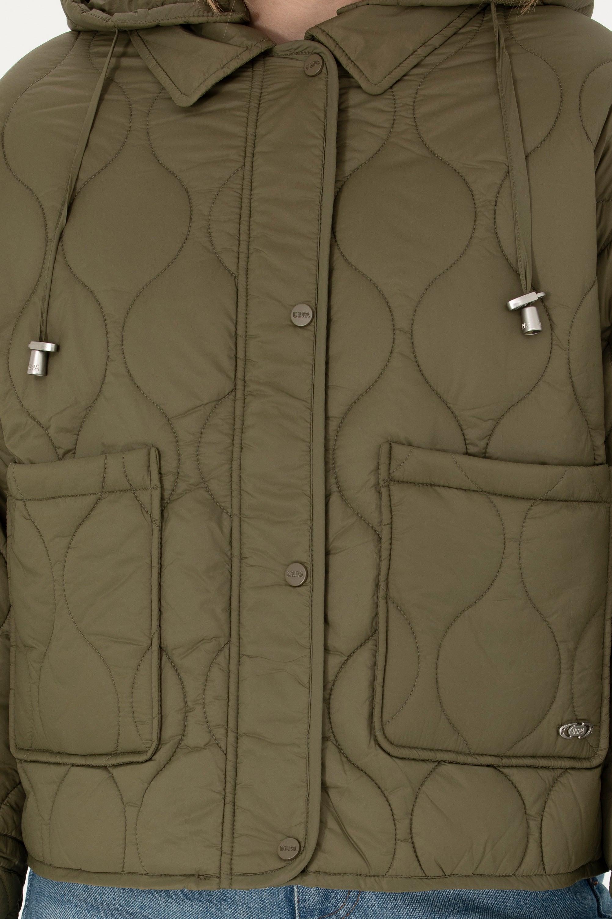 Elegantna zimska jakna u smaragdno zelenoj boji pruža savršenu kombinaciju stila i funkcionalnosti, idealna za hladnije dane. Karakteriše je meka, quilted tekstura koja osigurava toplinu i udobnost, dok kapuljača dodaje dodatnu zaštitu od vjetra. Na prednjoj strani jakne nalaze se praktične tašne koje omogućavaju sigurno odlaganje sitnica, a metalni zatvarači nude moderan izgled. Ova jakna se savršeno uklapa u svaku zimsko-jesensku kombinaciju, bilo da se radi o ležernom izletu ili svakodnevnim aktivnostima, lako se može kombinovati s trapericama, svilenim bluzama ili toplim džemperima.