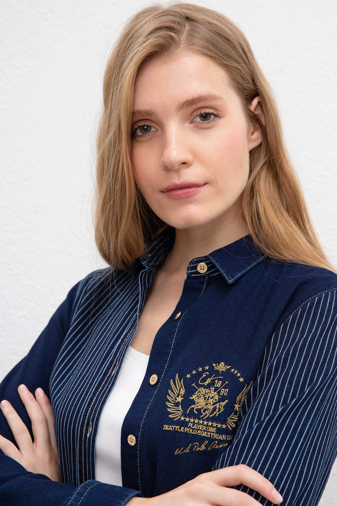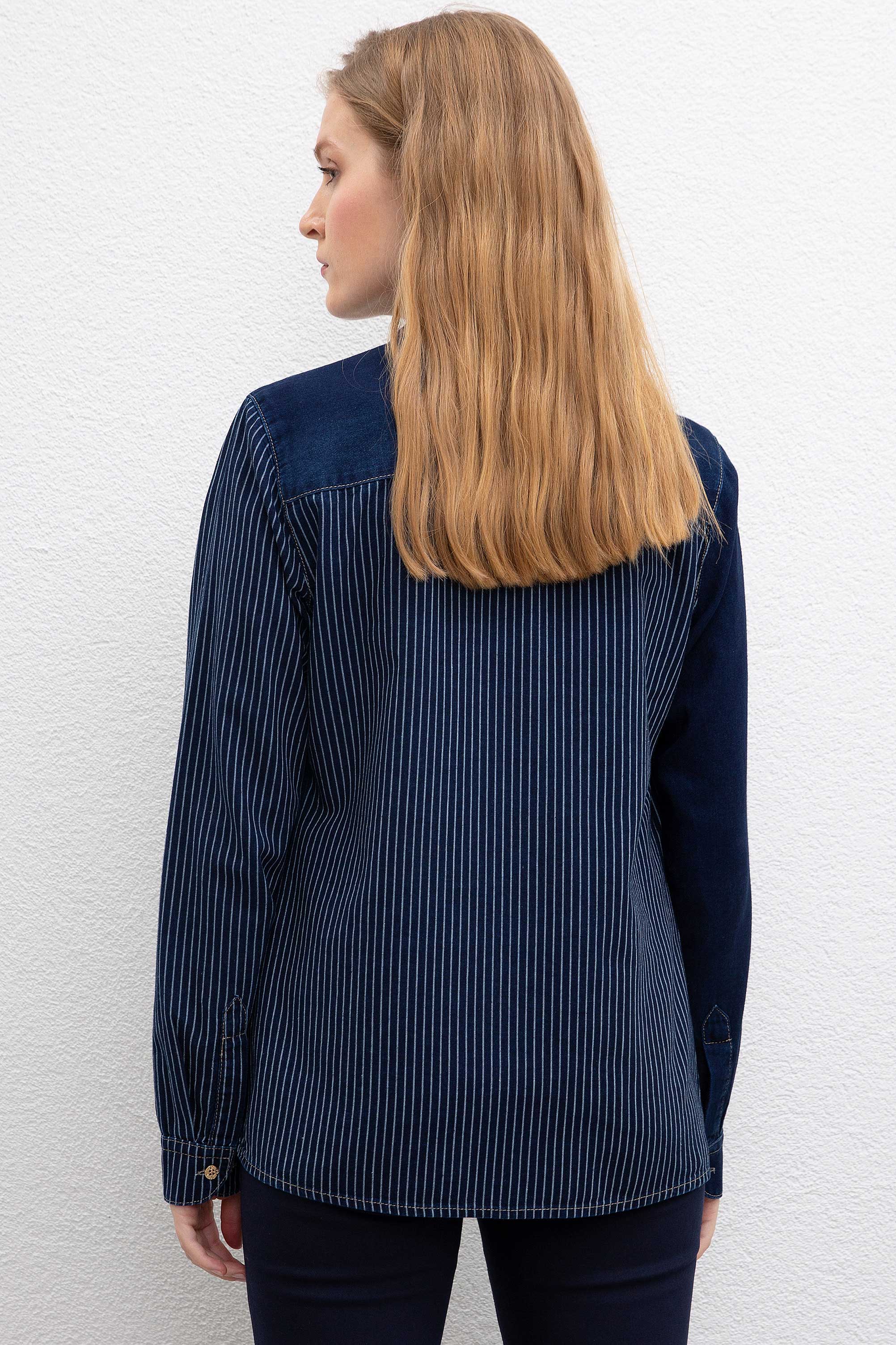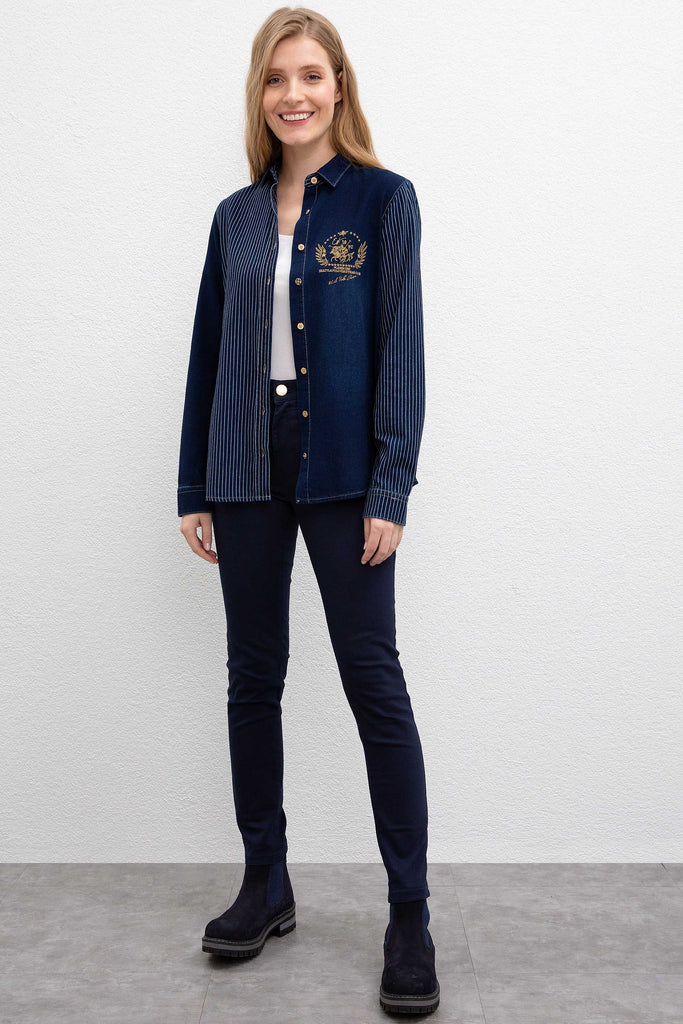 Ova moderna denim jakna u kombinaciji tamnoplave i svijetloplave boje savršena je za kreiranje stylish look-a tokom cijele godine. Karakteriše je klasičan kroj sa dugmićima koji olakšavaju oblačenje i pružaju udobnost. Jakna ima zanimljive pruge koje dodaju trendi element, a na prednjem dijelu se nalazi diskretna veza koja daje poseban pečat. Ova jakna je idealan izbor za ležerne kombinacije, bilo da je nosite uz farmerke ili suknju, i lako se može uklopiti u različite stilove, čineći je nezaobilaznim komadom vaše garderobe.
