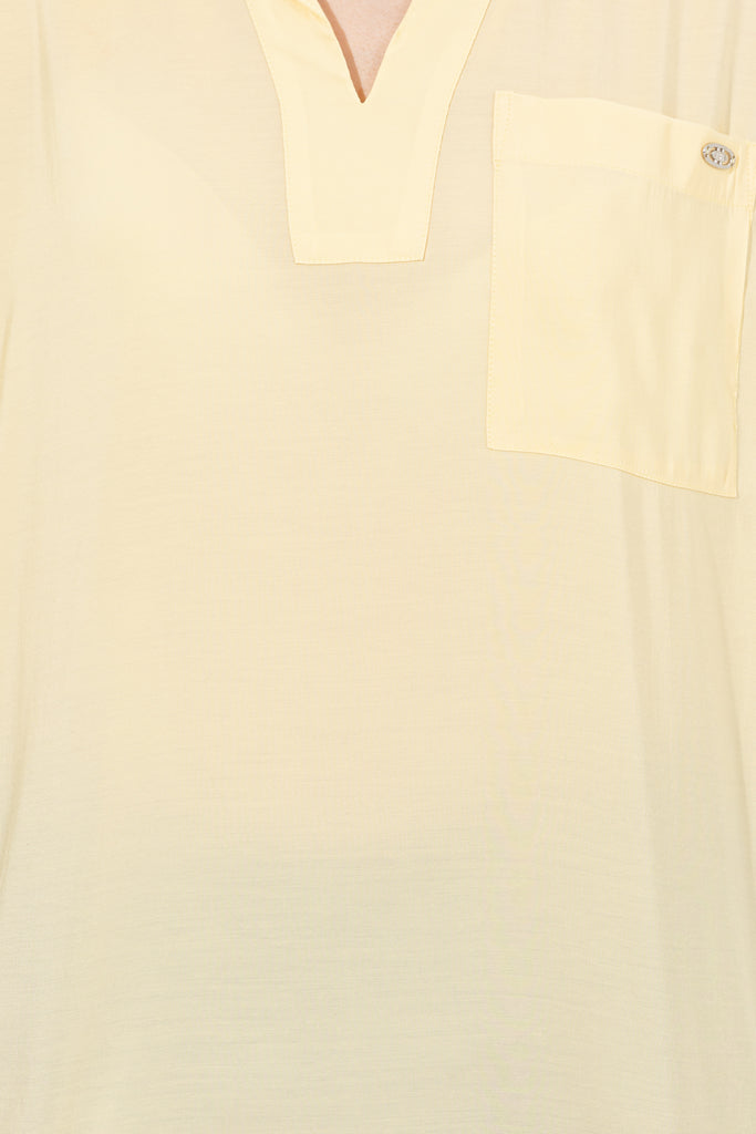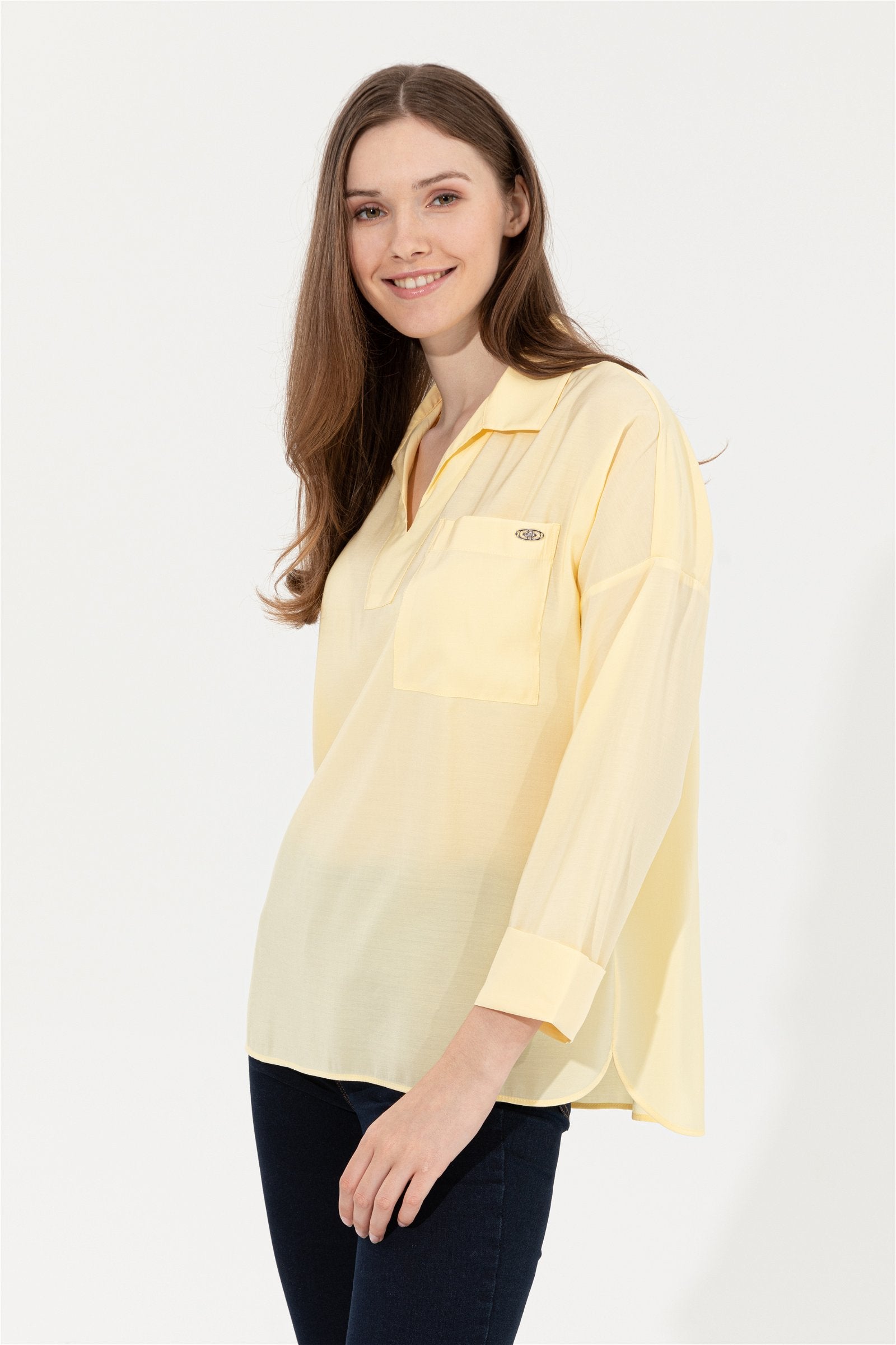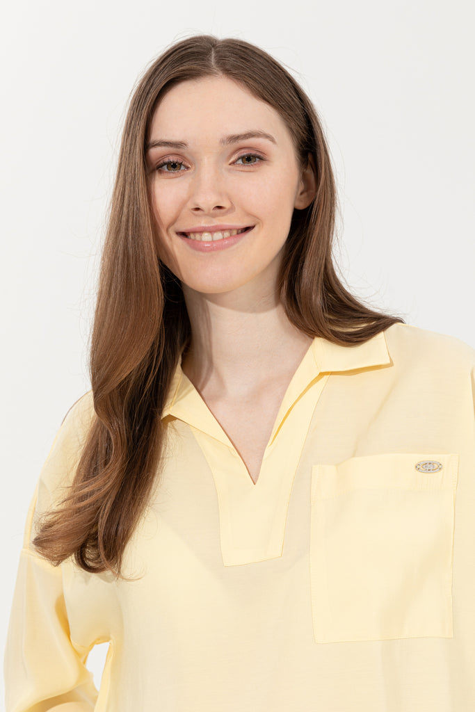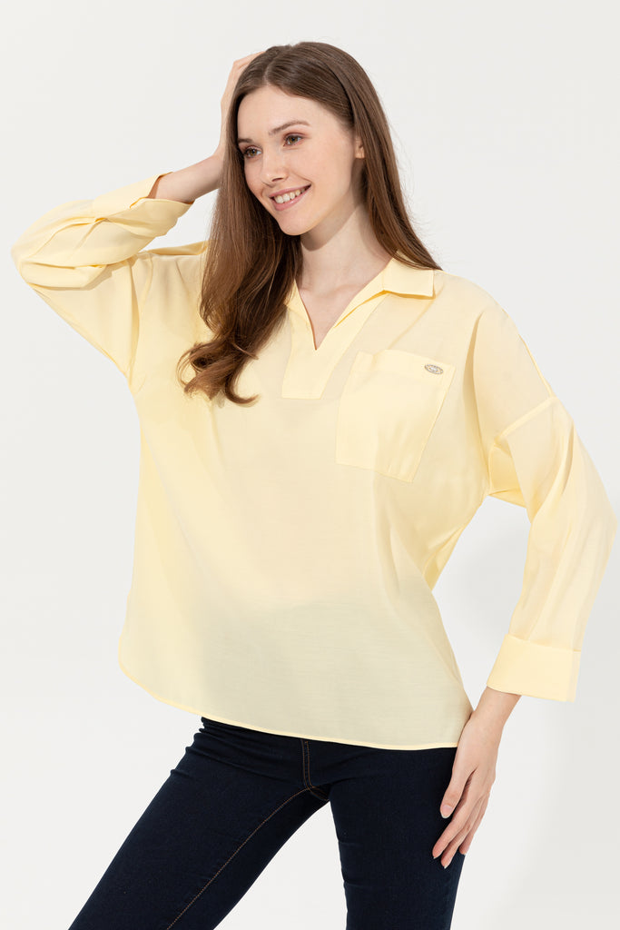 Ova elegantna košulja u svijetloj pastelno žutoj boji donosi dašak svježine i šarma u svaki outfit. Karakteriše je lagani materijal koji osigurava udobnost tokom cijelog dana, a klasičan kroj omogućava lako kombinovanje s raznim odjevnim predmetima. Na prednjem dijelu košulje se nalazi praktična džepna detalj, a dugmići na kragni dodaju dodatnu dozu stila. Ova košulja je savršen izbor za casual izlazak ili poslovne prilike, a može se kombinovati s farmerkama, suknjama ili čak elegantnim hlačama.