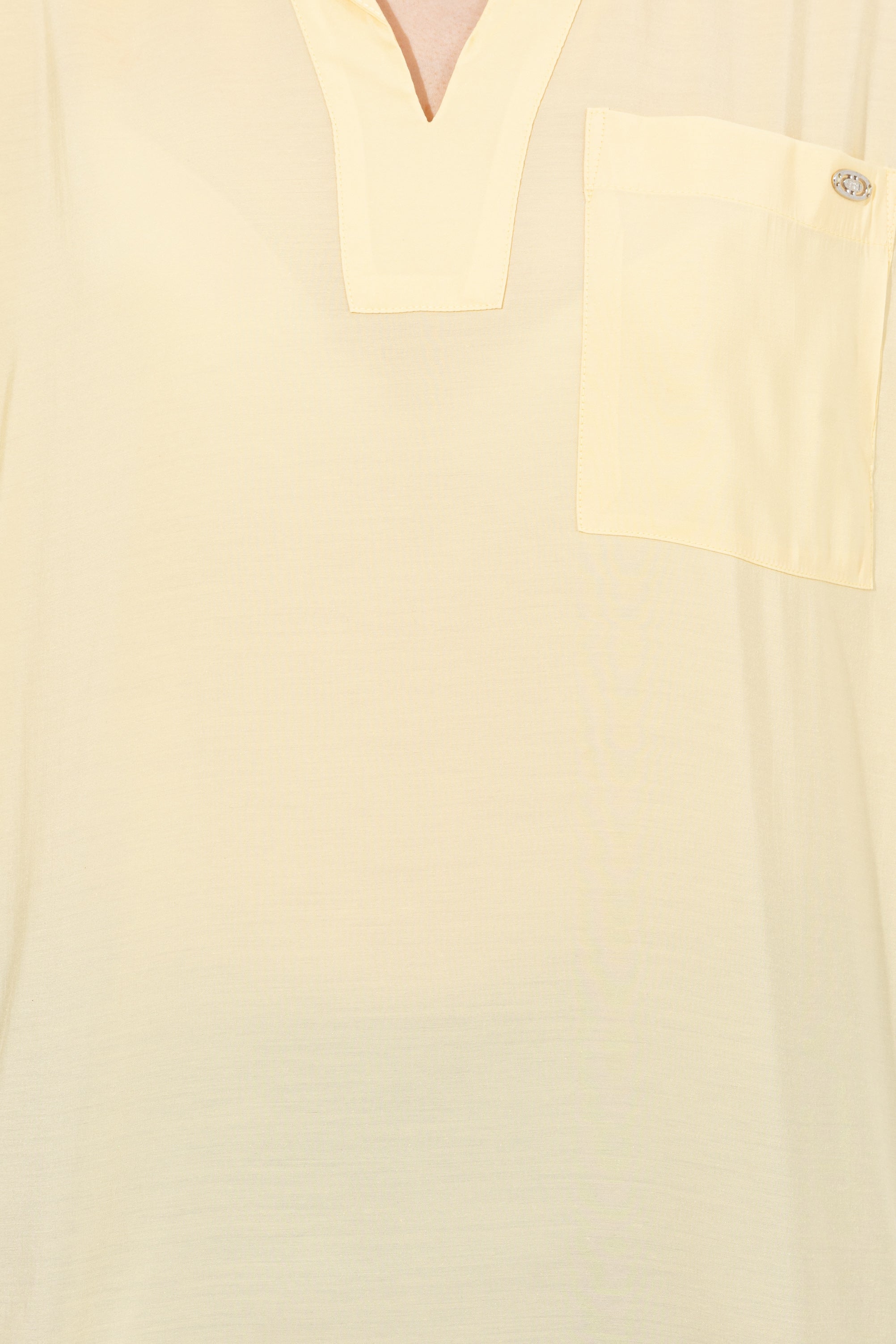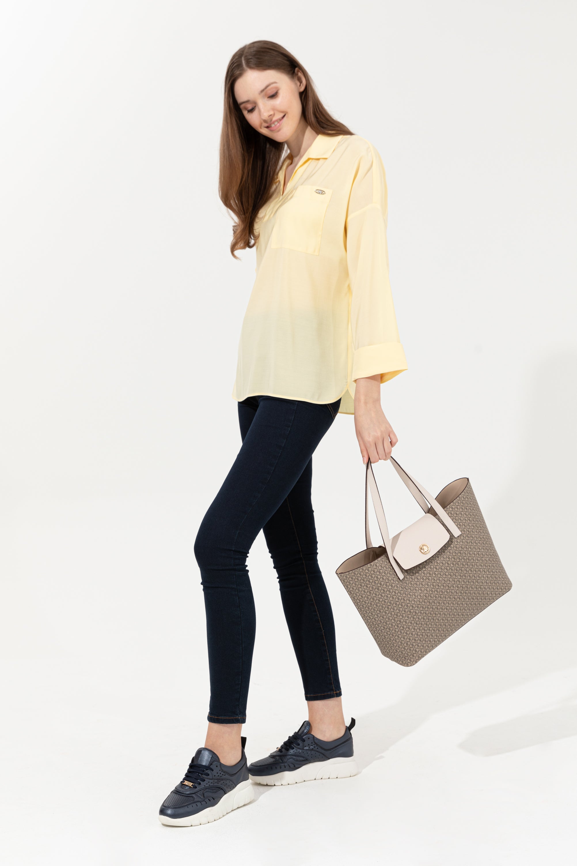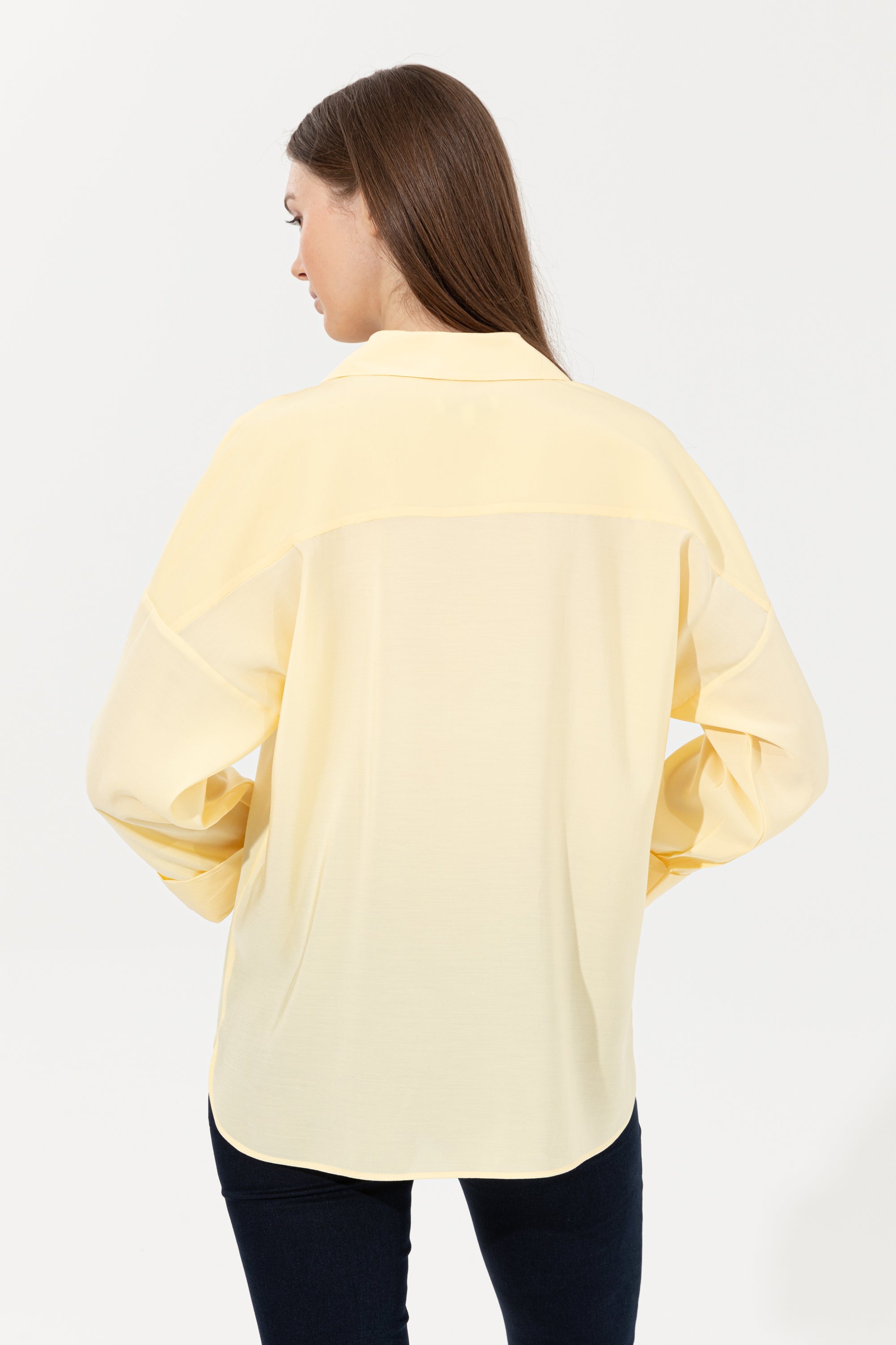 Ova elegantna košulja u svijetloj pastelno žutoj boji donosi dašak svježine i šarma u svaki outfit. Karakteriše je lagani materijal koji osigurava udobnost tokom cijelog dana, a klasičan kroj omogućava lako kombinovanje s raznim odjevnim predmetima. Na prednjem dijelu košulje se nalazi praktična džepna detalj, a dugmići na kragni dodaju dodatnu dozu stila. Ova košulja je savršen izbor za casual izlazak ili poslovne prilike, a može se kombinovati s farmerkama, suknjama ili čak elegantnim hlačama.