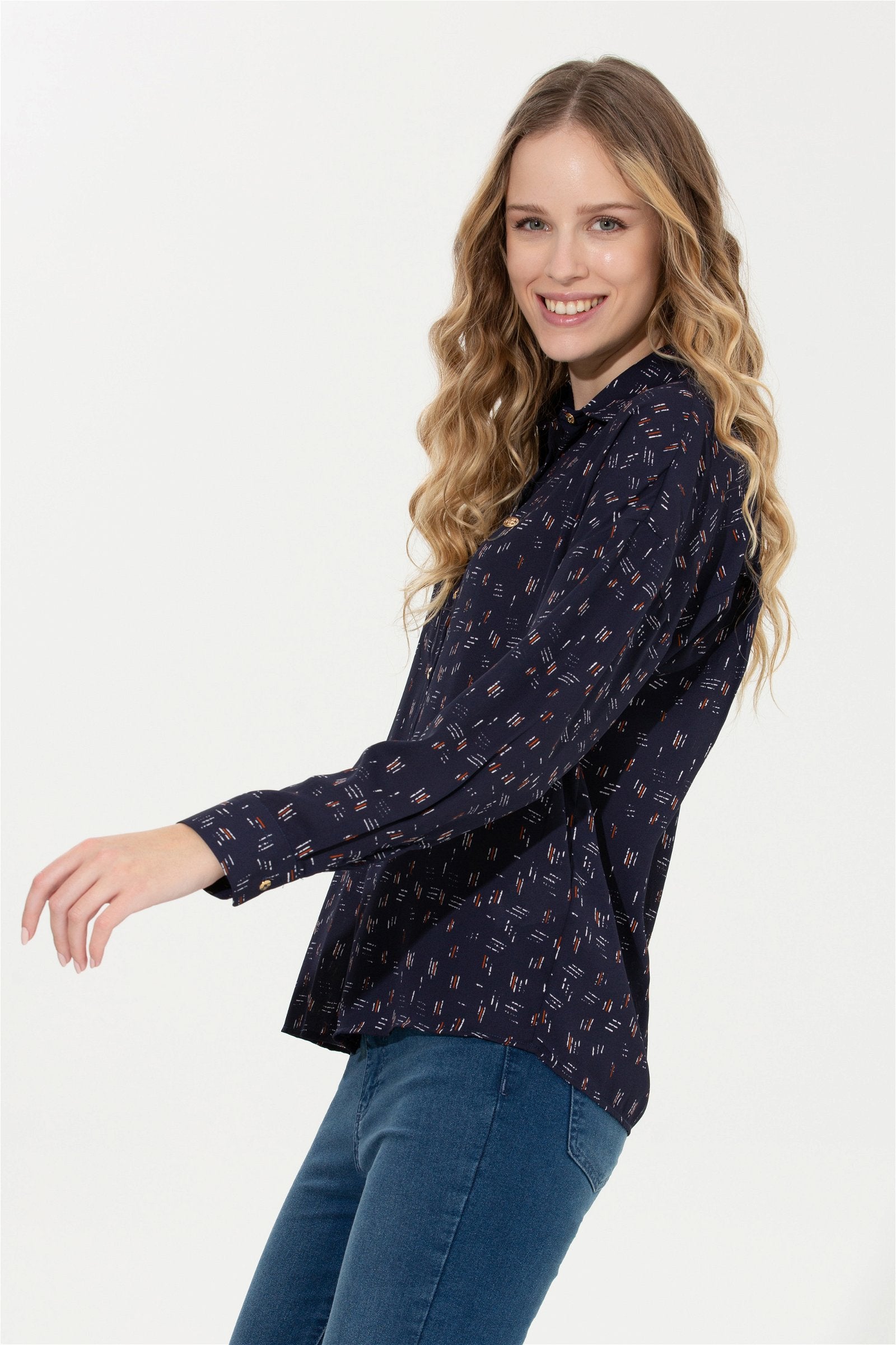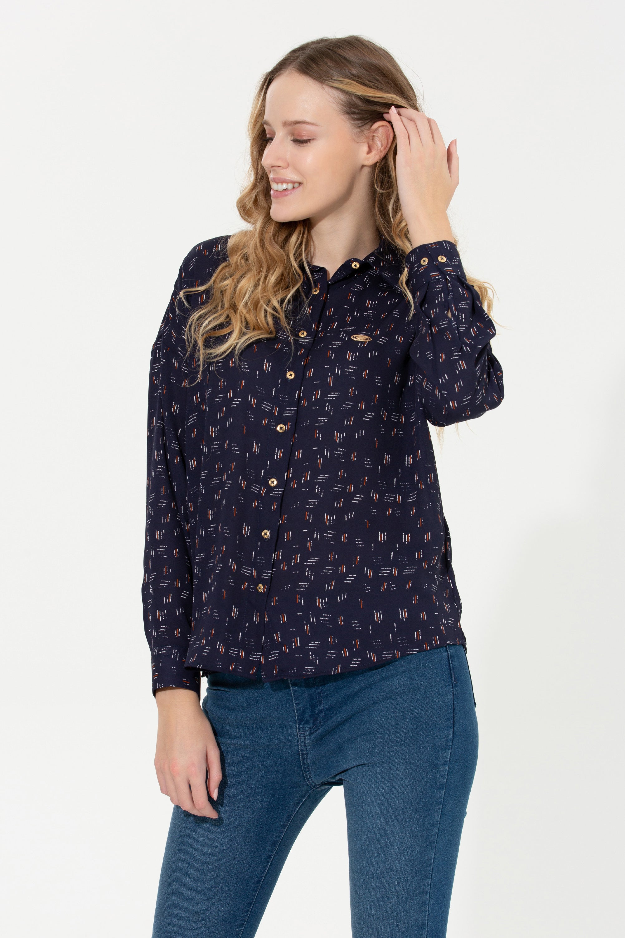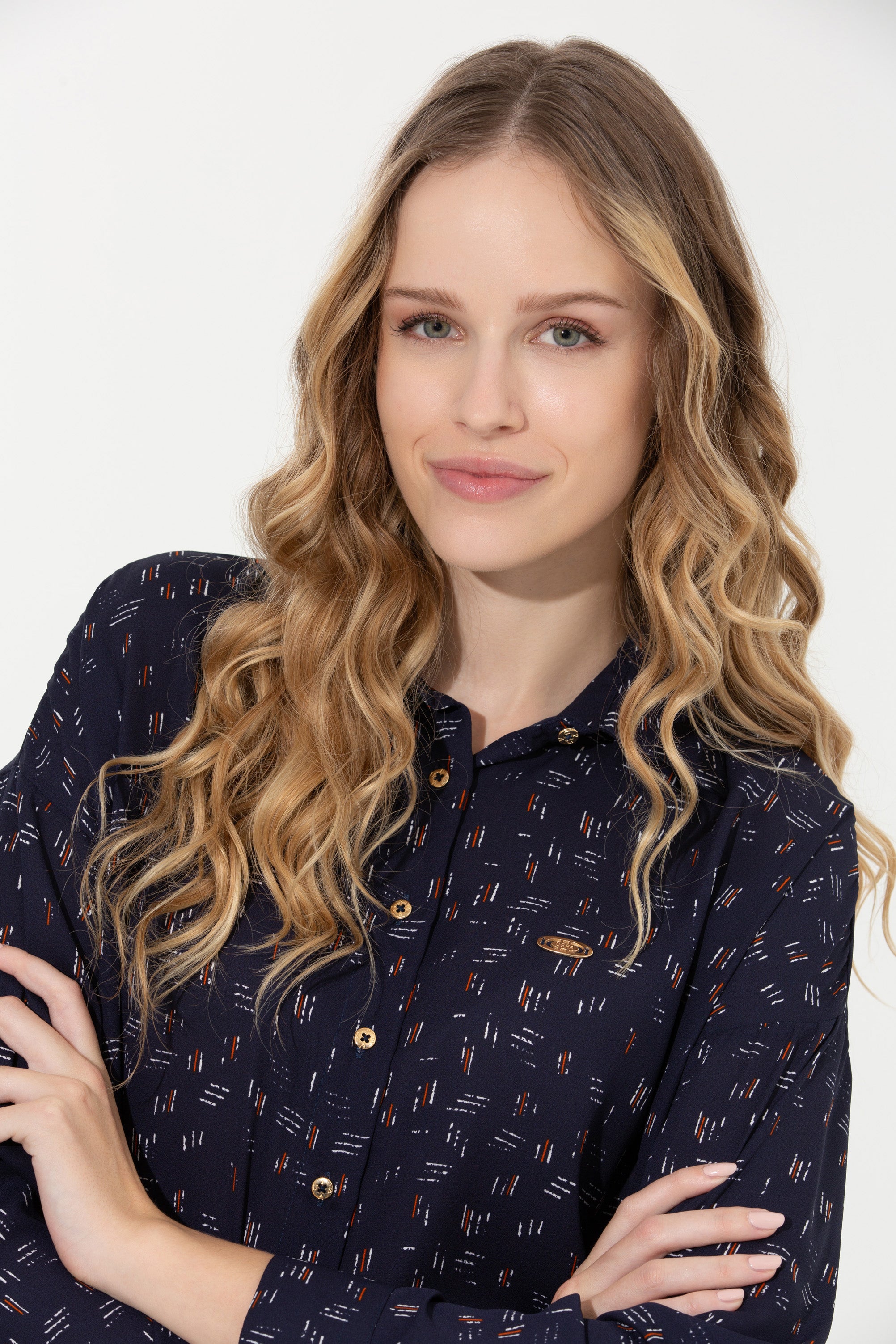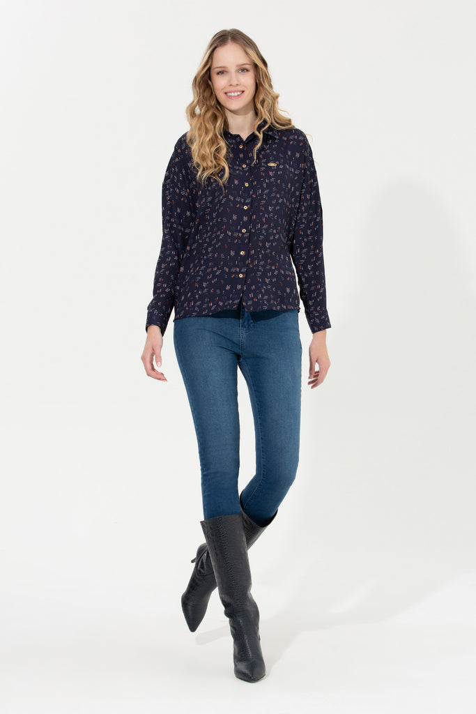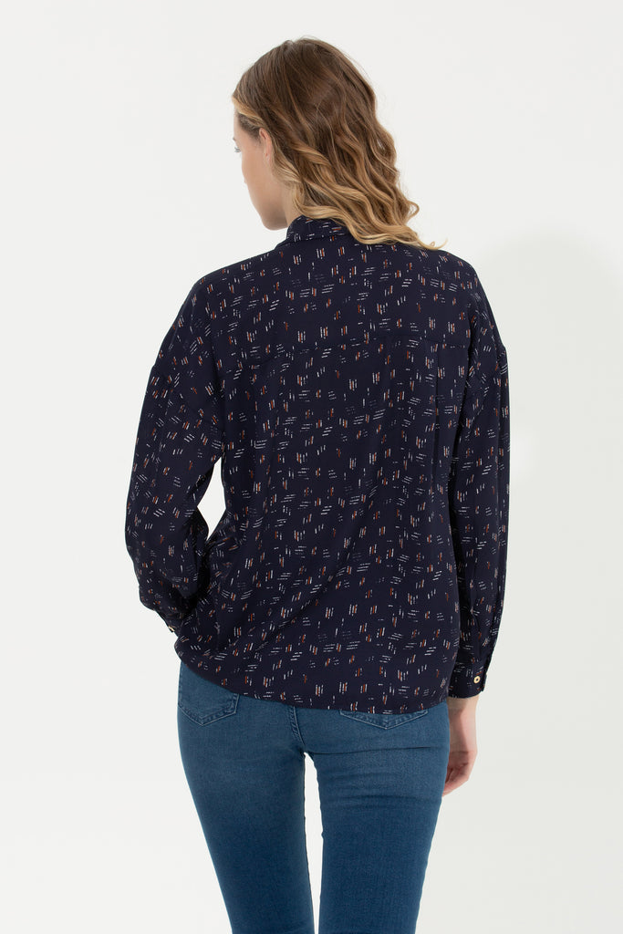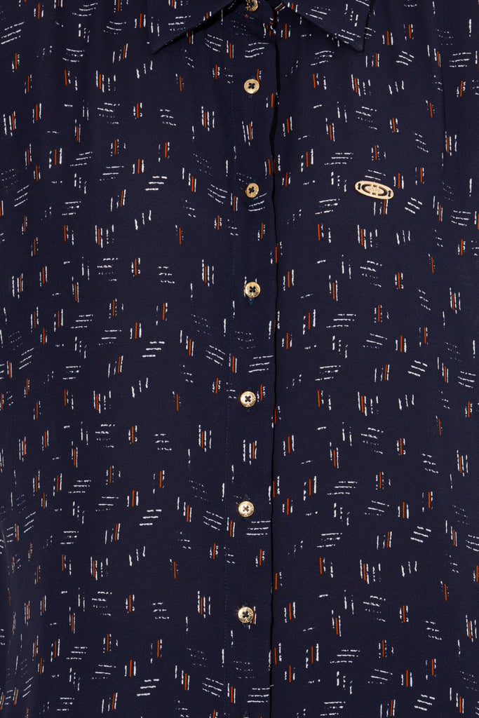 Elegantna košulja u tamnoplavoj boji s delikatnim uzorkom donosi dašak sofisticiranosti bilo kojoj kombinaciji. Karakteriše je lagani, prozračni materijal koji osigurava udobnost tokom cijelog dana, dok klasičan kroj omogućava savršeno pristajanje. Dugih rukava i dugmadi na prednjem dijelu, ova košulja je savršena za poslovne prilike ali i za opuštene izlaske. Mogu se lako kombinovati sa farmerkama ili suknjama, čineći je svestranim komadom u svakom garderoberu. Idealna je za prelazne sezone, pružajući toplinu i stil uz minimalan trud.