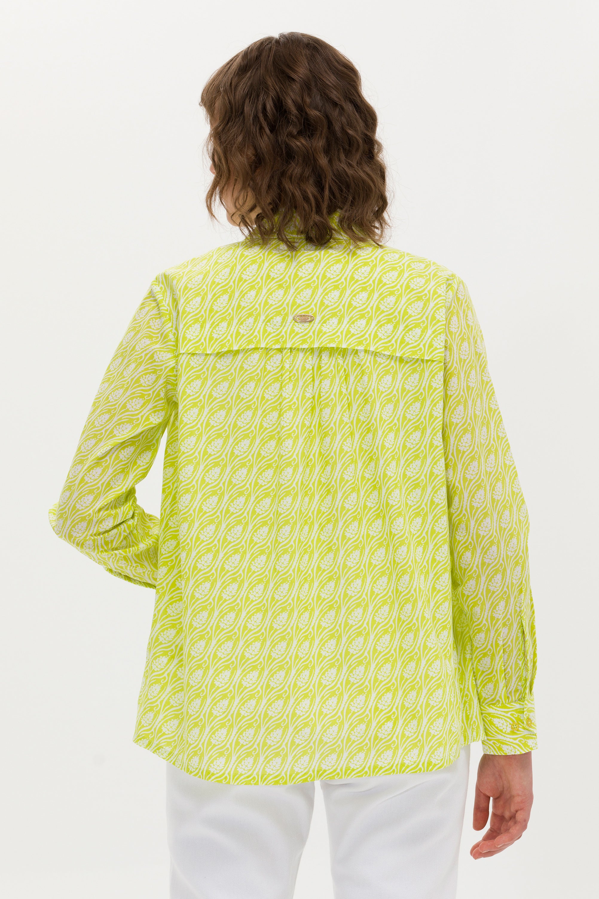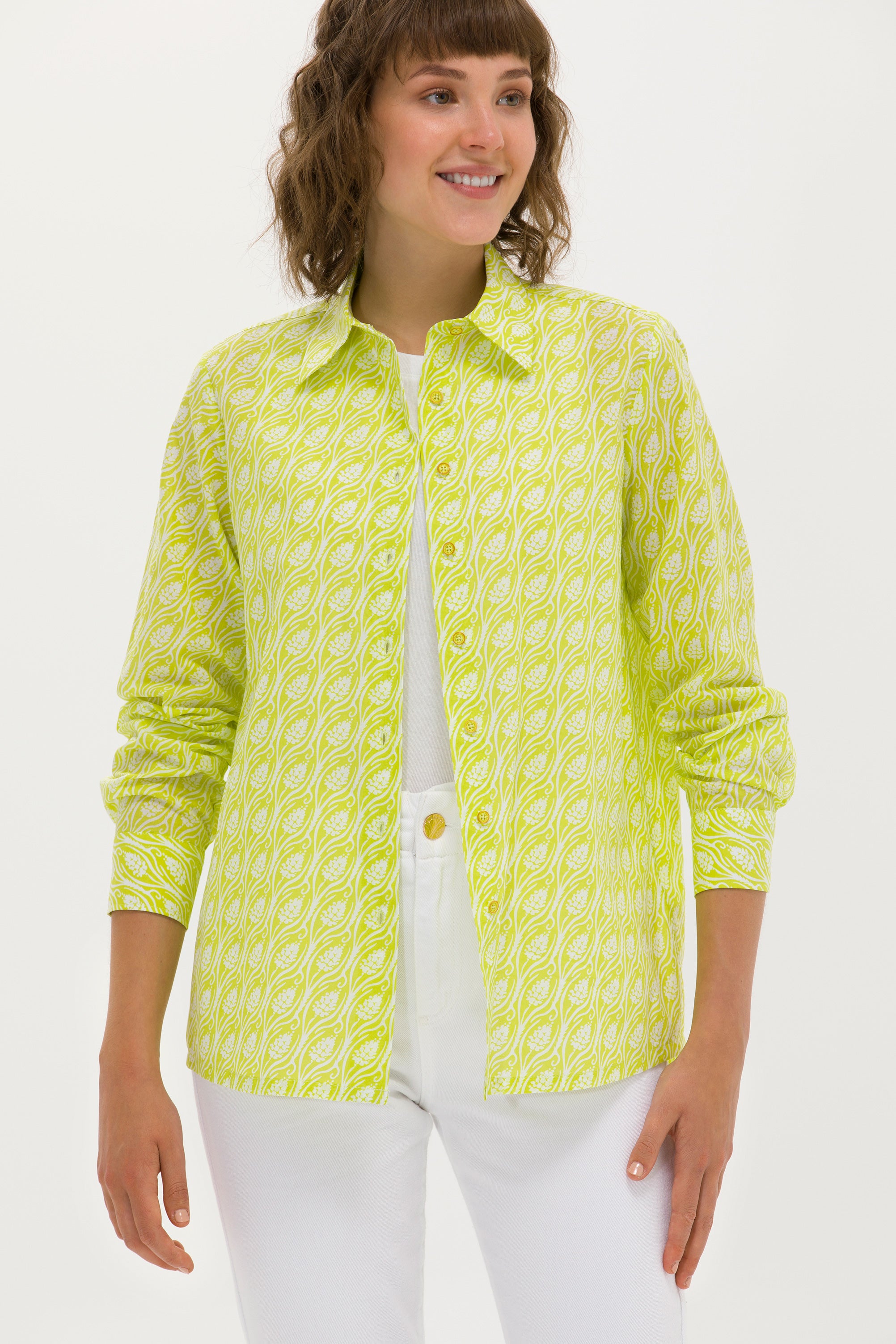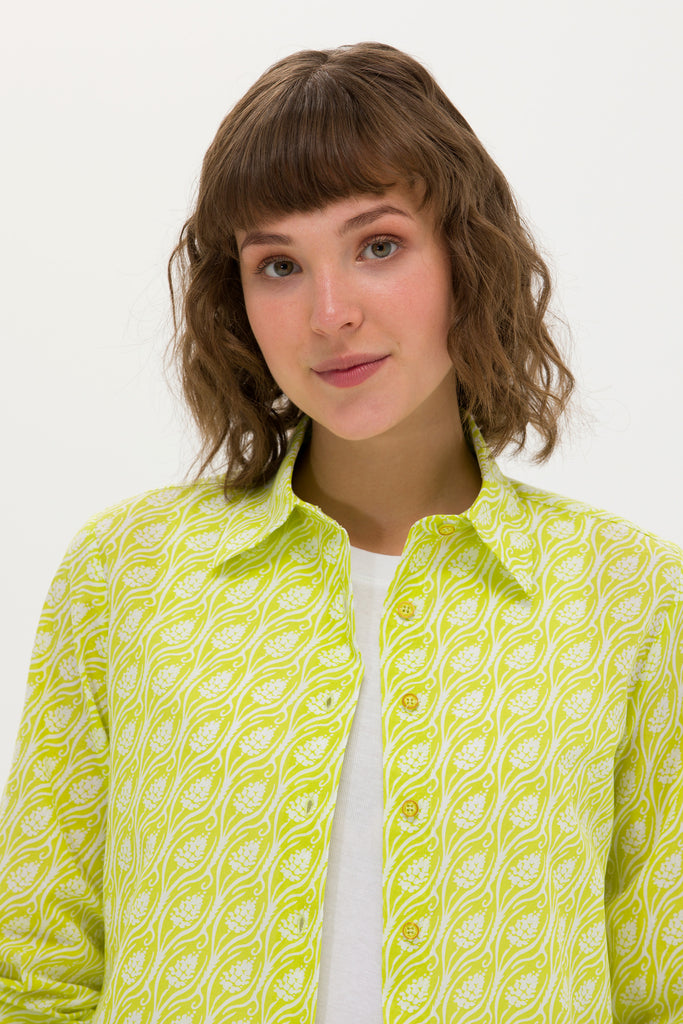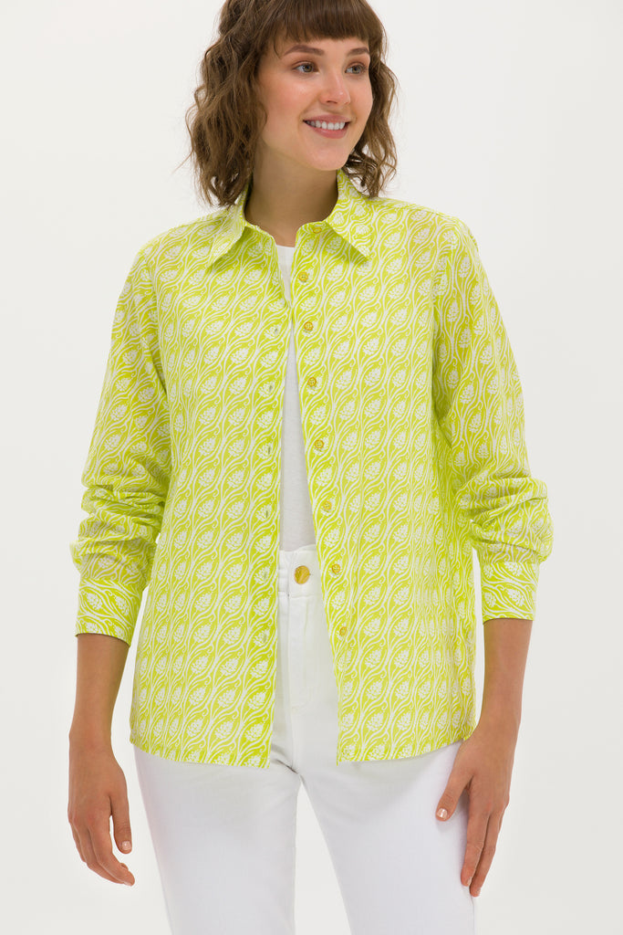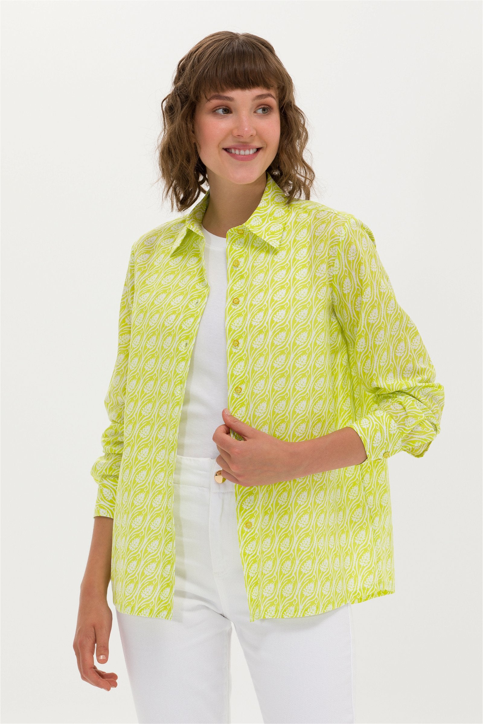 Ova moderna košulja u vibrantnoj limeta boji donosi osvježavajući izgled i savršen je izbor za proljetne i ljetne dane. Karakteriše je lagana i prozračna tkanina koja osigurava udobnost tokom cijelog dana. Njena jedinstvena uzorak u obliku spiralnih motiva dodaje dašak umjetničkog dizajna i čini je posebnim komadom odjeće. Košulja se lako kombinira s različitim stilovima, bilo da se radi o ležernim ili elegantnim kombinacijama, i može se nositi samostalno ili kao slojeviti komad preko majice ili topa. Savršen dodatak za dnevne izlaske ili opuštene večere, ova košulja će sigurno privući pažnju i osvježiti svaki outfit.
