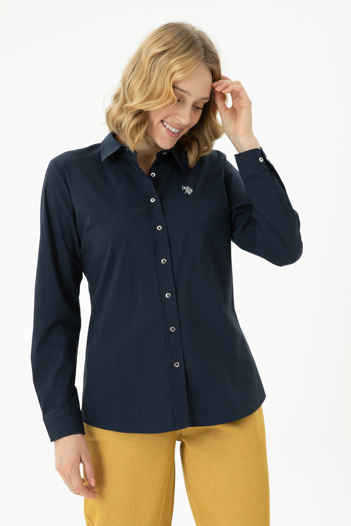 Elegantna košulja u tamnoplavoj boji donosi sofisticiranost svakom outfitu. Karakteriše je klasičan kroj s dugim rukavima, što je čini idealnom za različite prilike, od poslovnih sastanaka do večernjih izlazaka. Na prednjem dijelu košulje nalazi se diskretna vezena oznaka koja dodaje dašak stila i prepoznatljivosti. Ova košulja se lako kombinira s raznim komadima odjeće, poput hlača ili suknji, te je savršen izbor za sveone koje cijene udobnost i modni izričaj.