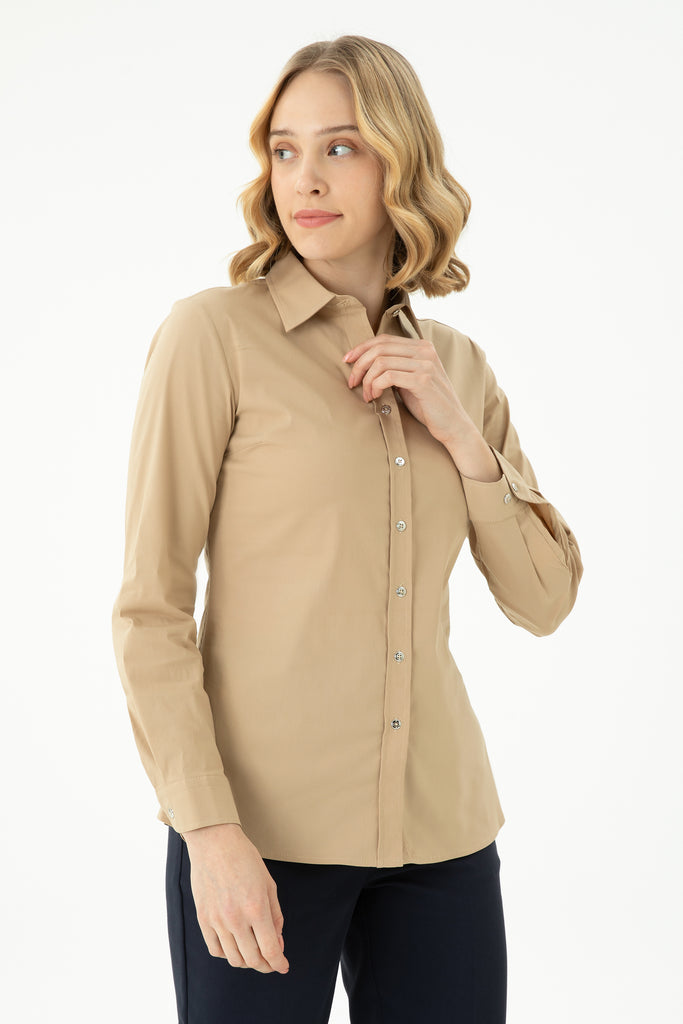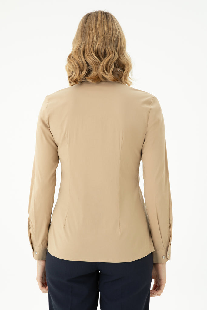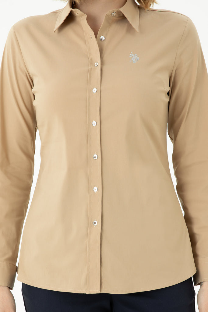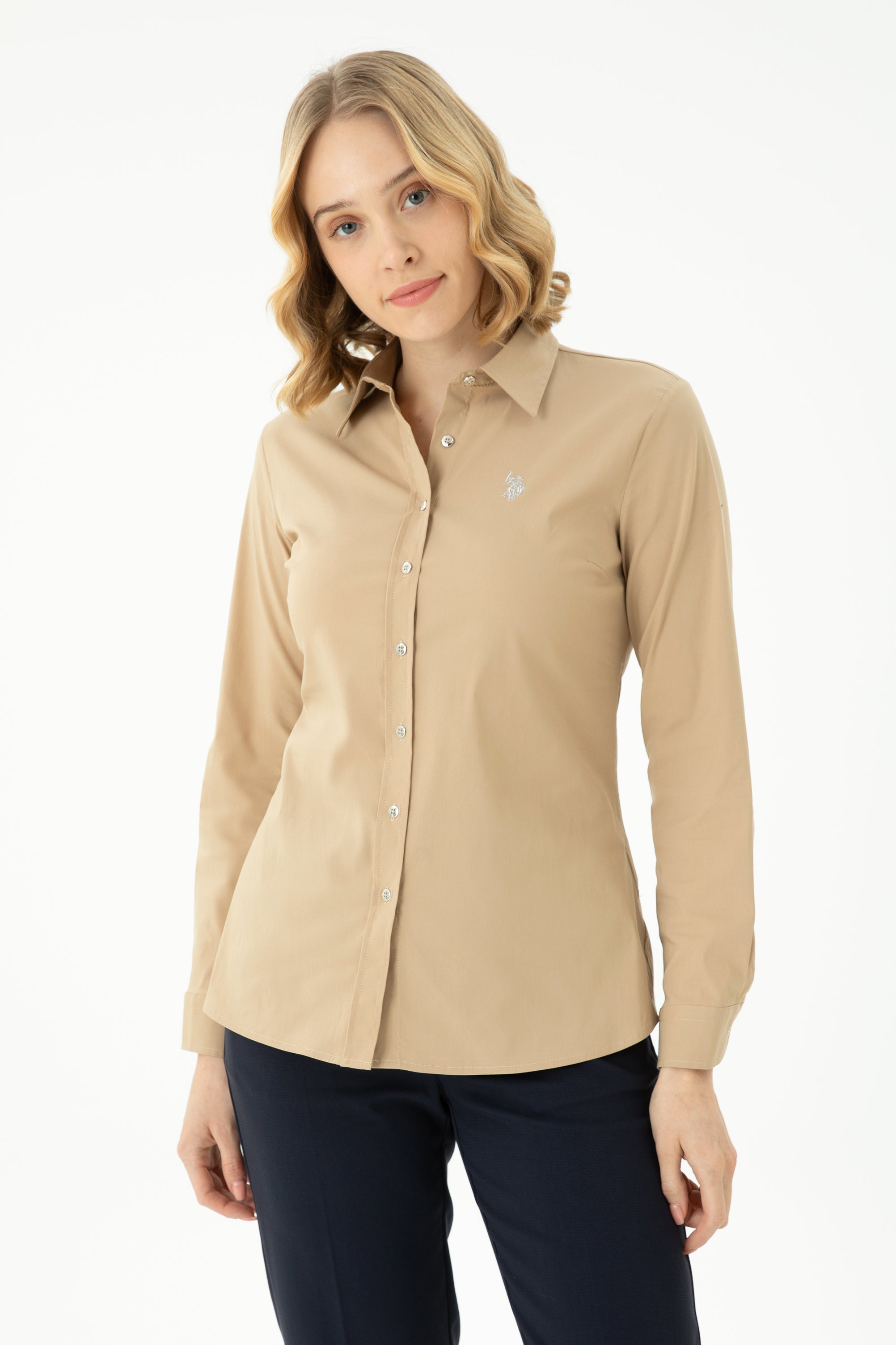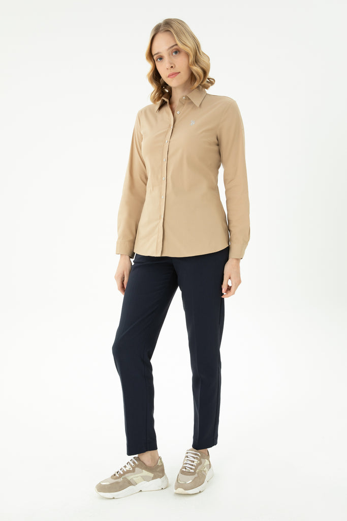 Elegantna košulja u prekrasnoj boji bež pruža sofisticiranost i stil u svakodnevnim kombinacijama. Karakteriše je klasičan kroj sa dugim rukavima i praktičnim dugmadima, što osigurava udobnost i prilagodljivost. Na prednjem dijelu košulje nalazi se diskretni logo, koji dodaje dašak luksuza. Ova košulja je savršen izbor za poslovne prilike, ali i za ležerne izlaske, a može se kombinovati s različitim odjevnim predmetima poput pantalona, suknji ili jakni.
