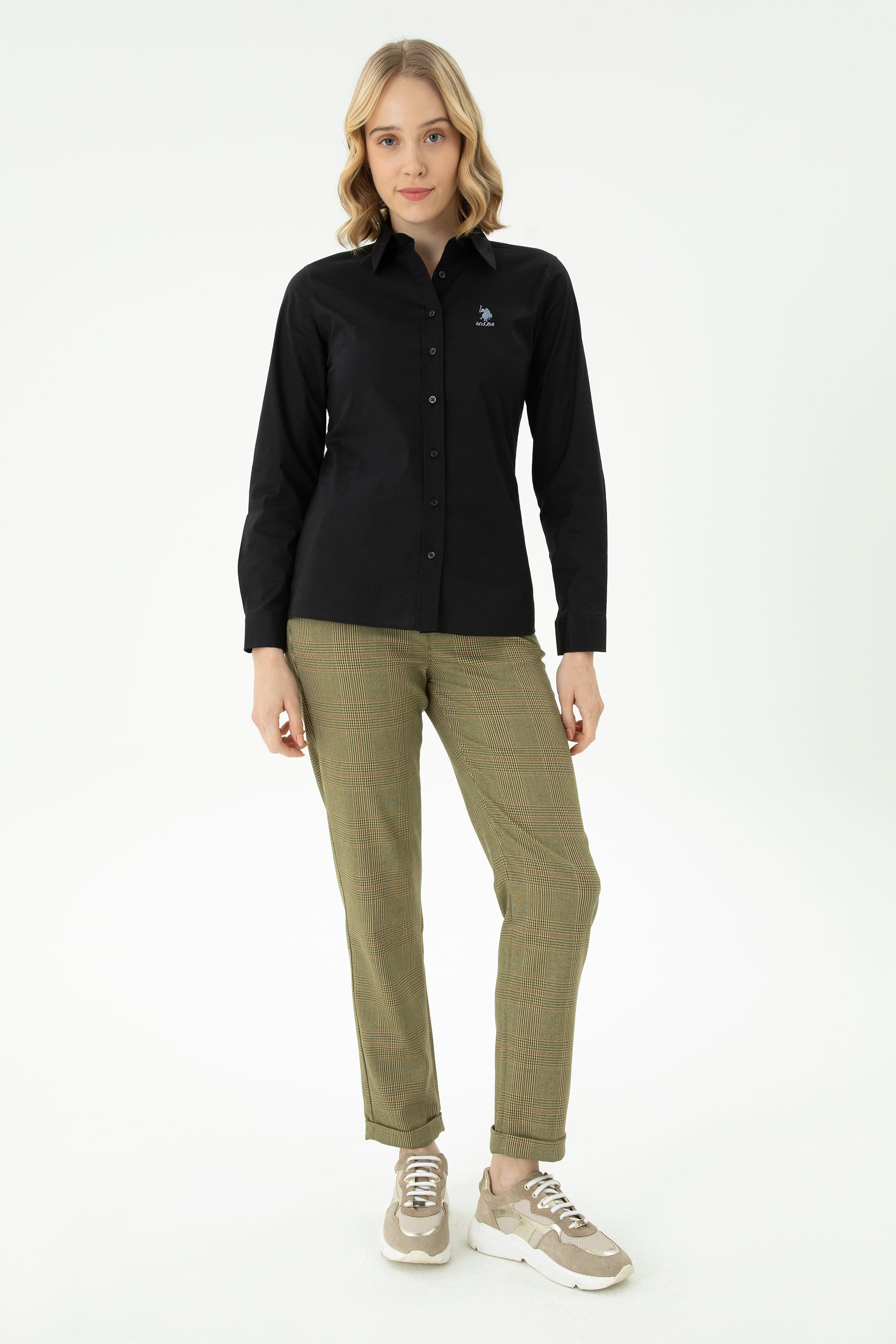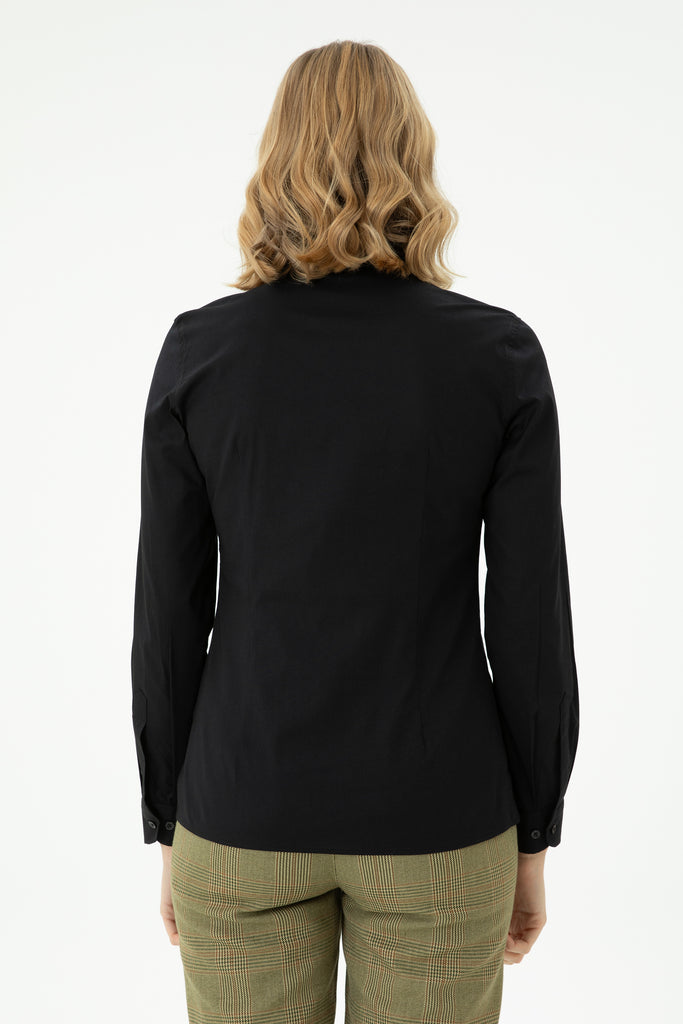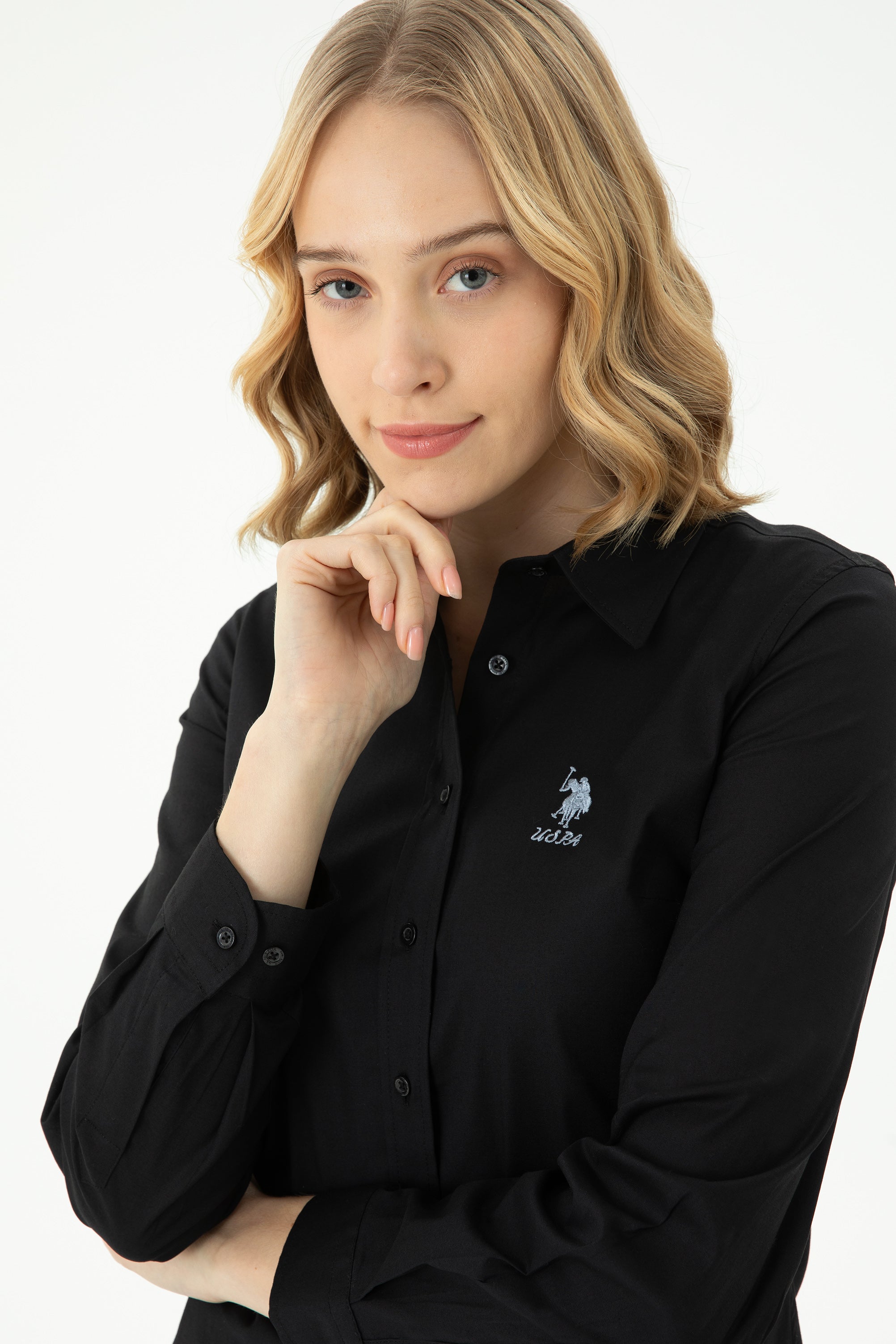Elegantna košulja u klasičnoj crnoj boji je savršen izbor za svakodnevne i poslovne prilike. Karakteriše je udoban kroj koji osigurava slobodu pokreta i stilski efekat. Na prednjem dijelu košulje nalazi se diskretni logo koji dodaje notu prefinjenosti. Ova košulja se lako može kombinovati sa različitim odjevnim predmetima kao što su klasične pantalone, suknje ili džins, čineći je svestranim komadom za vašu garderobu. Savršena je za stvaranje sofisticiranih izgleda, bez obzira na priliku.