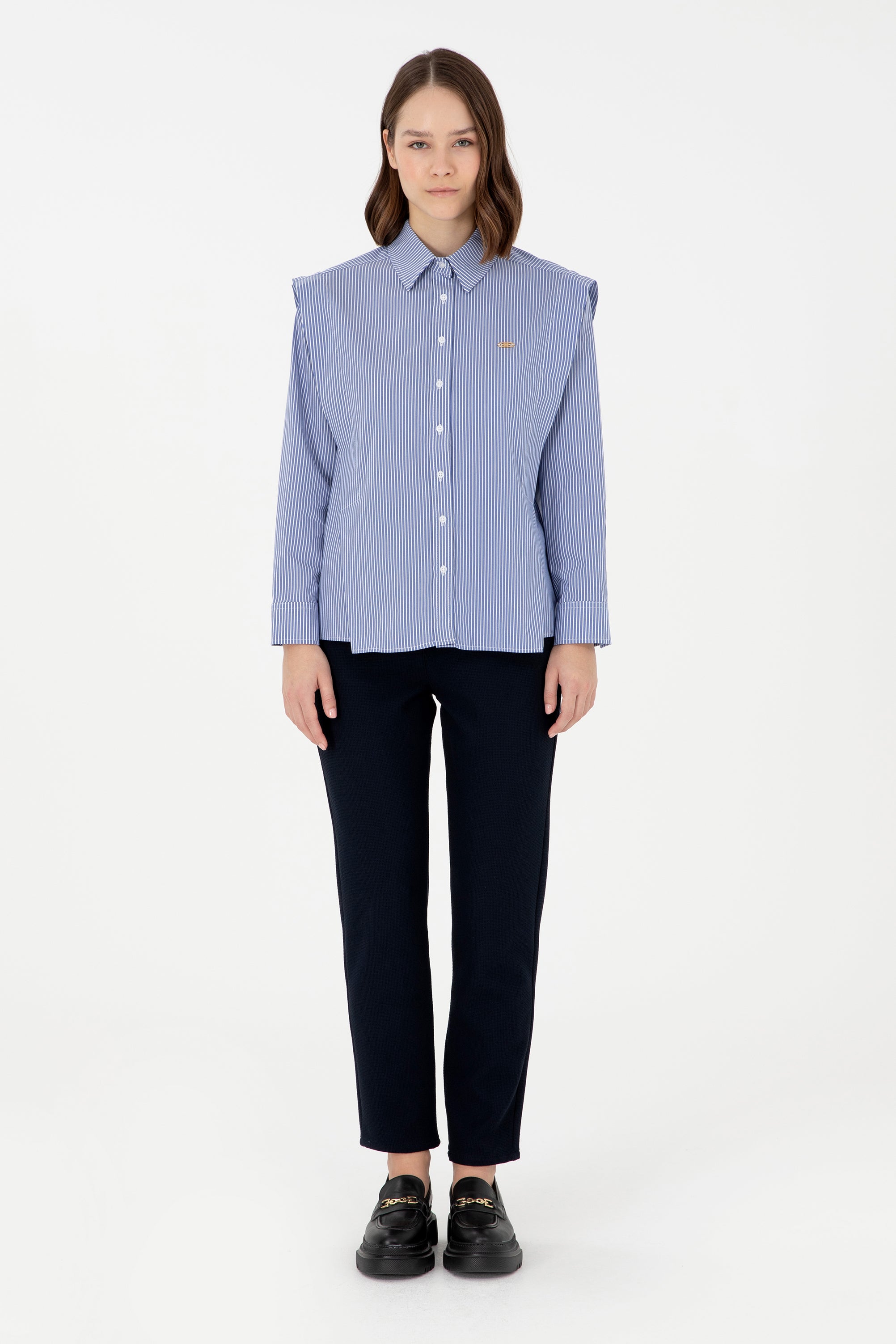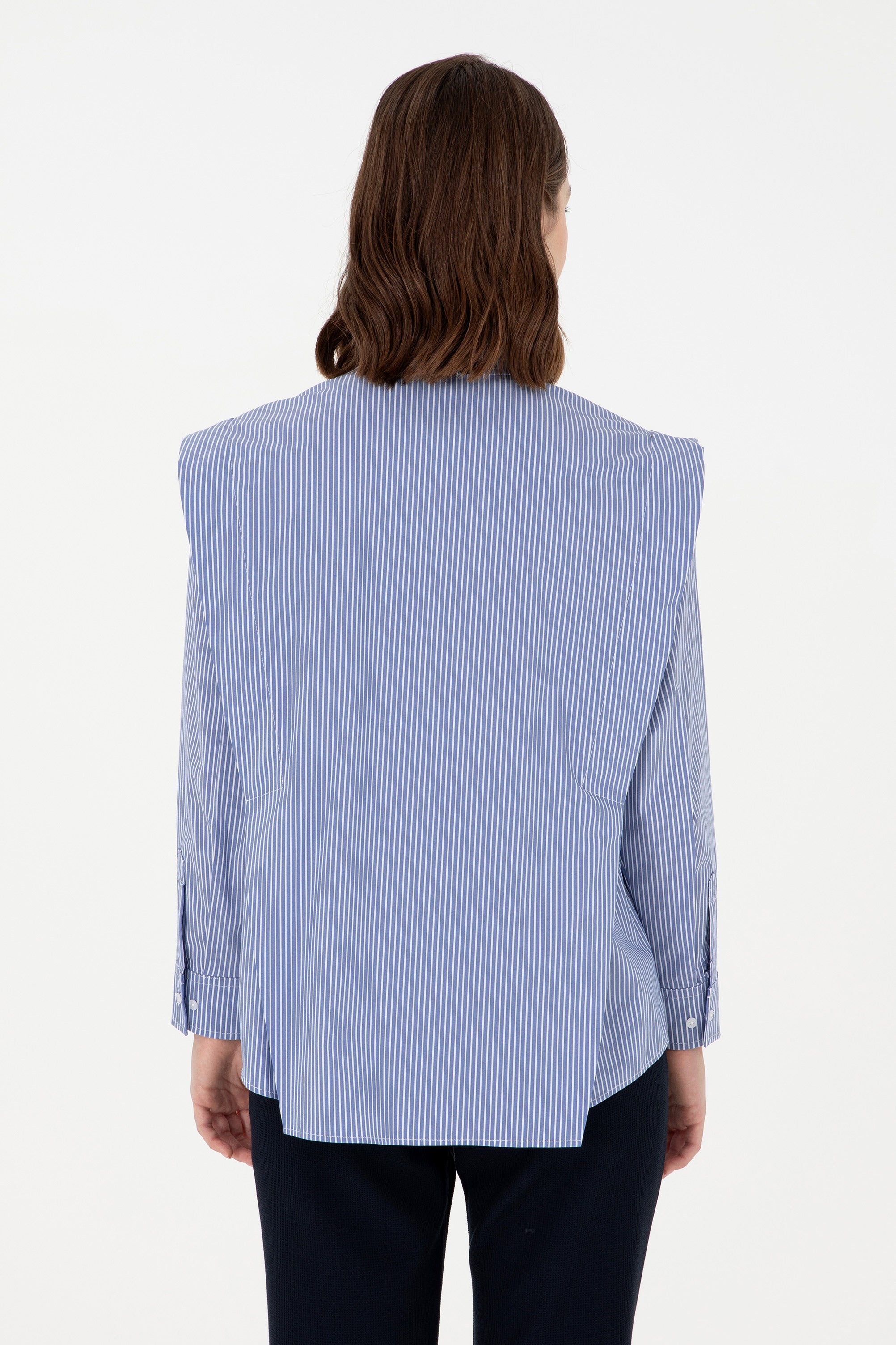 Ova košulja u klasičnoj plavoj boji sa finim prugastim uzorkom donosi modernu eleganciju sa svakim outfitom. Izrađena je od laganog i prozračnog materijala koji osigurava udobnost tokom cijelog dana. Karakteristični detalj su široki rameni dijelovi koji košulji daju jedinstven i sofisticiran izgled. Na prednjem dijelu se nalazi diskretna logo oznaka koja dodatno ističe kvalitet. Ova košulja je savršen izbor za poslovne prilike ili casual izlazak, a lako se može kombinovati sa različitim hlačama ili suknjama za stvaranje stila koji će privući poglede.