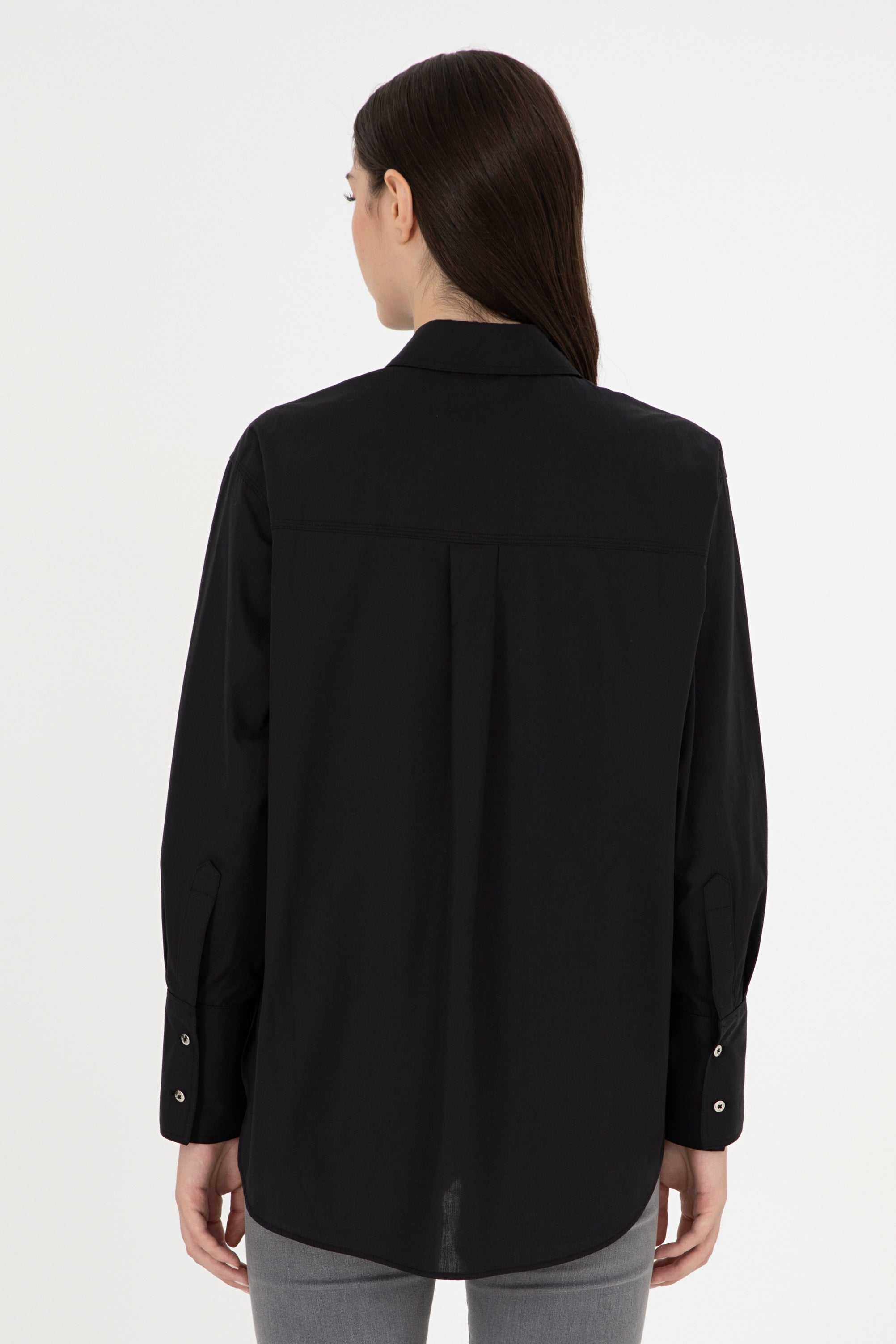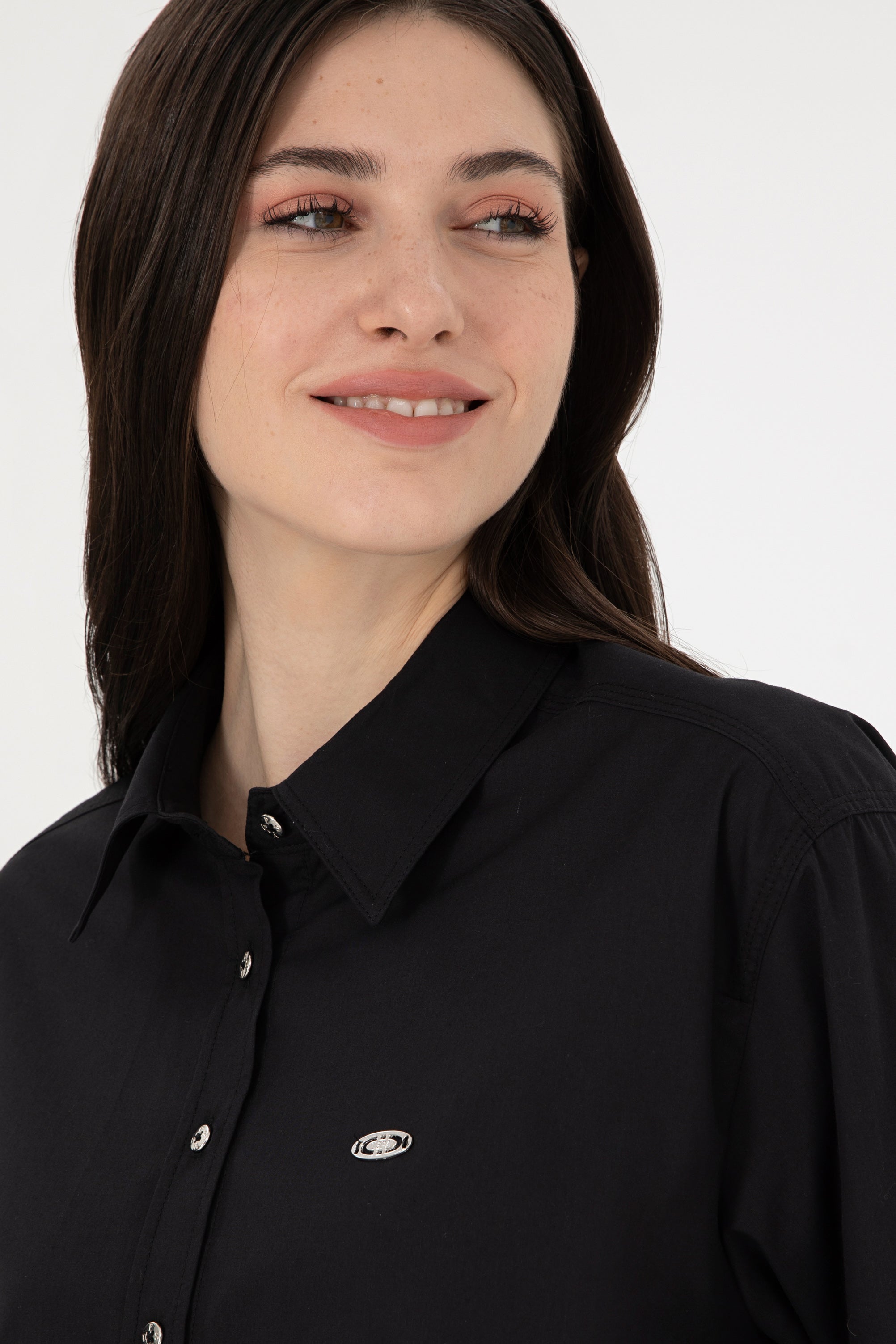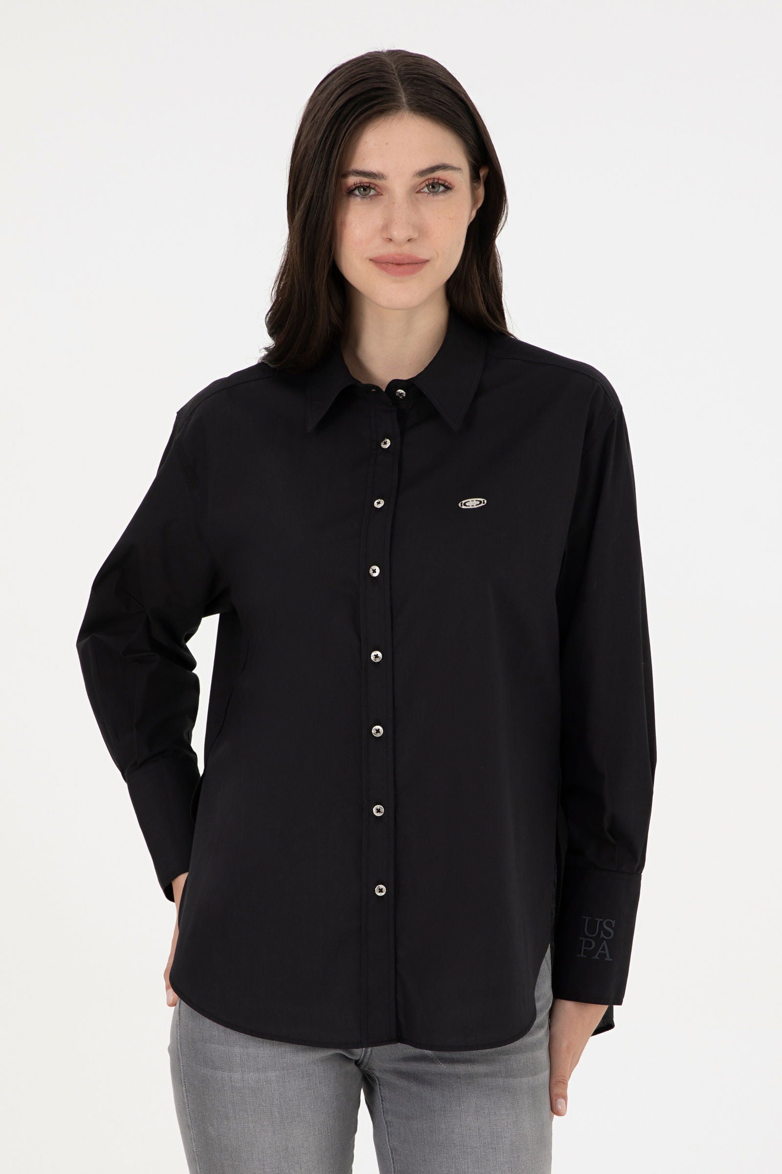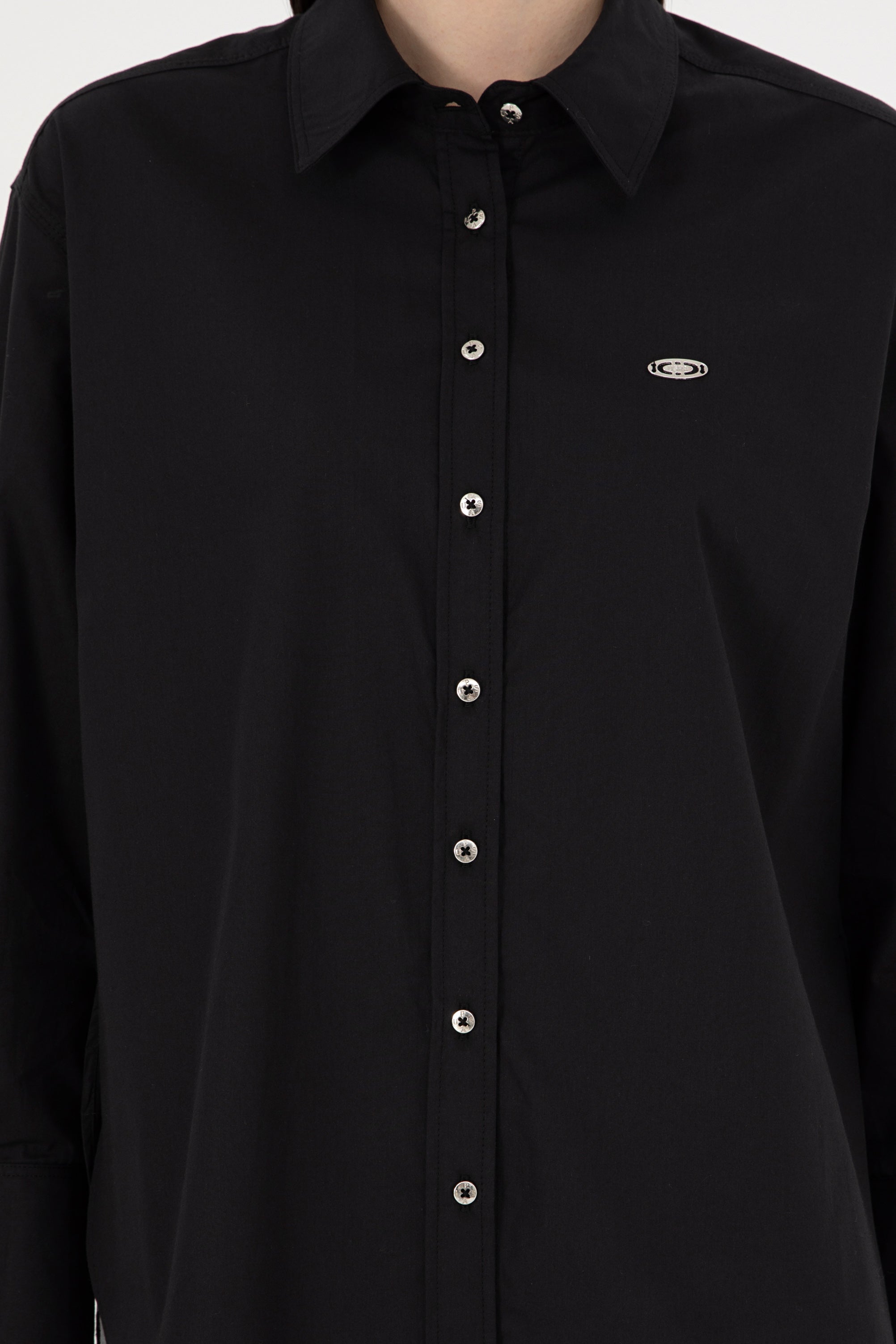 Elegantna košulja u klasičnoj crnoj boji donosi sofisticiranost i svestranost svakom stilu. Karakterišu je udoban kroj i kvalitetan materijal koji omogućava lako kretanje i udobnost tokom cijelog dana. Dugih rukava sa manžetama, ova košulja može se nositi samostalno ili uz slojevito odijevanje. Na prednjem dijelu se nalazi suptilan logotip koji dodaje moderni pečat. Ova košulja je savršen izbor za poslovne sastanke ili upravo za opuštene prilike, a lako se kombinira s raznim hlačama ili suknjama, čineći je neizostavnim dijelom svake garderobe.