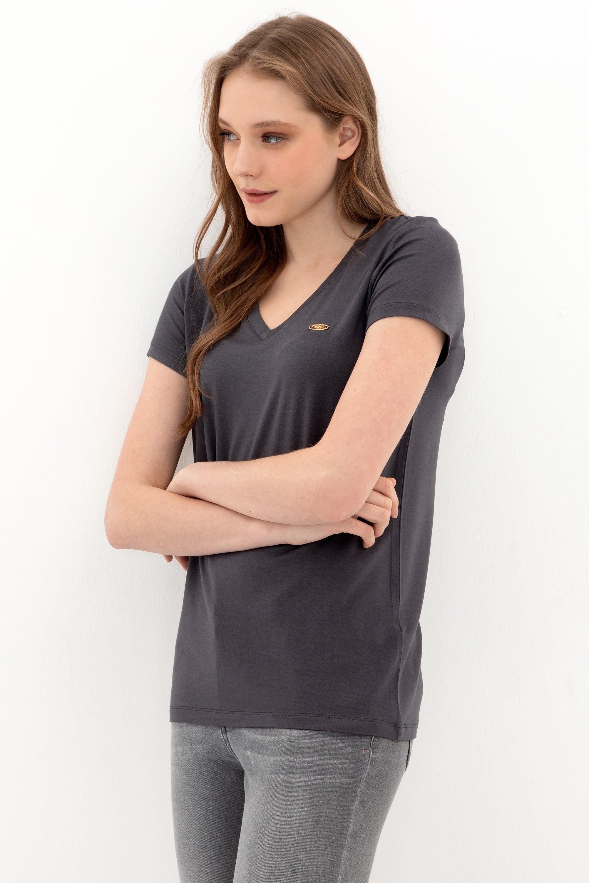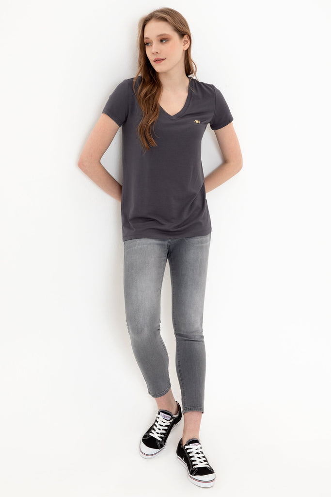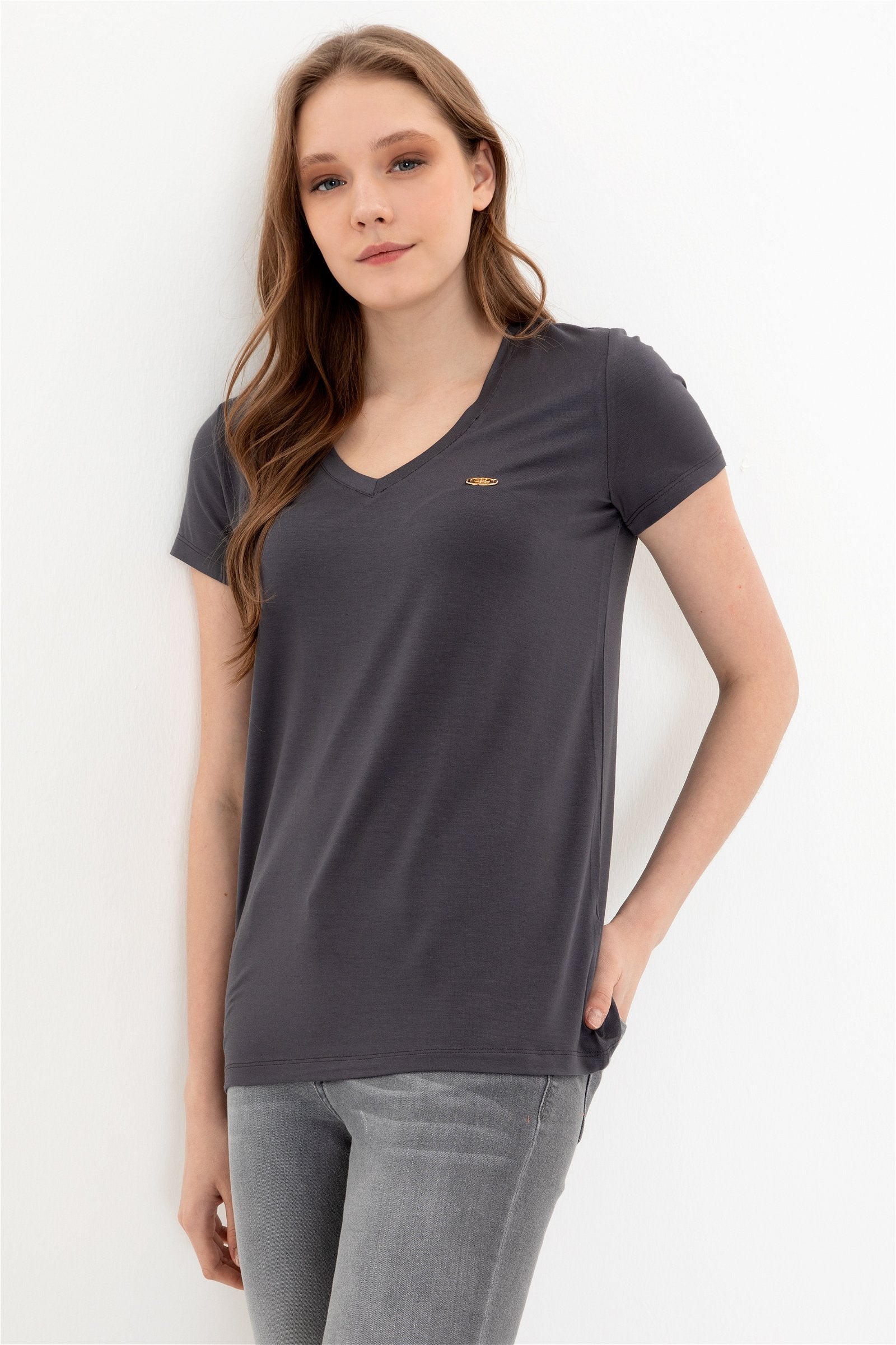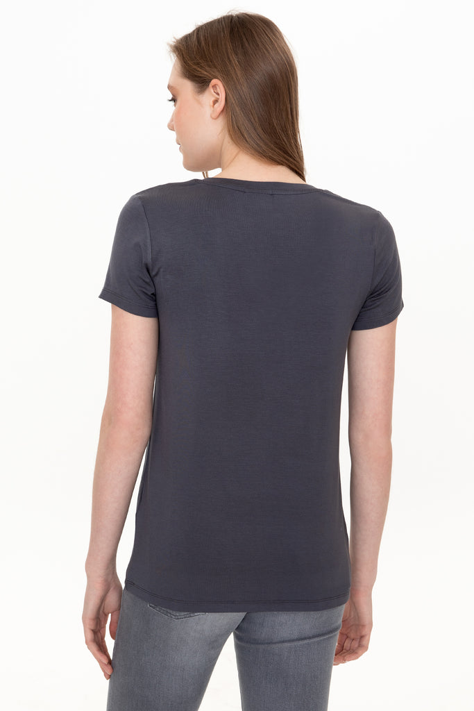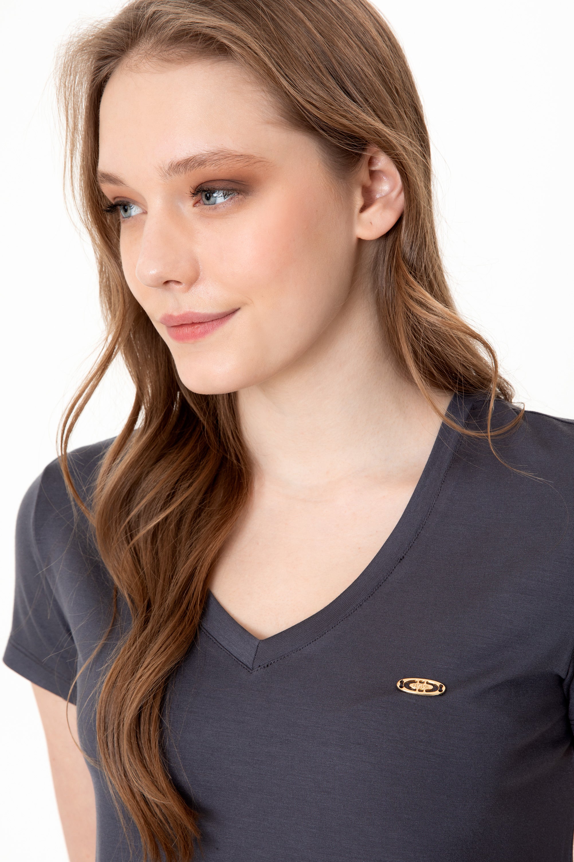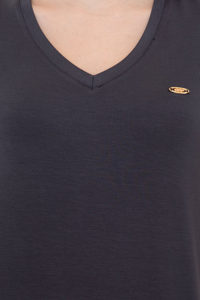 Moderna majica u elegantnoj tamno sivoj boji donosi savršenu kombinaciju udobnosti i stila, idealna za svakodnevno nošenje. Karakterišu je lagani materijal koji pruža prozračnost i mekanu strukturu koja se prilagođava tijelu. V-izrez naglašava elegantan izgled, dok diskretan logotip na prednjem dijelu dodaje modernu notu. Ova majica se lako kombinira s različitim odjevnim predmetima, bilo da se radi o trapericama, suknjama ili sportskim hlačama, čineći je savršenim izborom za svaki casual izlazak ili opuštanje.