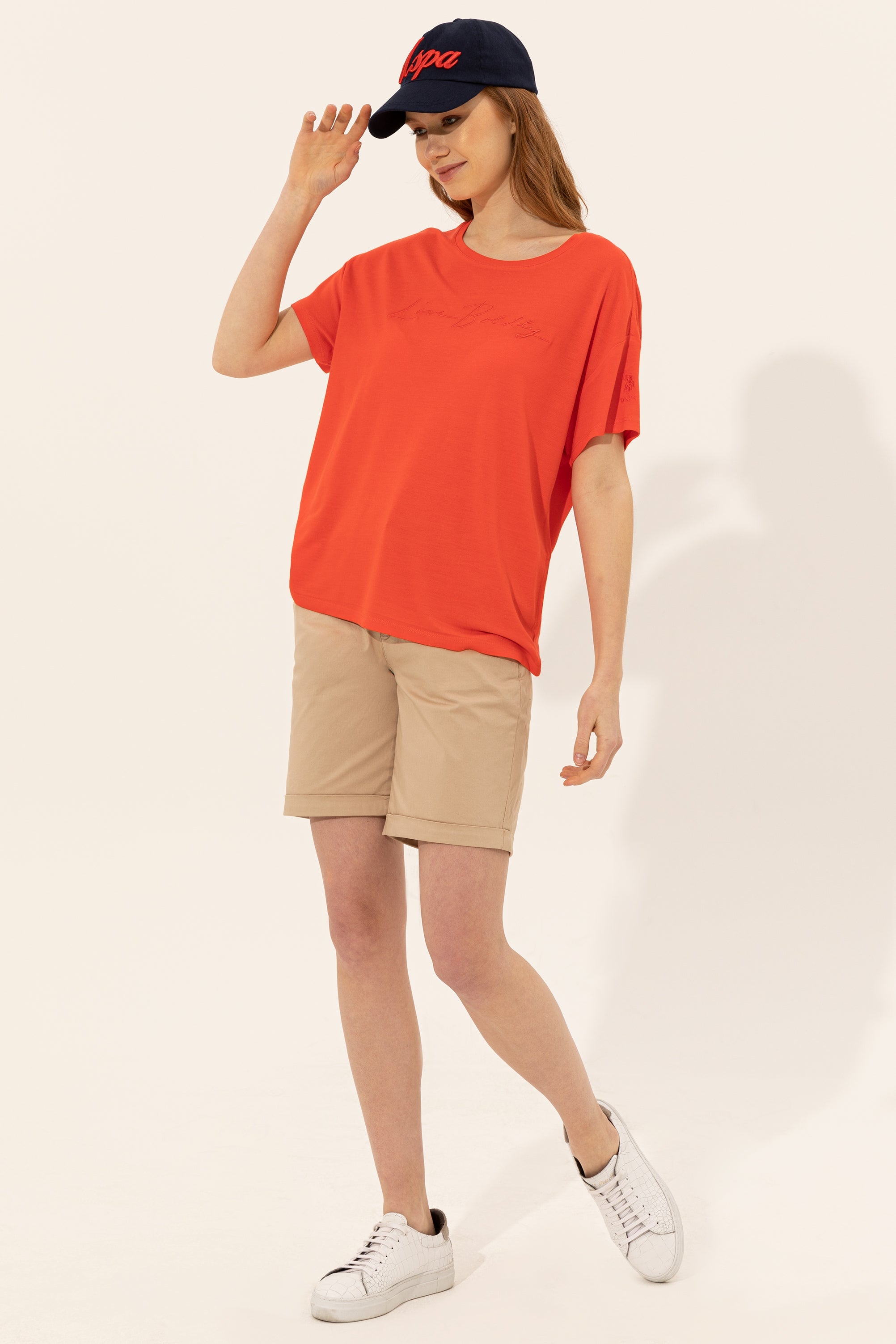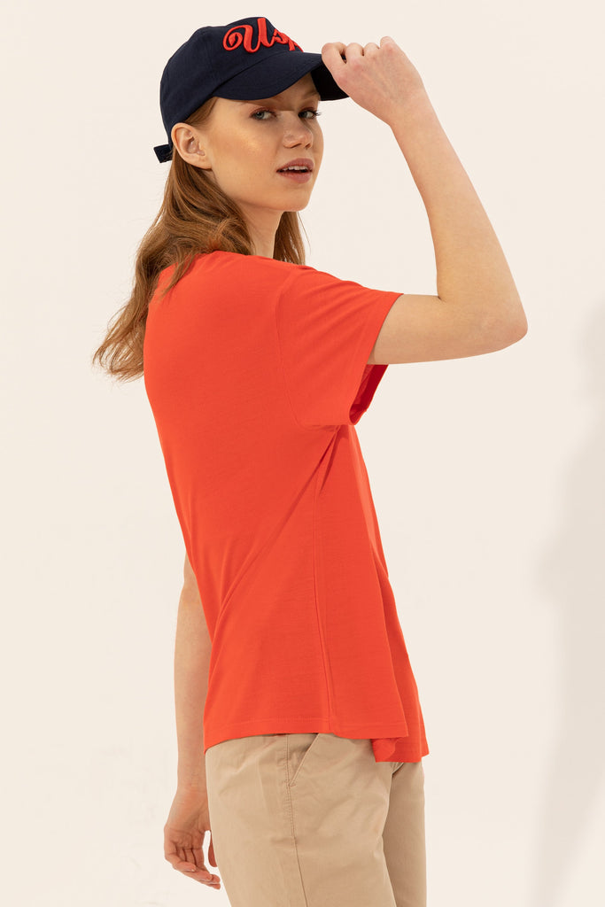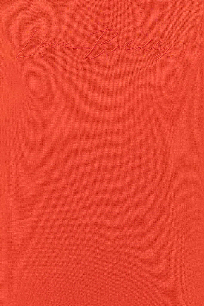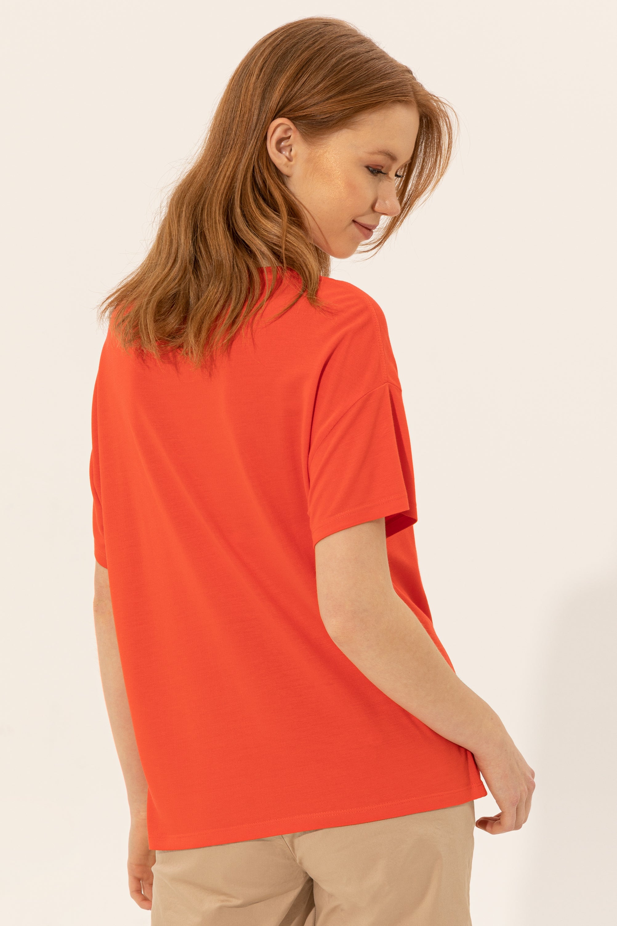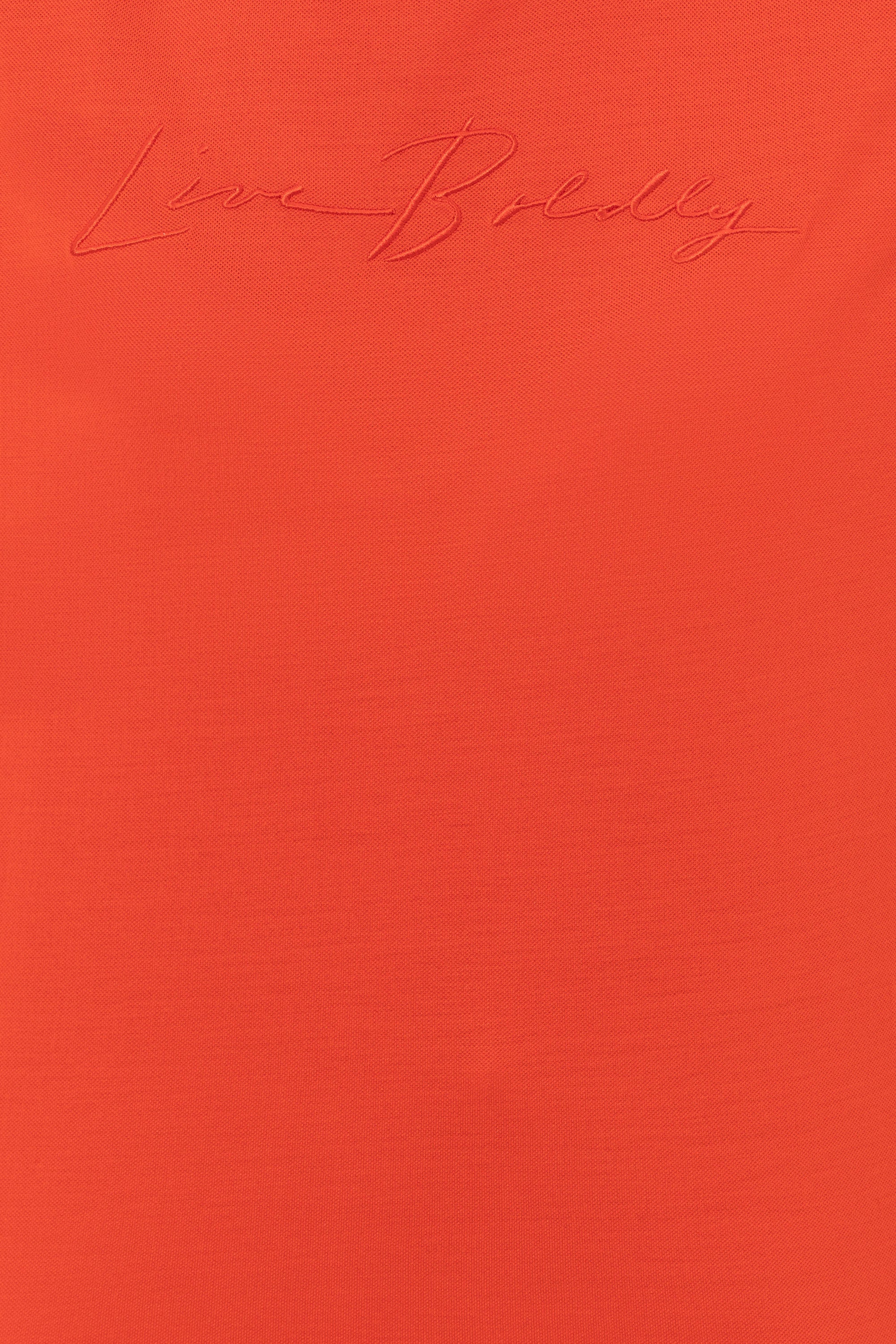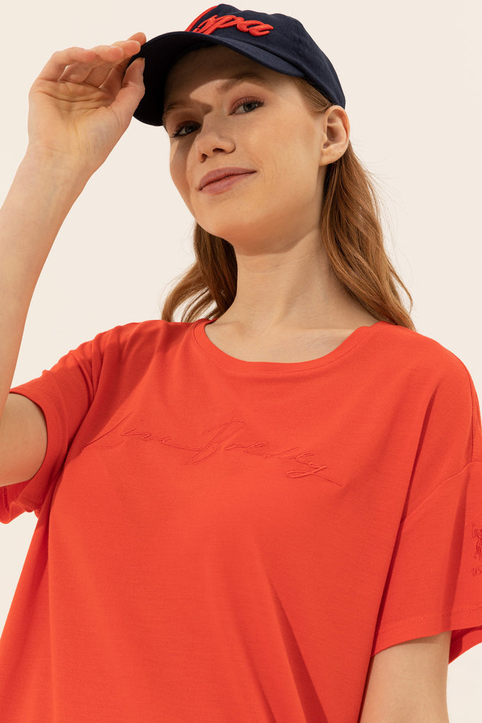 Ova moderni majica u vibrantnoj crvenoj boji donosi svježinu i energiju svakodnevnim kombinacijama. Karakteriše je lagani, prozračni materijal koji osigurava udobnost tokom cijelog dana. Diskretan natpis na prednjem dijelu dodatno ističe njen jedinstveni stil. Ova majica je savršen izbor za ležerne prilike, bilo da se radi o izlasku s prijateljima ili opuštenoj šetnji, a lako se može kombinovati s farmerkama, šortsevima ili čak suknjama.