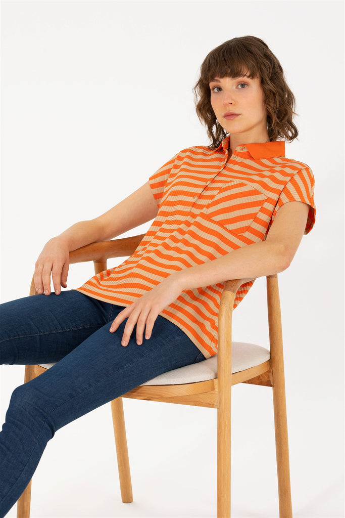 Ova elegantna polo majica u živahnoj narandžastoj boji sa upadljivim prugama donosi moderni izgled i udobnost tokom cijelog dana. Karakteriše je mekani pamučni materijal koji pruža prijatan osjećaj na koži, a kratki rukavi omogućavaju slobodu kretanja. Na prednjem dijelu majice nalazi se praktična džepić koja dodaje dašak praktičnosti i stila. Ova polo majica je idealan izbor za ležerne dnevne kombinacije, bilo da se radi o izlasku s prijateljima ili opuštanju kod kuće, a lako se može kombinovati sa farmerkama, šortsevima ili suknjama.