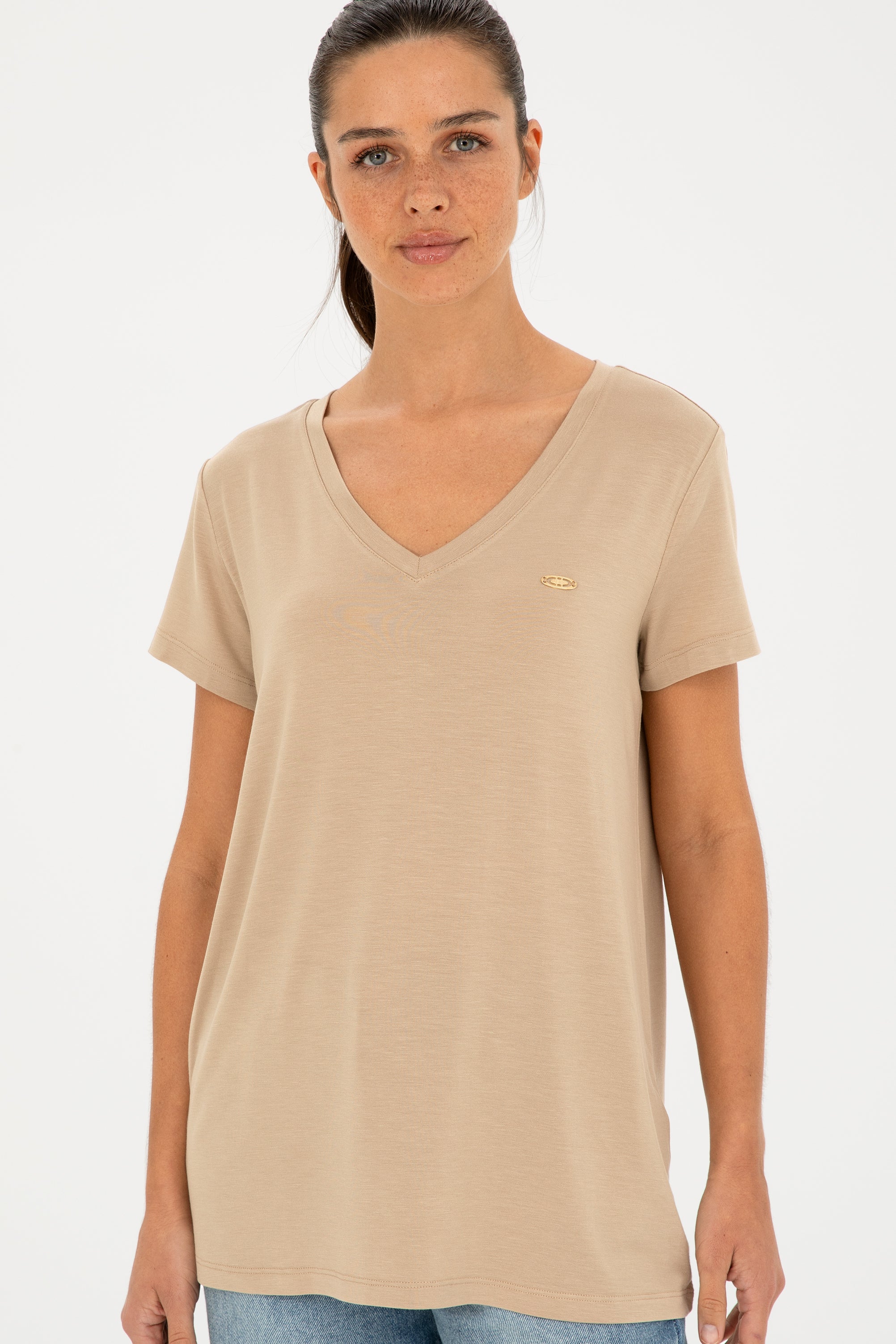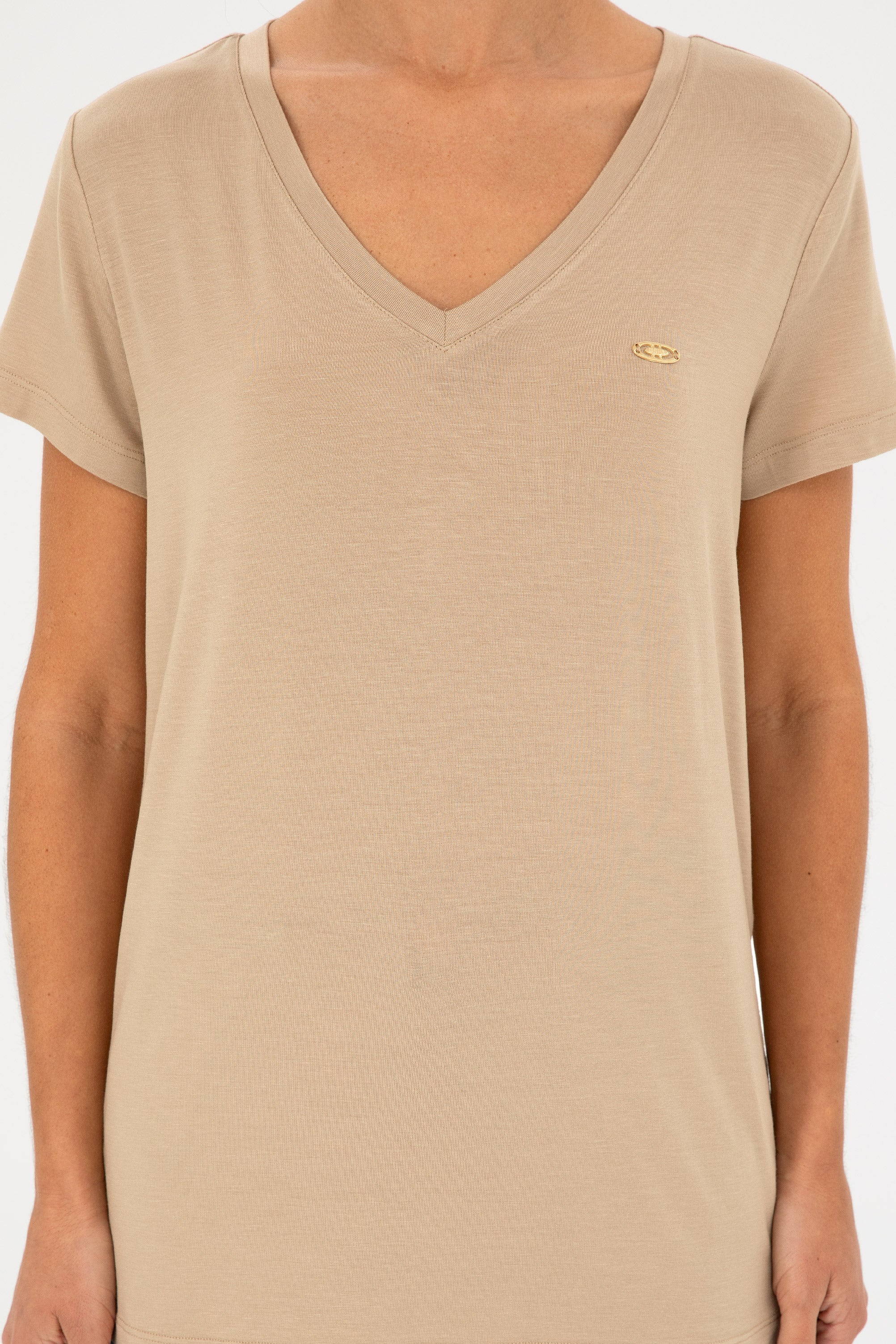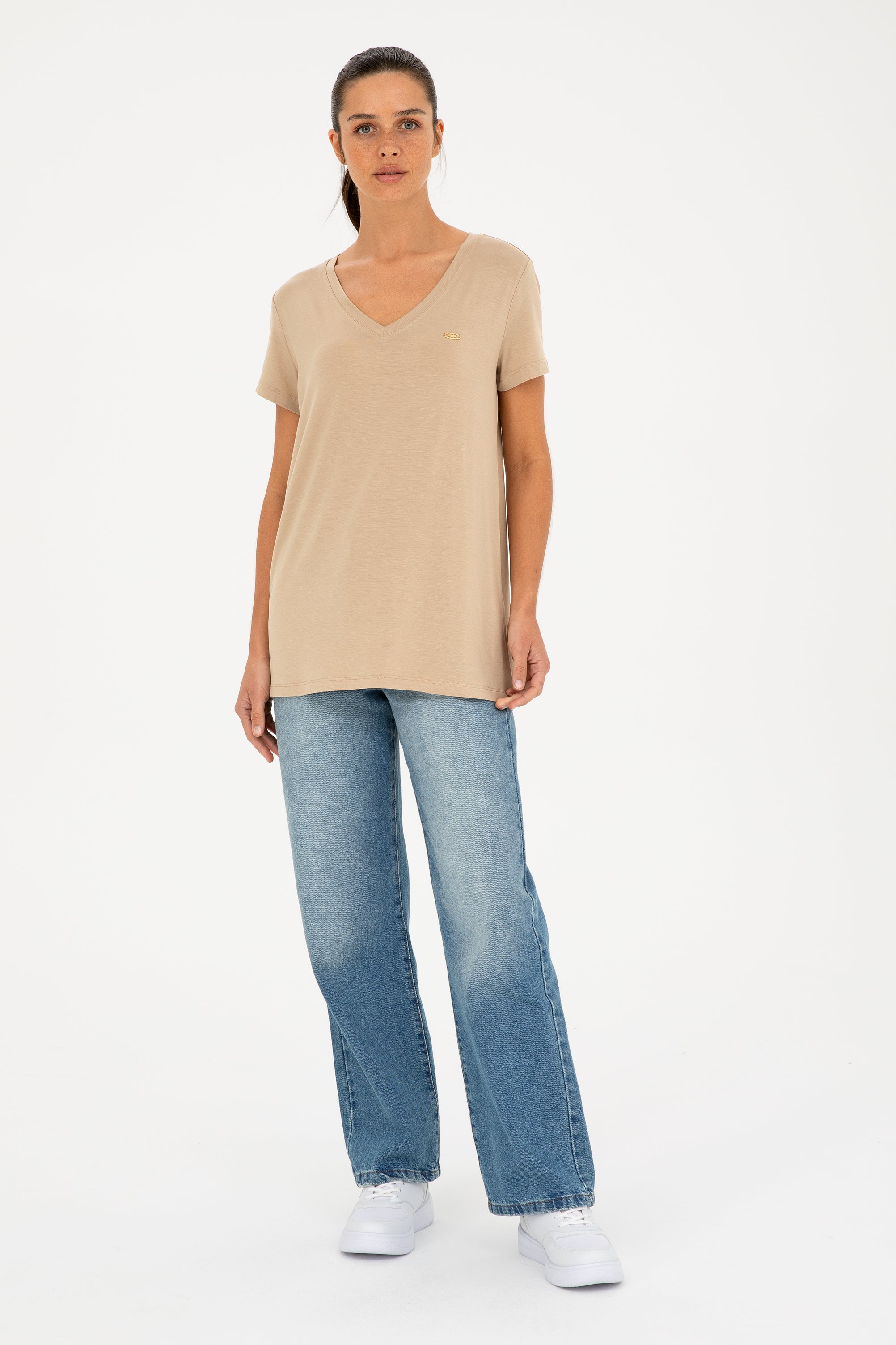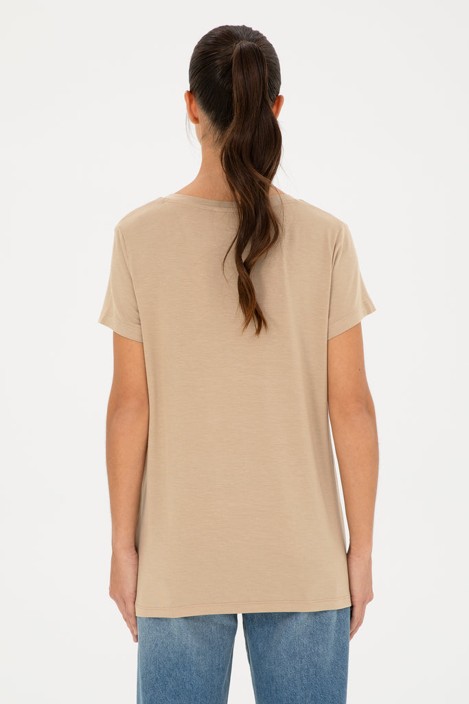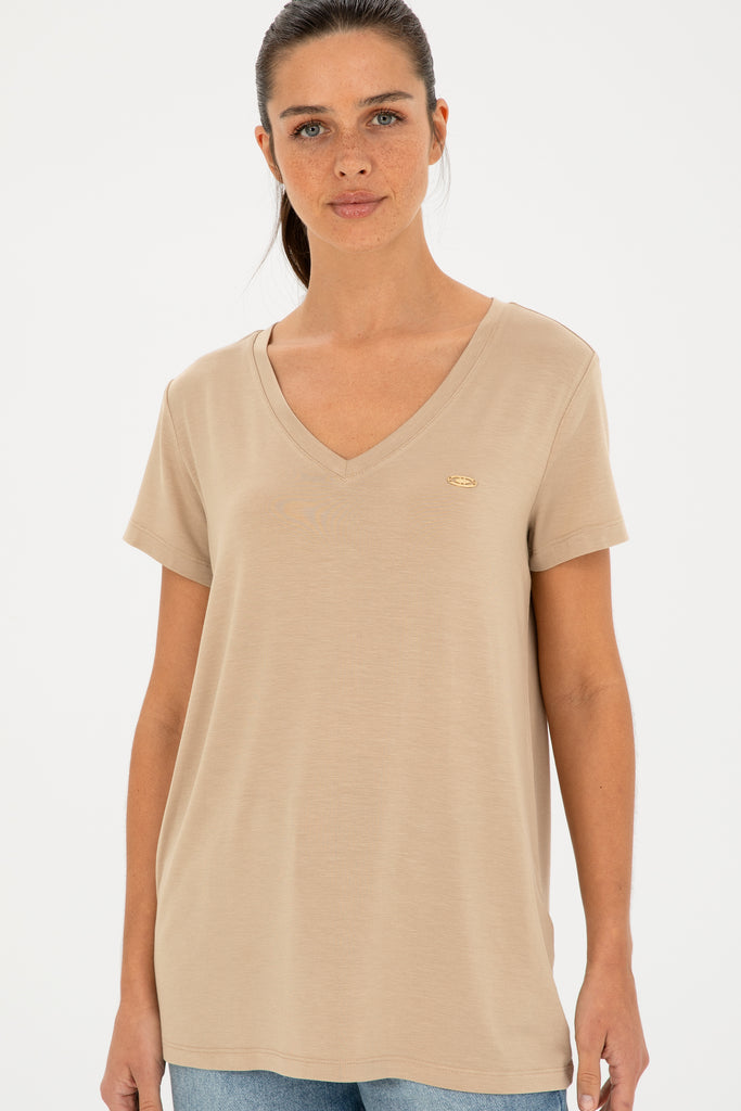 Ova elegantna majica u suptilnoj bež boji idealna je za svakodnevno nošenje i pruža savršenu kombinaciju udobnosti i stila. Karakteriše je lagana, prozračna tkanina koja omogućava koži da diše, dok V-izrez dodaje dašak sofisticiranosti. Na prednjem dijelu majice nalazi se diskretni logotip, što doprinosi minimalističkom izgledu. Ova majica je savršen izbor za ležerne kombinacije, bilo da je nosite na posao, u šetnju ili uz izlazak s prijateljima, i savršeno se uklapa uz farmere, suknje ili šortseve.