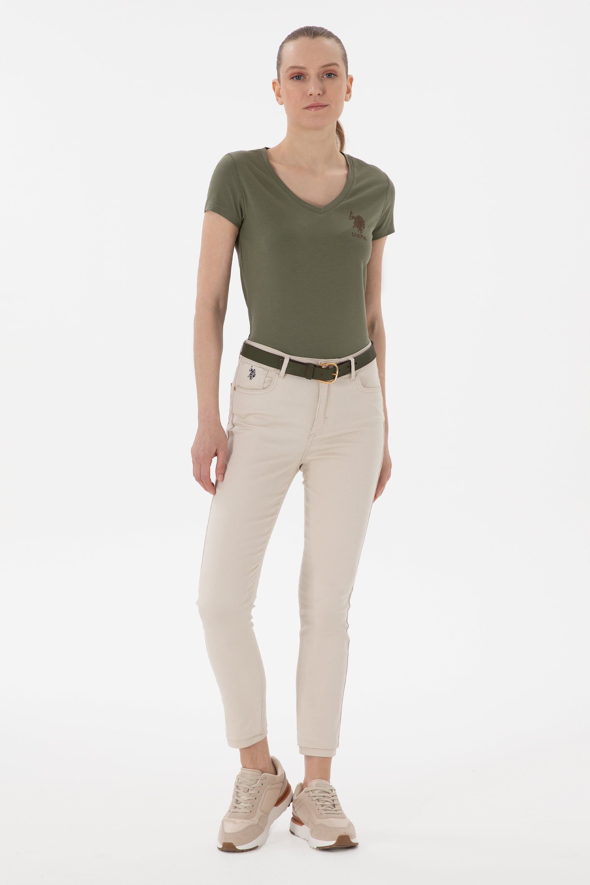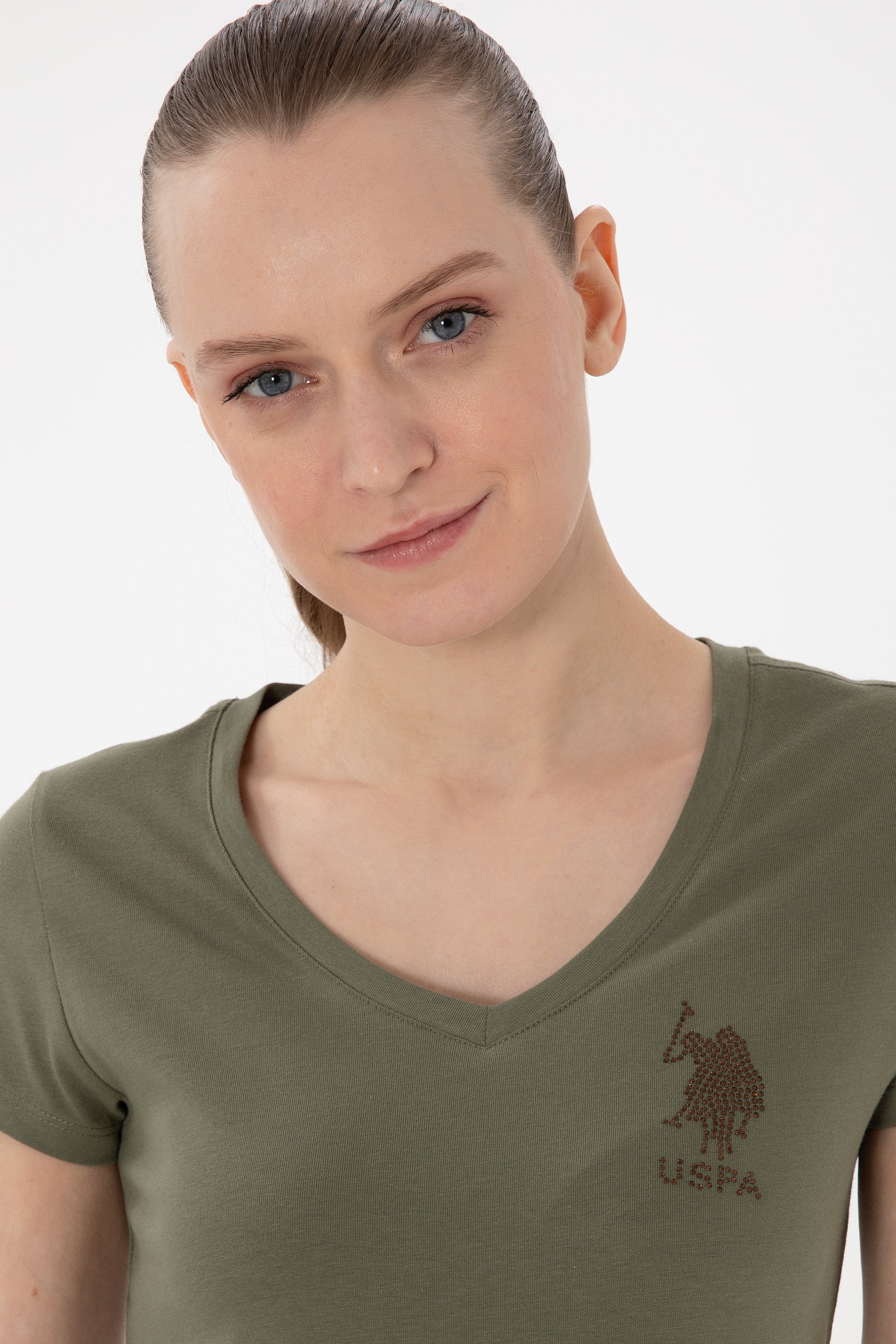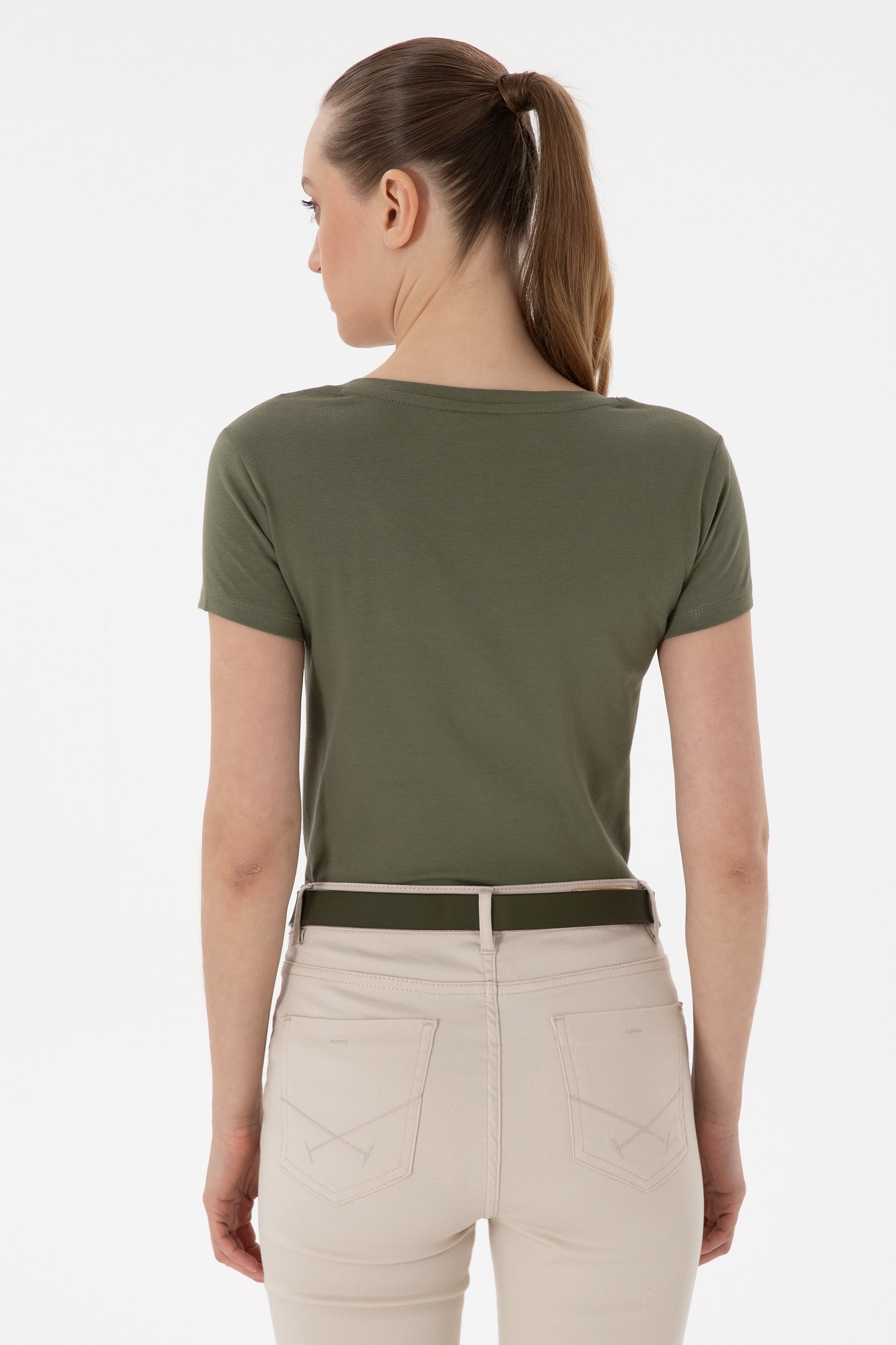 Ova elegantna majica u maslinasto zelenoj boji savršena je za svakodnevno nošenje i pruža udobnost kroz cijeli dan. Karakteriše je meka pamučna tkanina koja se prilagođava tijelu, osiguravajući prijatno iskustvo nošenja. Majica ima V izrez i kratke rukave, čime dodatno naglašava moderni izgled. Na prednjem dijelu se nalazi suptilni logotip koji dodaje dašak sofisticiranosti. Ova majica se lako može kombinovati sa raznim odjevnim komadima, od traperica do suknji, čineći je versatile dodatkom svake garderobe. Idealna je za ležerne prilike, ali i za opuštene večernje izlaske.