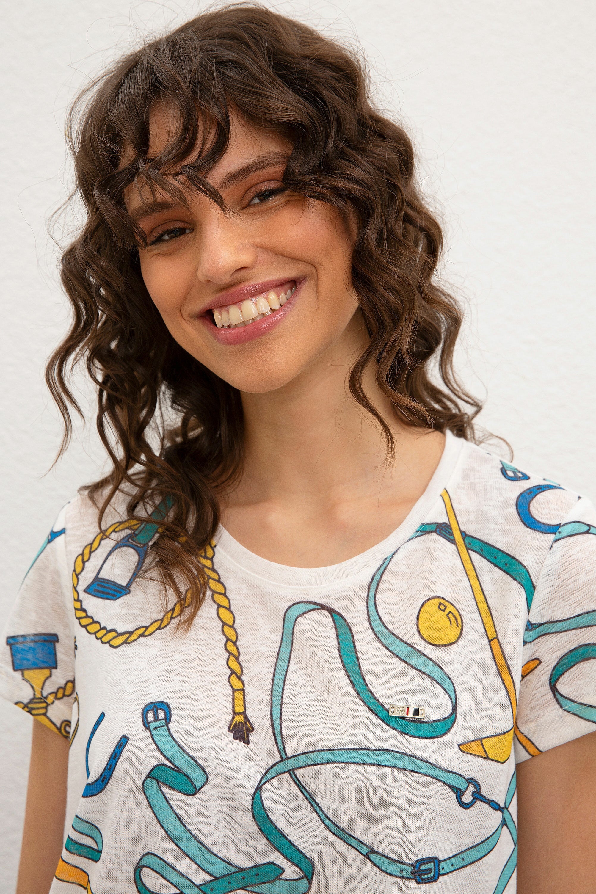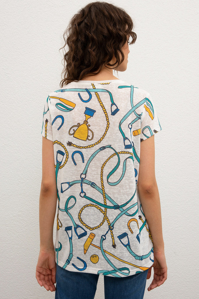 Ova šarmantna majica u svijetlim bojama donosi veseli duh i udobnost u svakodnevnu garderobu. Karakteriše je lagani materijal koji pruža prozračnost i udobno nošenje tokom cijelog dana. Unikatni uzorak sa različitim motivima dodaje dašak kreativnosti i stila, idealna je za ležerne prilike. Majica se lako kombinira s farmerkama, šortsevima ili suknjama, čineći je savršenim izborom za svaki opušteni izgled, bilo da ste u šetnji gradom ili na kafi s prijateljima.