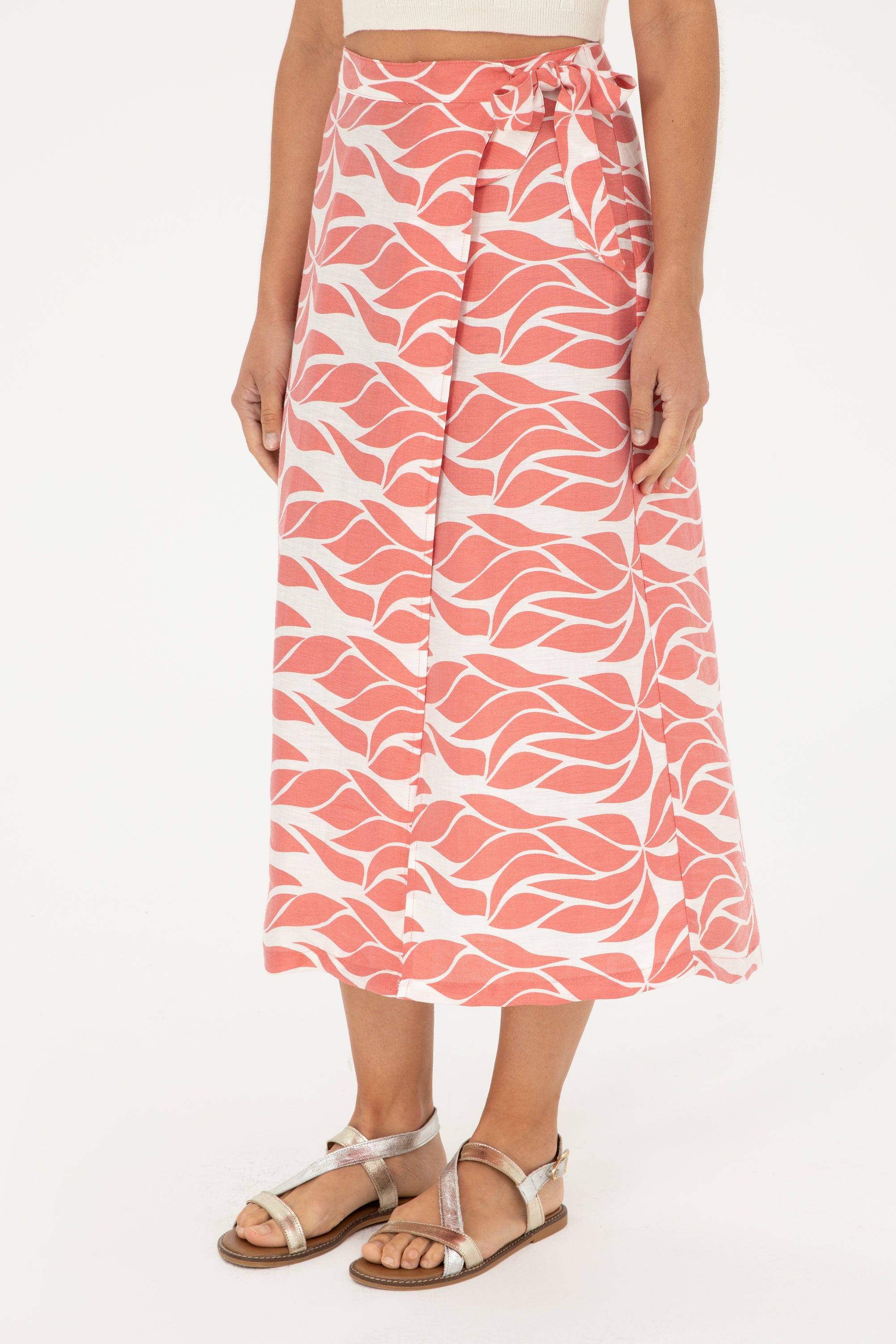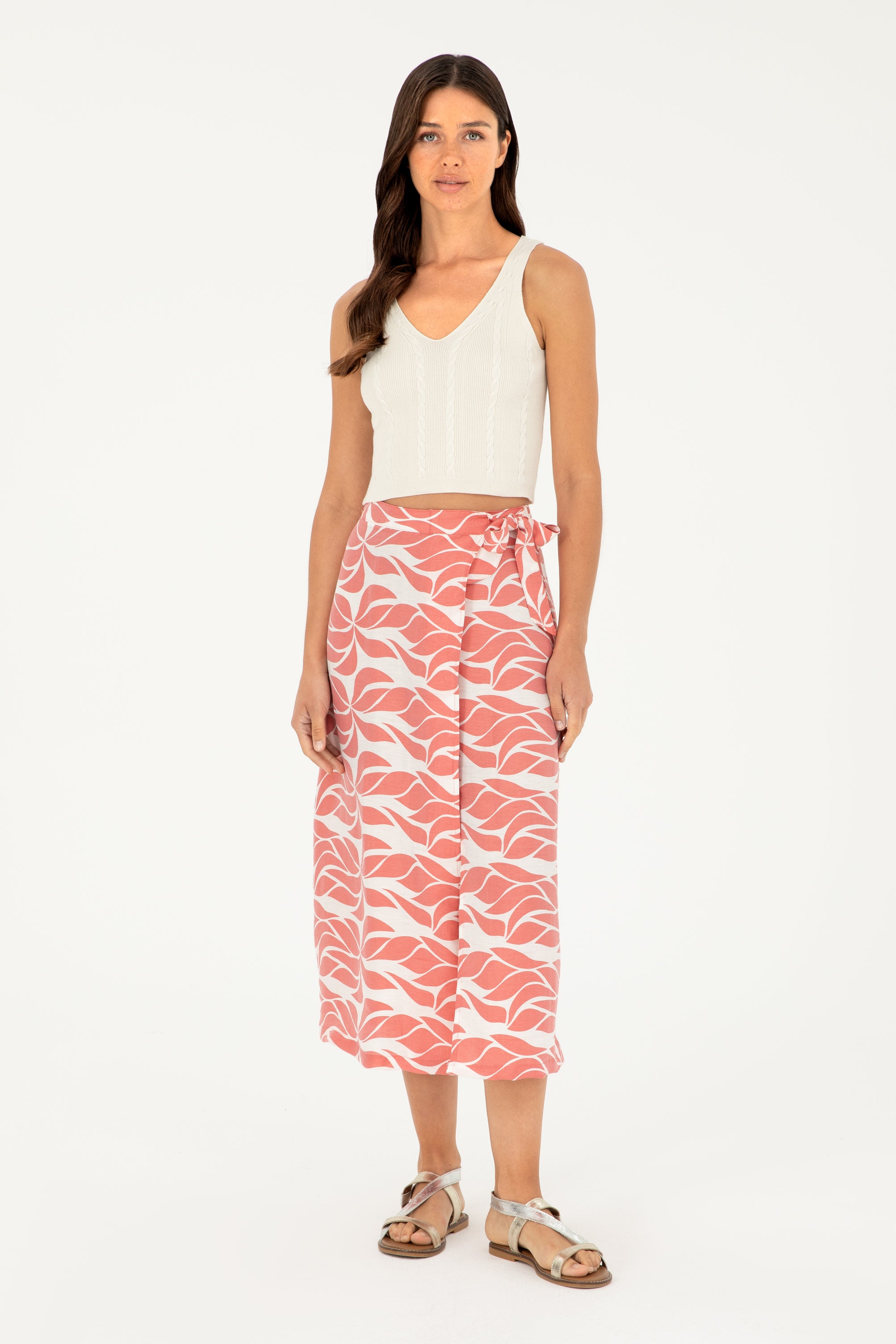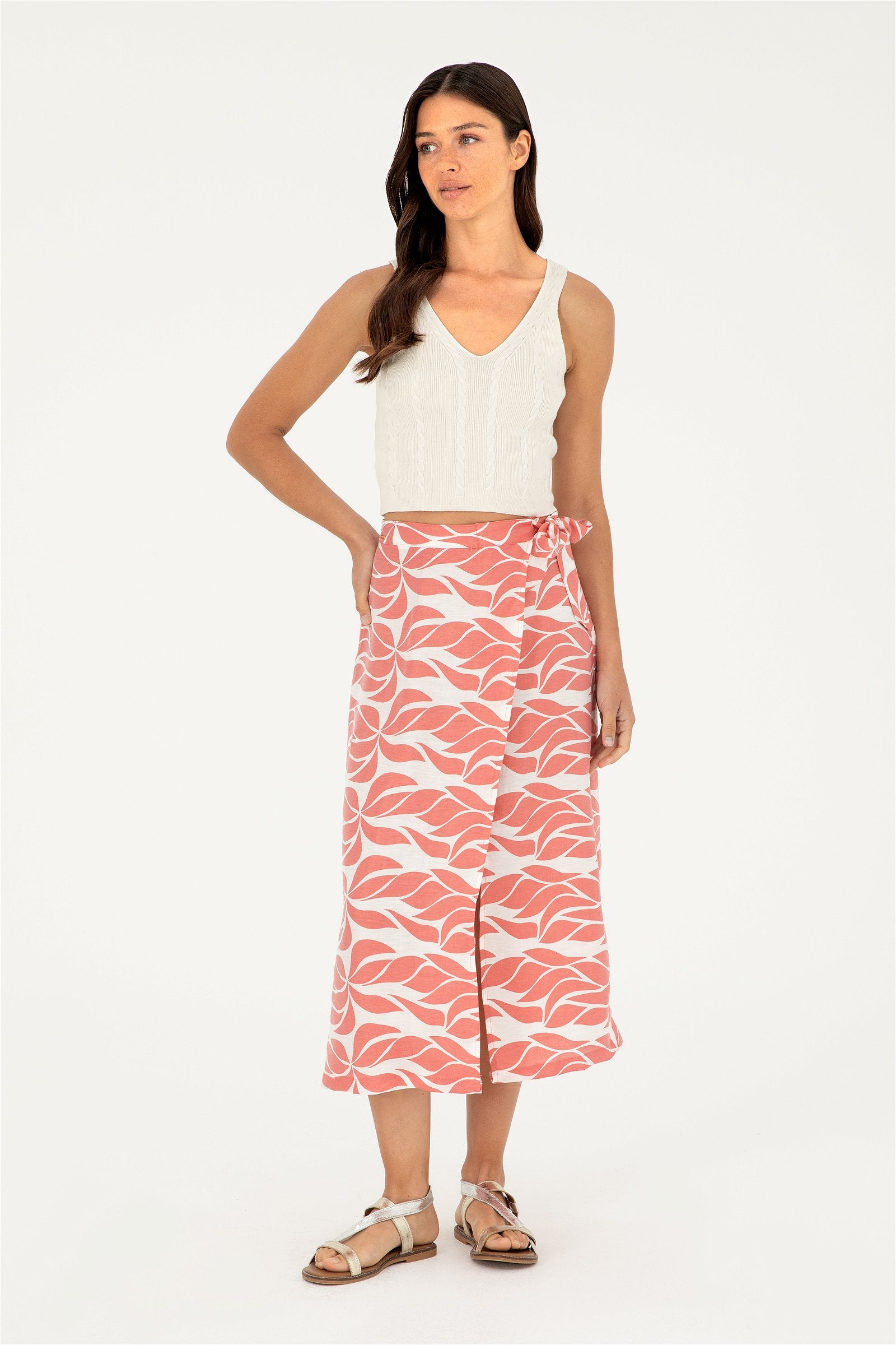 Šarmantna suknja sa elegantnim uzorkom lista u nježnim nijansama ružičaste boje unosi svježinu u svaki outfit. Karakteriše je lepršavi kroj koji osigurava udobno nošenje i slobodu pokreta. Suknja se zatvara sa strane diskretnim mašnom, što dodaje poseban šarm i elegantan izgled. Ova suknja je savršen izbor za proljetne i ljetne kombinacije, bilo da se radi o opuštenom izlasku ili posebnim prilikama, a lako se može kombinovati sa različitim topovima, sandalama ili čak baletankama.