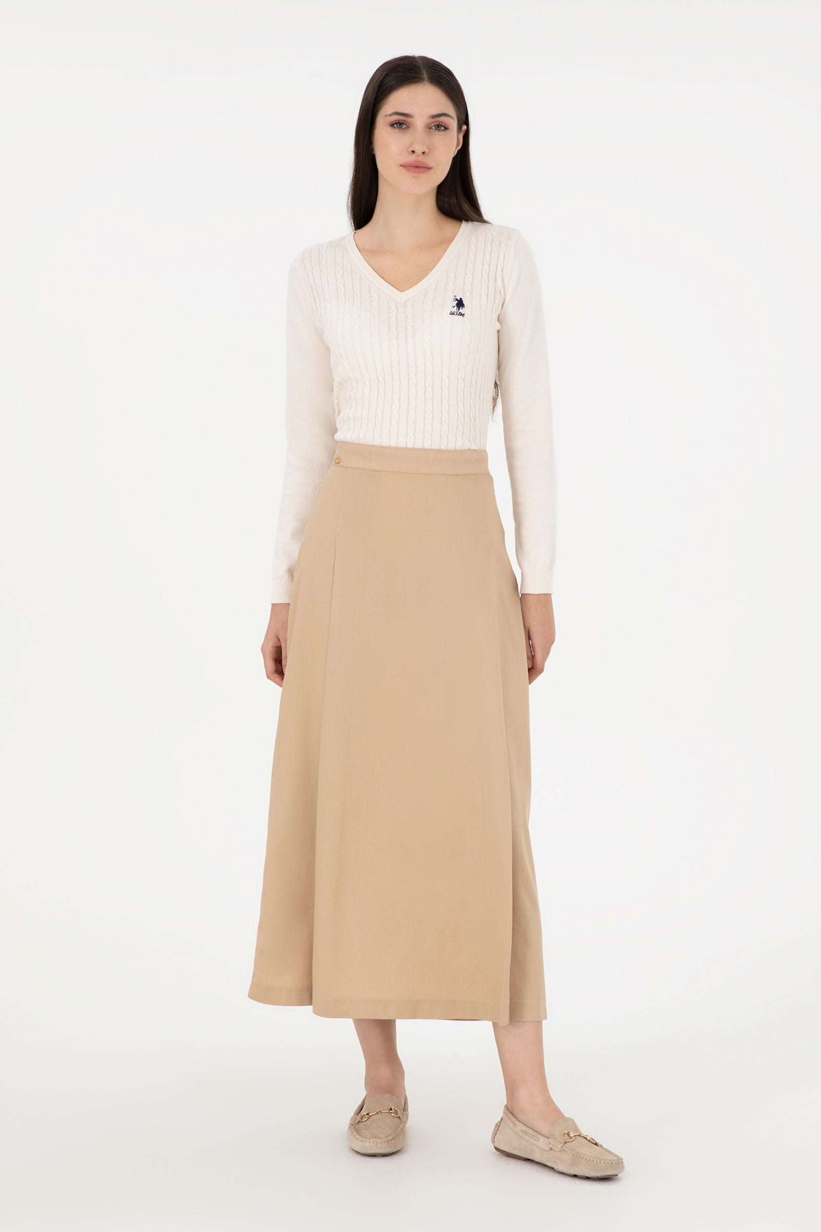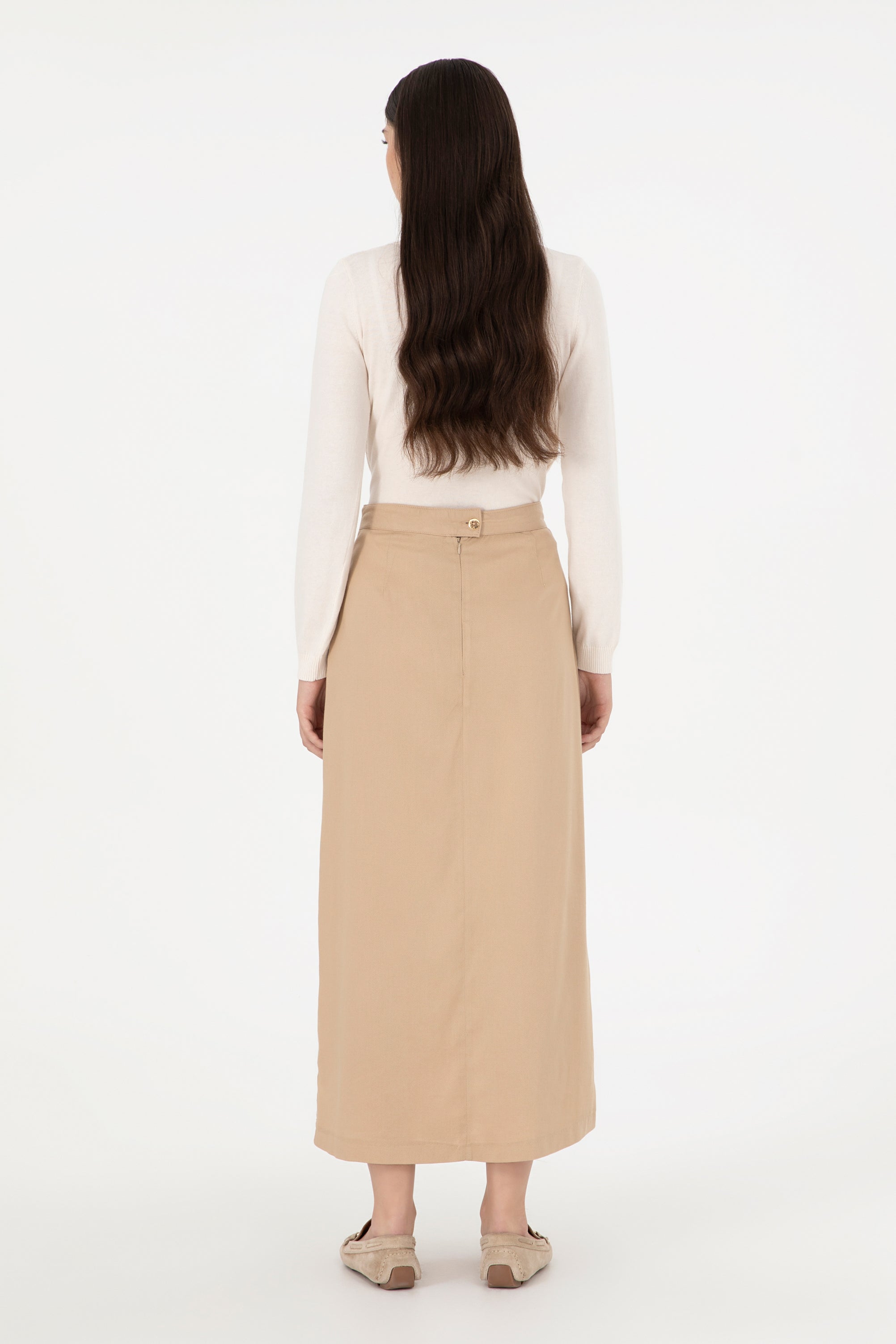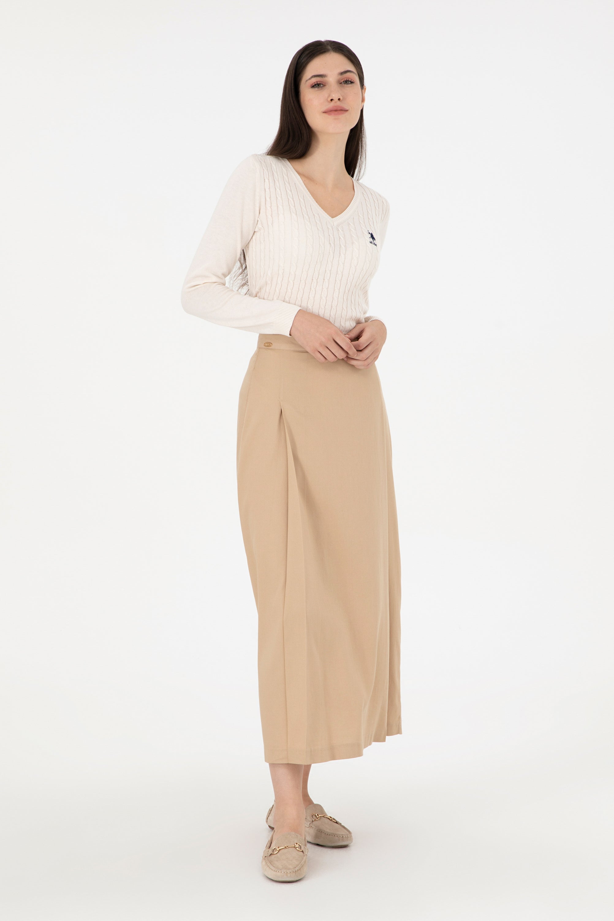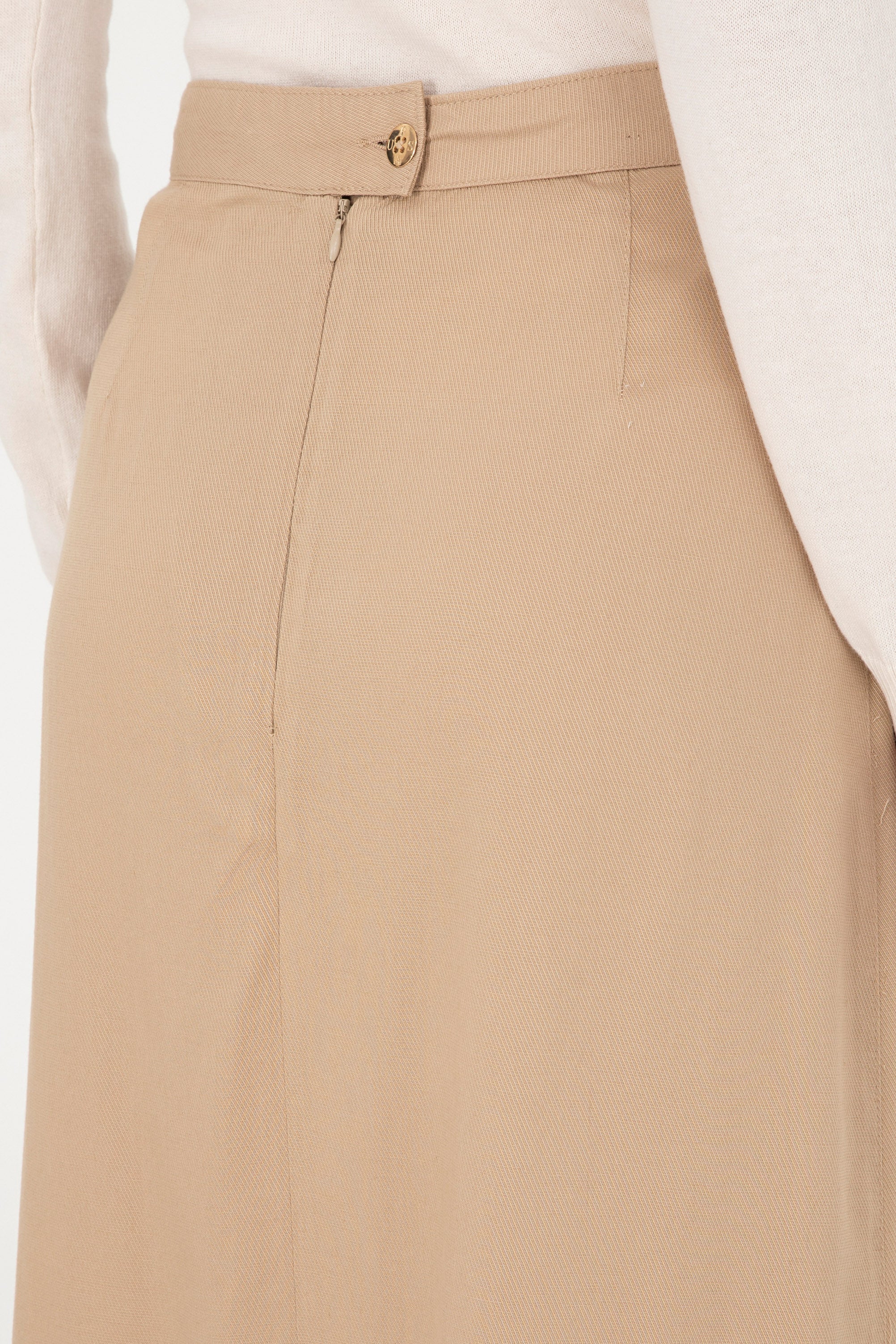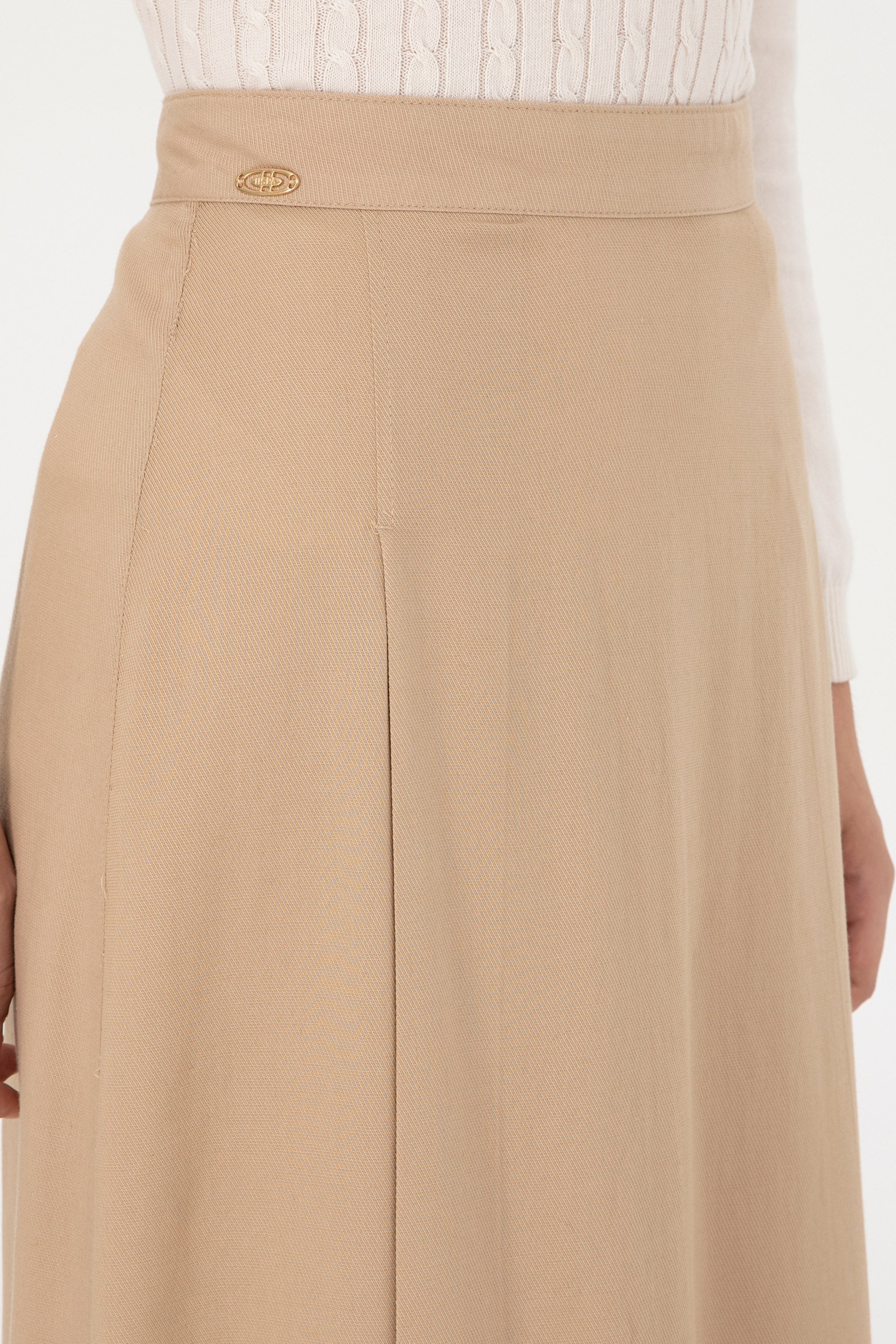Elegantna suknja u nježnoj bež boji nudi savršen spoj udobnosti i stila. Karakteriše je lagani materijal koji pada u struk, osiguravajući elegantnu siluetu i slobodu pokreta. Na prednjem dijelu suknje nalazi se diskretni detalj koji dodaje sofisticiranost. Ova suknja je idealan izbor za različite prilike, bilo da se radi o poslovnim sastancima ili opuštenim izlascima, a lako se može kombinovati s bluzama, jaknama ili majicama za savršen izgled.