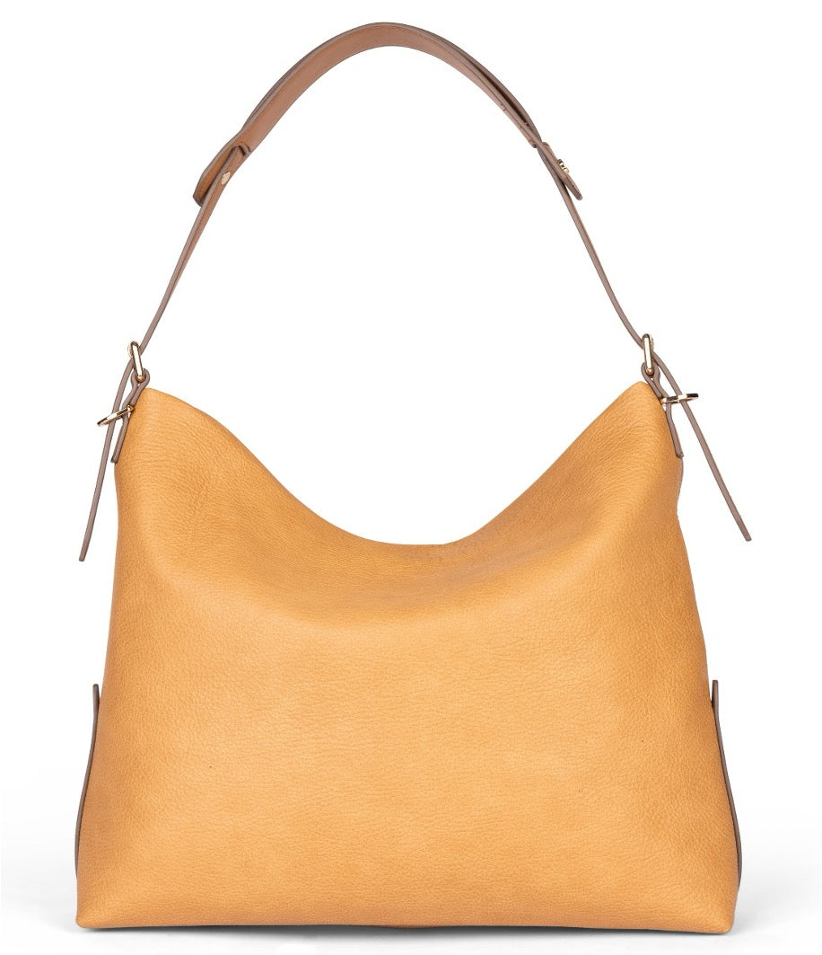 Elegantna torba u toplom nijansi žute boje donosi dozu sofisticiranosti i klase svakom izgledu. Njena mekana kožna tekstura pruža izvanrednu udobnost i trajnost, dok zakrivljeni oblik osigurava savršenu ravnotežu između stilskog i funkcionalnog. Na prednjem dijelu torbe nalazi se suptilan logotip koji dodatno naglašava njen premium izgled. Ova torba je idealan izbor za svaki dan, bez obzira na to da li idete na posao, u kupovinu ili večernji izlazak, a lako se kombinuje s različitim odjevnim kombinacijama, poput elegantnih haljina ili ležernih outfita.