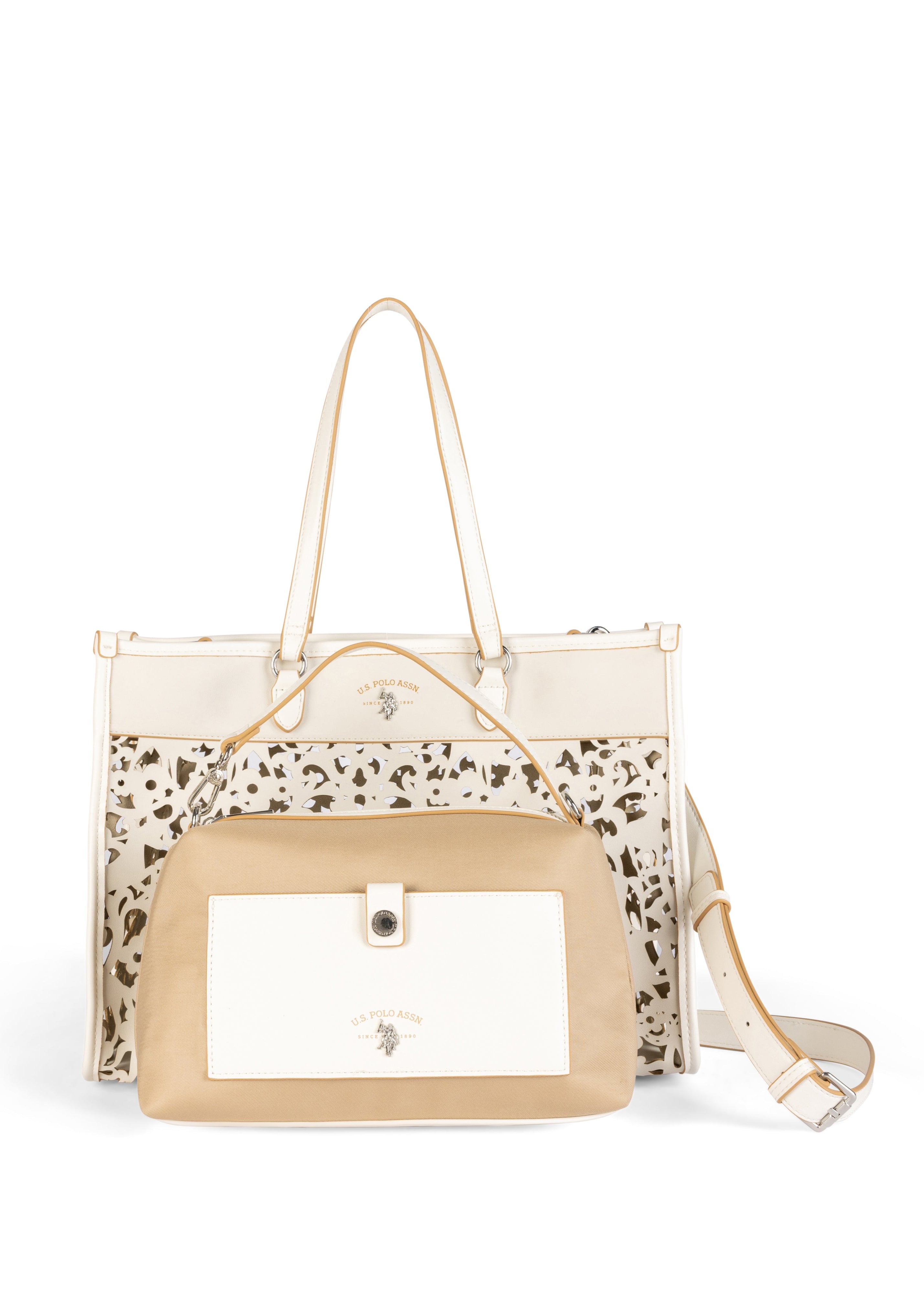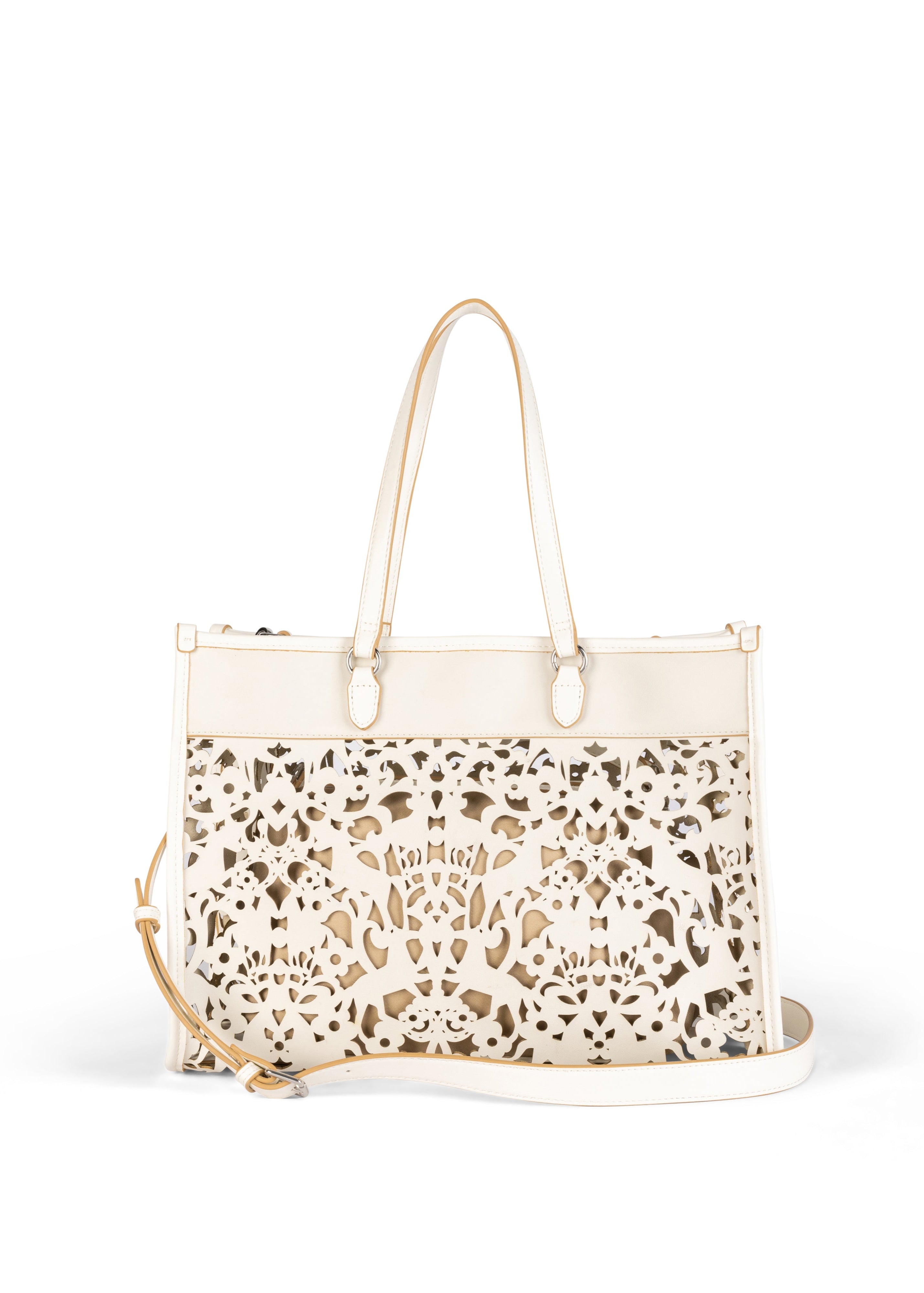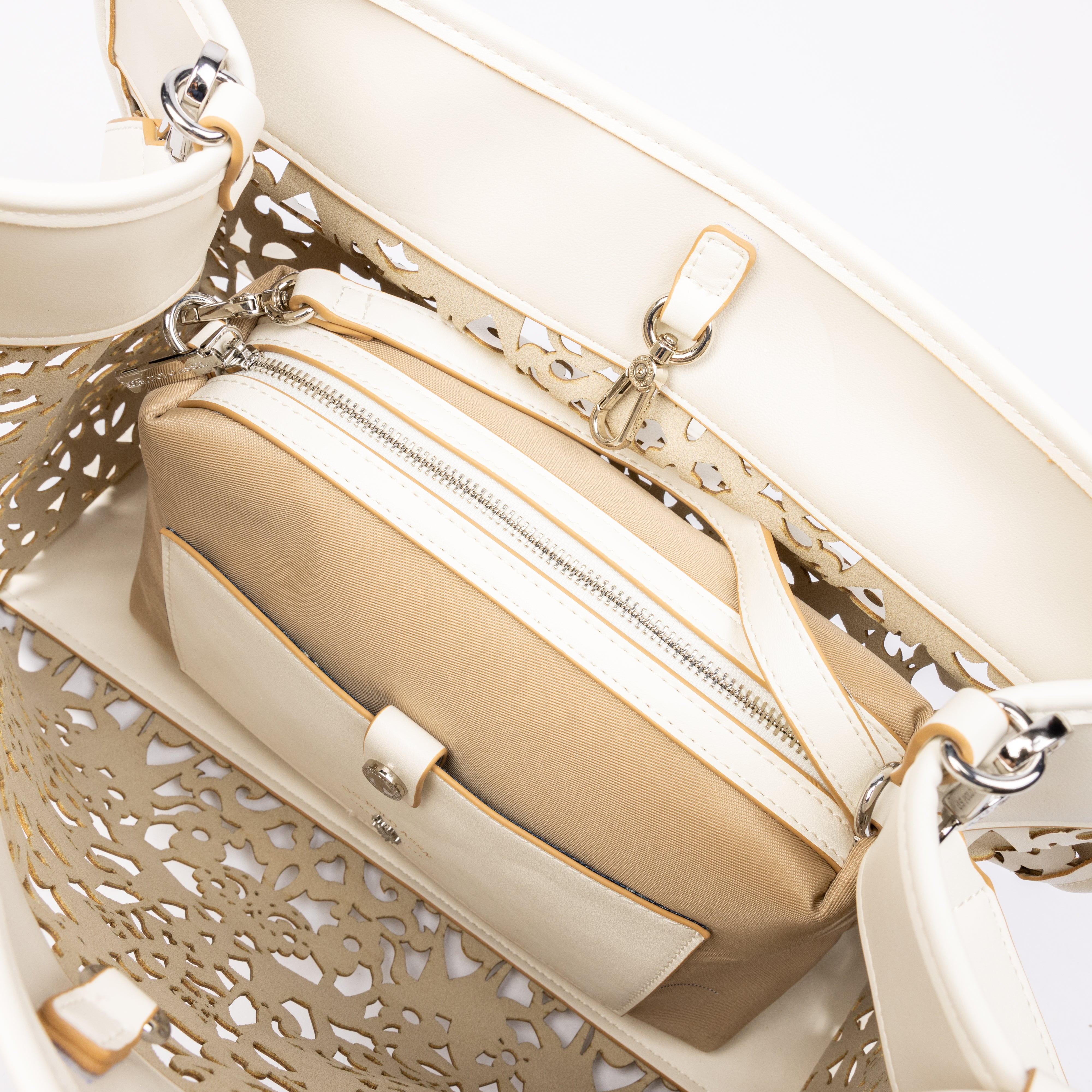 Elegantna torba u mekoj bež boji unosi dašak sofisticiranosti u svaku modnu kombinaciju. Njena jedinstvena dekoracija u obliku delikatnog izreza dodaje moderno i zanimljivo estetsko fineziju. Torba je izrađena od kvalitetnih materijala, osiguravajući dugotrajnost i otpornost, dok prostranost unutrašnjosti omogućava praktično nošenje svih neophodnih sitnica. Ova torba je savršen izbor za različite prilike, bilo da se radi o poslovnom sastanku, izlasku s prijateljima ili svakodnevnim aktivnostima, a lako se uklapa uz razne stilove odjeće, od ležernih haljina do elegantnih outfit-a.