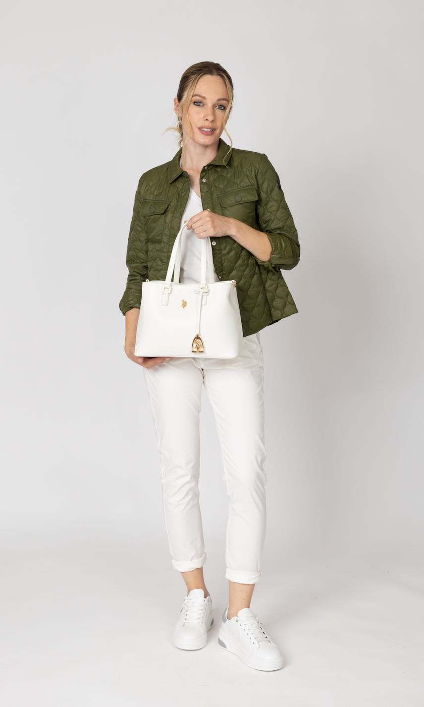 Elegantna torba u klasičnoj bijeloj boji unosi dašak sofisticiranosti u svaku kombinaciju. Izrađena je od visokokvalitetnog materijala koji osigurava izdržljivost i dugotrajnost. Torba se odlikuje minimalističkim dizajnom i mekanim linijama, što je čini savršenim dodatkom za svaki outfit, bilo da se radi o poslovnom sastanku ili svakodnevnim aktivnostima. Unutrašnjost torbe je prostorna i praktična, s nekoliko džepova koji omogućavaju laku organizaciju vaših osnovnih stvari. Ova torba je idealan izbor za moderne žene koje cijene stil i funkcionalnost.
