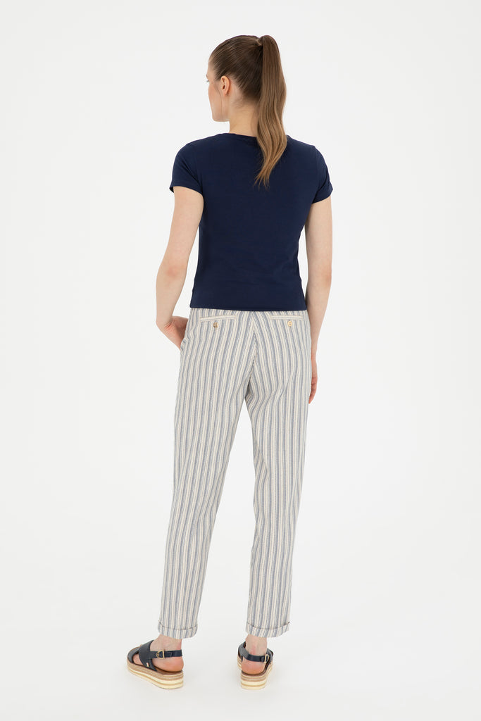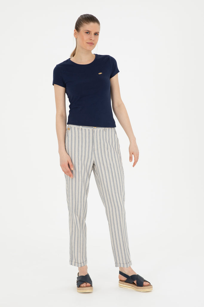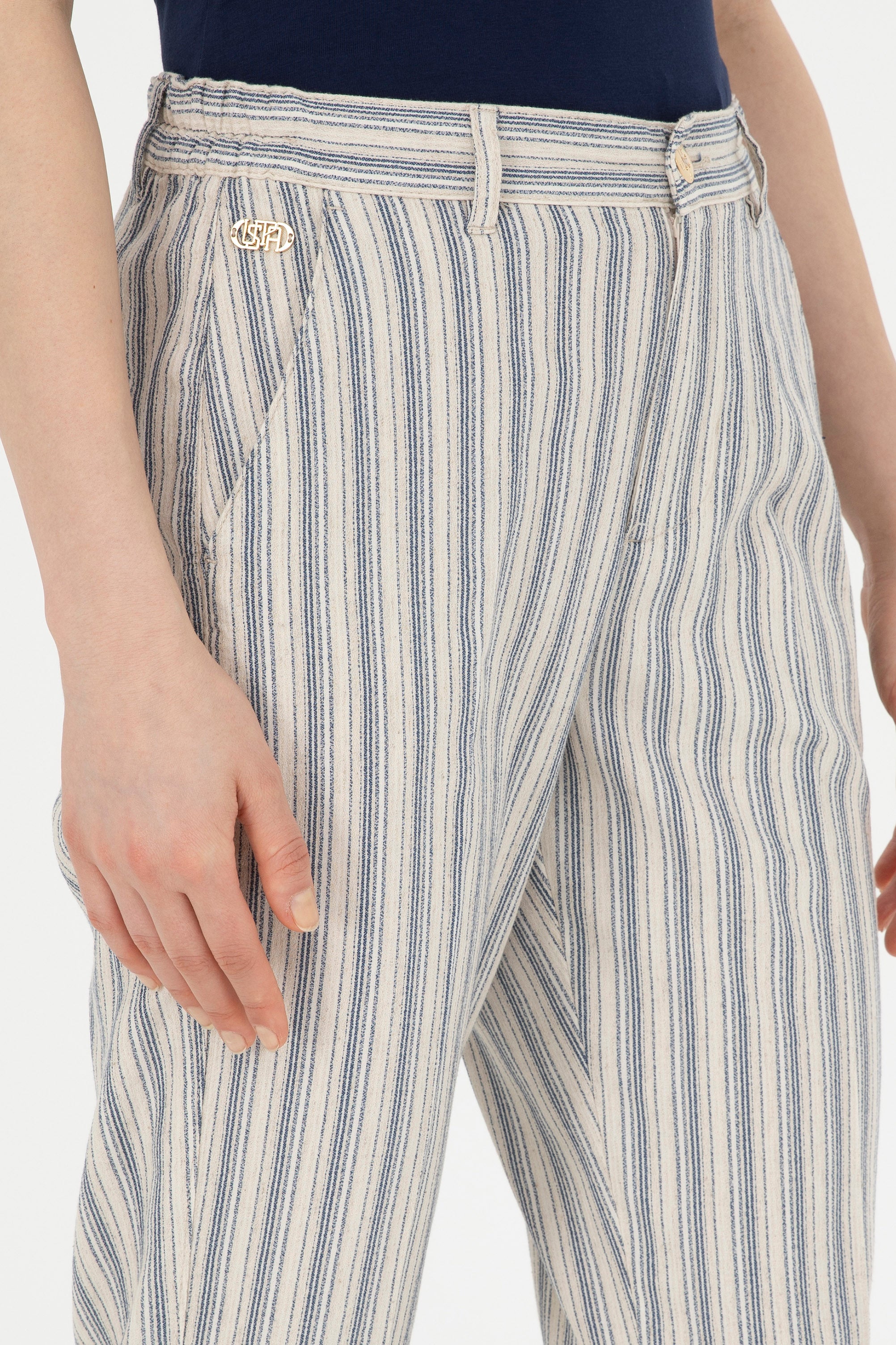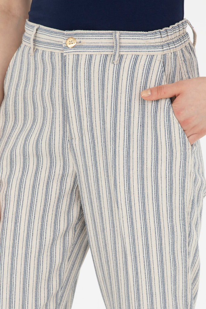 Elegantne pantalone sa trakama u nježnim pastelnim tonovima pružaju udobnost i šik izgled u svakodnevnim prilikama. Karakterišu ih lagana i prozračna tkanina koja omogućava slobodu kretanja i udobno nošenje tokom cijelog dana. Pantalone imaju elastičan pojas koji se savršeno prilagođava struku, dok im uski kroj daje modernu siluetu. Ove pantalone su idealan izbor za ležerne i polu-formalne kombinacije, a lako se mogu uskladiti sa majicama, bluzama ili čak elegantnijim komadima odjeće. Savršene su za proljetne ili ljetne izlaske, bilo da se radi o šetnji gradom ili opuštenom druženju s prijateljima.