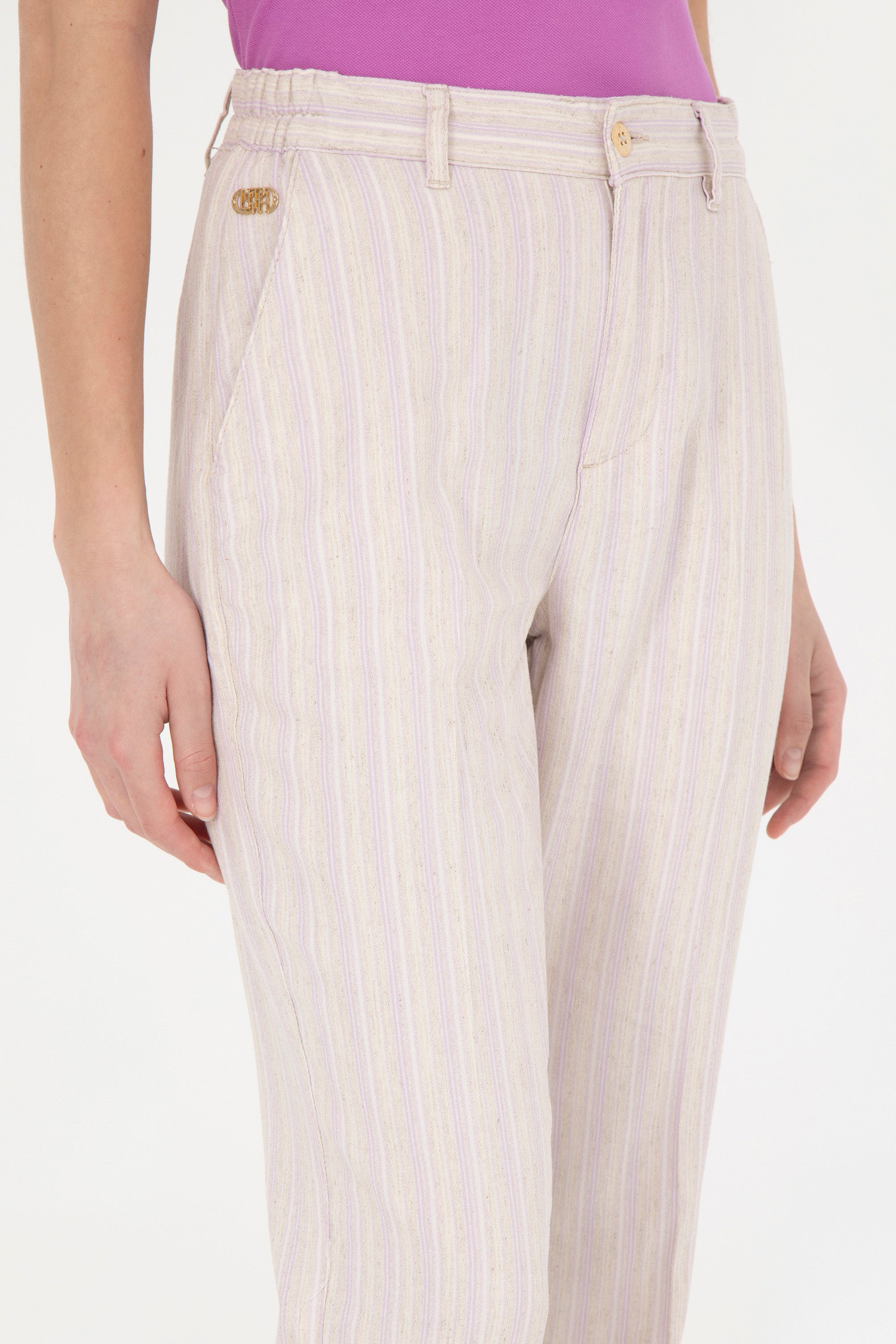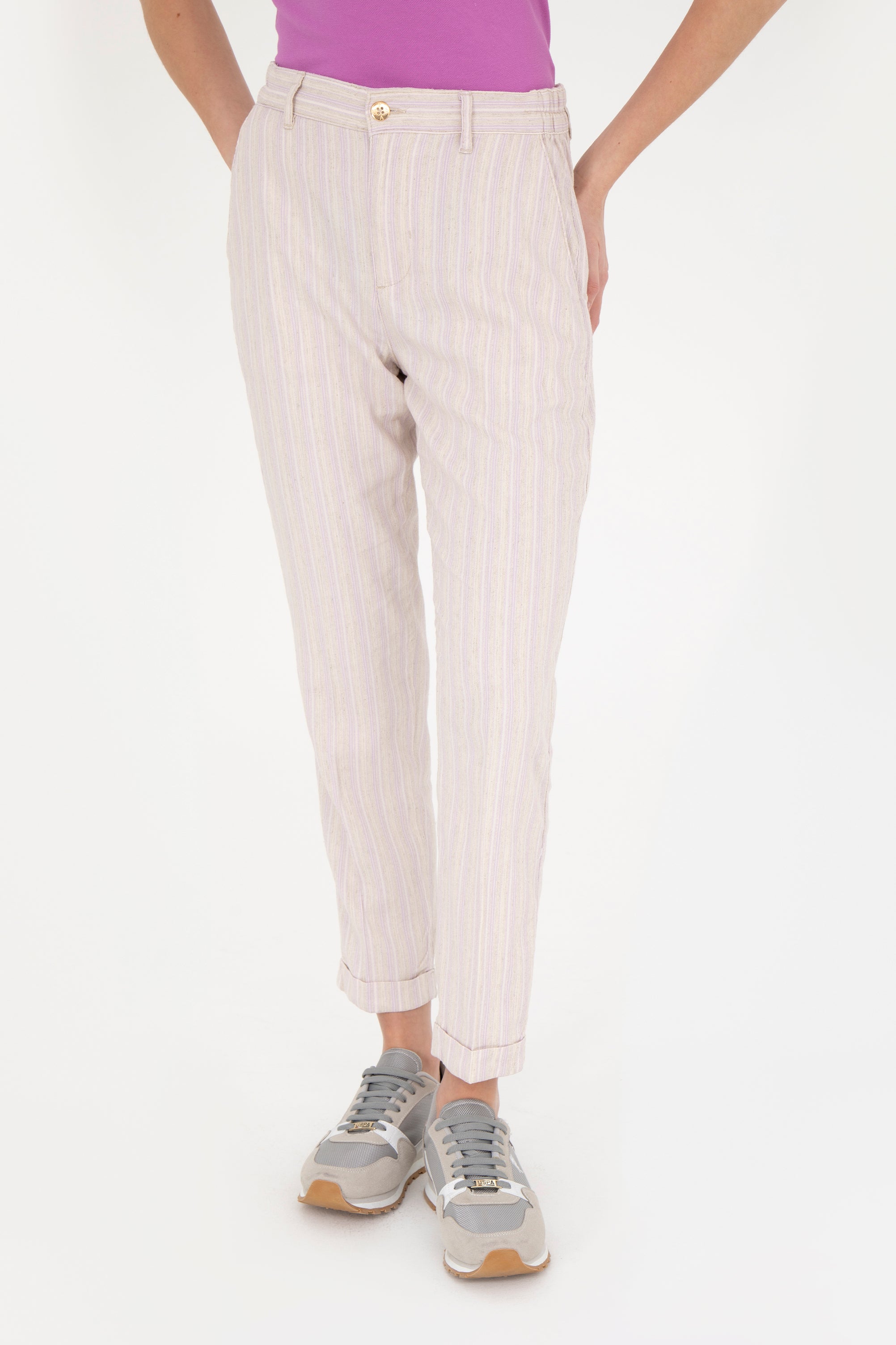 Ove moderni pantalone izrađene su od laganog, komfortnog materijala koji pruža potpunu slobodu pokreta tokom cijelog dana. Karakterišu ih elegantne pruge koje dodaju dozu sofisticiranosti i svježine svakodnevnim kombinacijama. Pantalone su krojene da savršeno prate tijelo, a pri tome osiguravaju udobnost i fleksibilnost. Svojim klasičnim stilom mogu se lako kombinovati s različitim majicama i košuljama, bilo da idete na posao ili uživate u slobodnom danu. Ovaj komad odjeće je idealan izbor za sve prigode, pružajući vam modernu i chic notu.