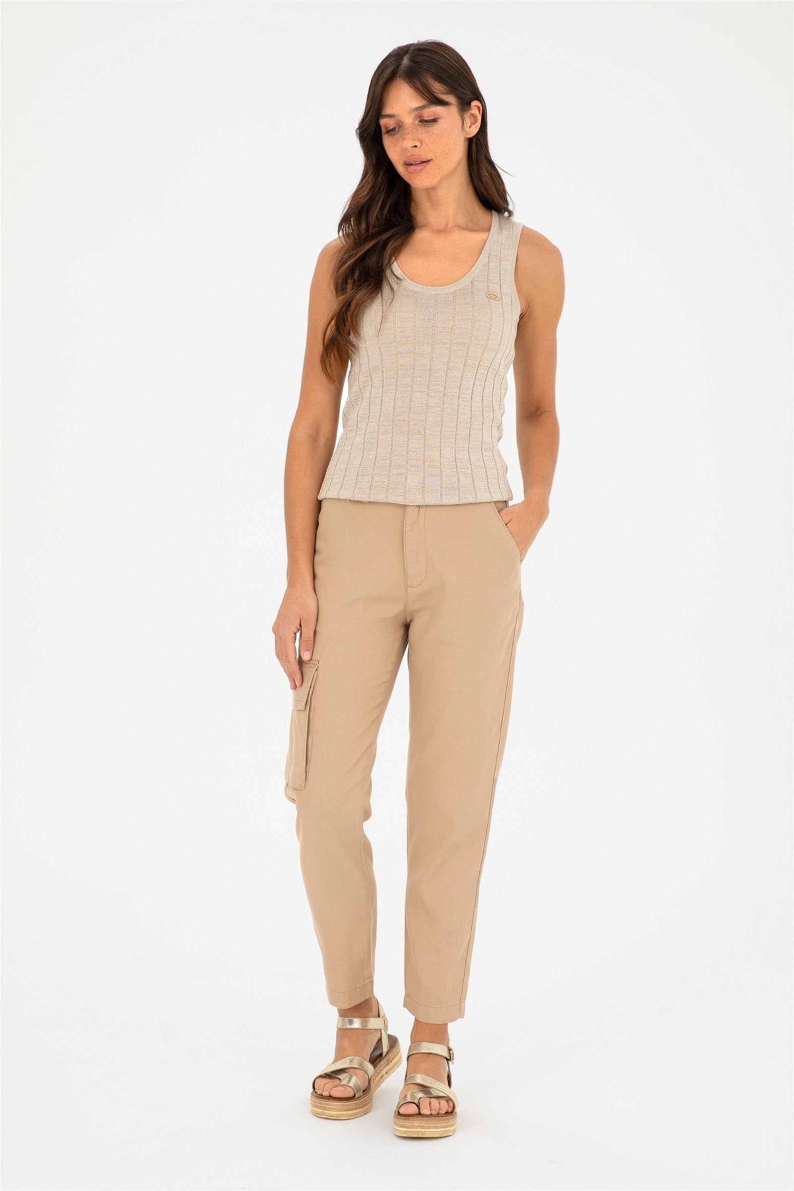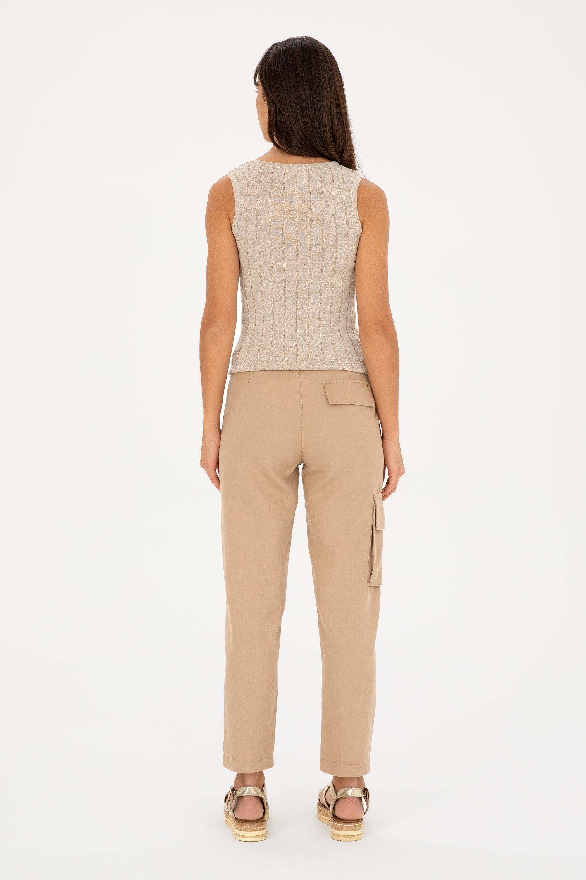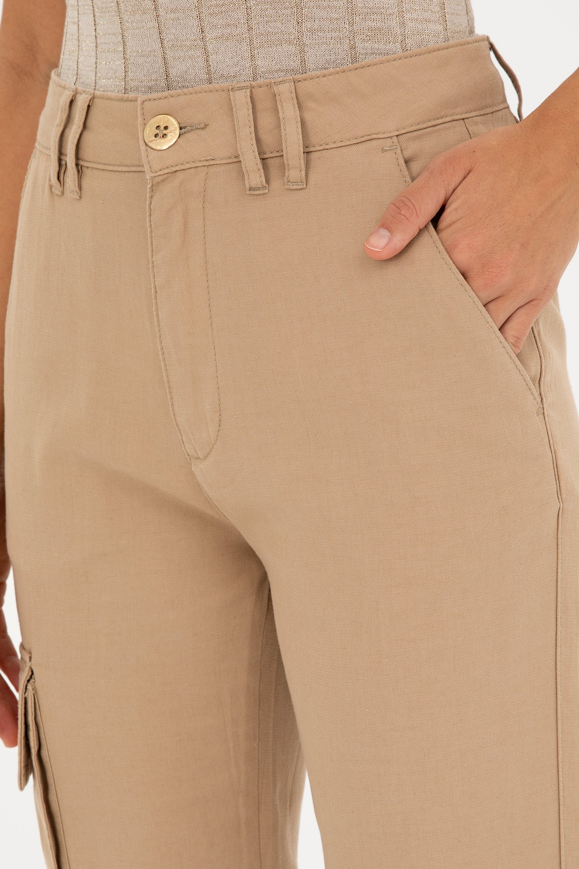 Moderne pantalonice u svijetloj bež boji pružaju udobnost i stil kroz cijeli dan. Njihov dizajn karakteriše praktična kroja koja omogućava lako kretanje, dok široke bočne džepove dodaju dodatnu funkcionalnost. Ove pantalone su idealan izbor za svakodnevne aktivnosti, bilo da se radi o poslu ili opuštenom izlasku, i savršeno se kombinuju sa različitim majicama ili bluzama. Uz svoju univerzalnost, lako se uklapaju u različite stilske kombinacije i savršene su za toplije prolećne i ljetne dane.