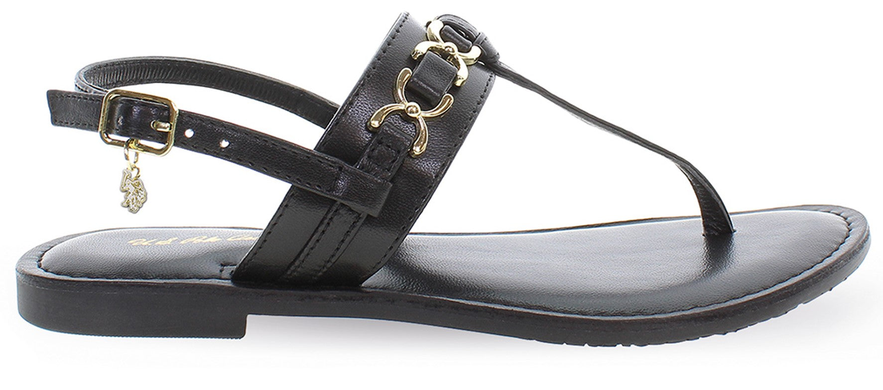 Elegantne sandale u klasičnoj crnoj boji idealne su za ljetne dane te pružaju udobnost i stil. Karakteriše ih jednostavan, ali sofisticiran dizajn s tankim trakama koje se savršeno prilagođavaju obliku noge i osiguravaju stabilnost prilikom hodanja. Na prednjem dijelu sandala nalazi se diskretan zlatni detalj koji dodaje dašak luksuza. Ove sandale su savršen izbor za razne ljetne prilike, bilo da idete na plažu, šetnju gradom ili večernji izlazak, a lako se kombiniraju s haljinama, pantalonama ili šortsevima.