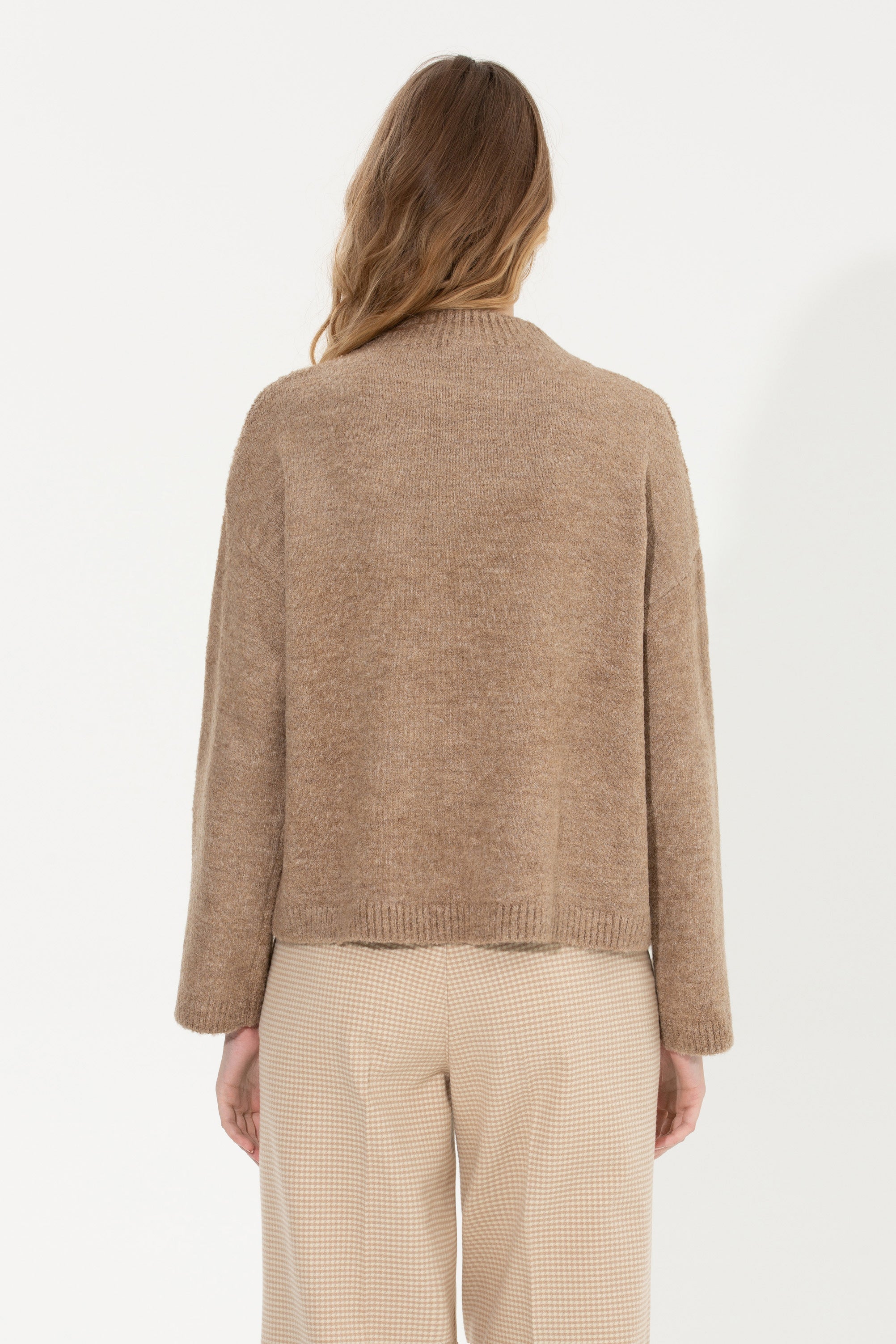Ovaj šarmantni džemper u toploj bež boji pruža savršenu kombinaciju udobnosti i stila tokom hladnih dana. Karakteriše ga mekana, ugodna tkanina koja osigurava prijatan osjećaj na koži, dok širi kroj omogućava slobodu pokreta. Rukavi su lagano prošireni, dodajući moderni izgled, a jednostavan dizajn omogućava lako kombinovanje s raznim odjevnim komadima. Džemper je odličan izbor za svakodnevne kombinacije, bilo da ga nosite uz traperice, suknje ili pantalone, a idealan je za opuštene šetnje gradom ili neobavezne izlaze.