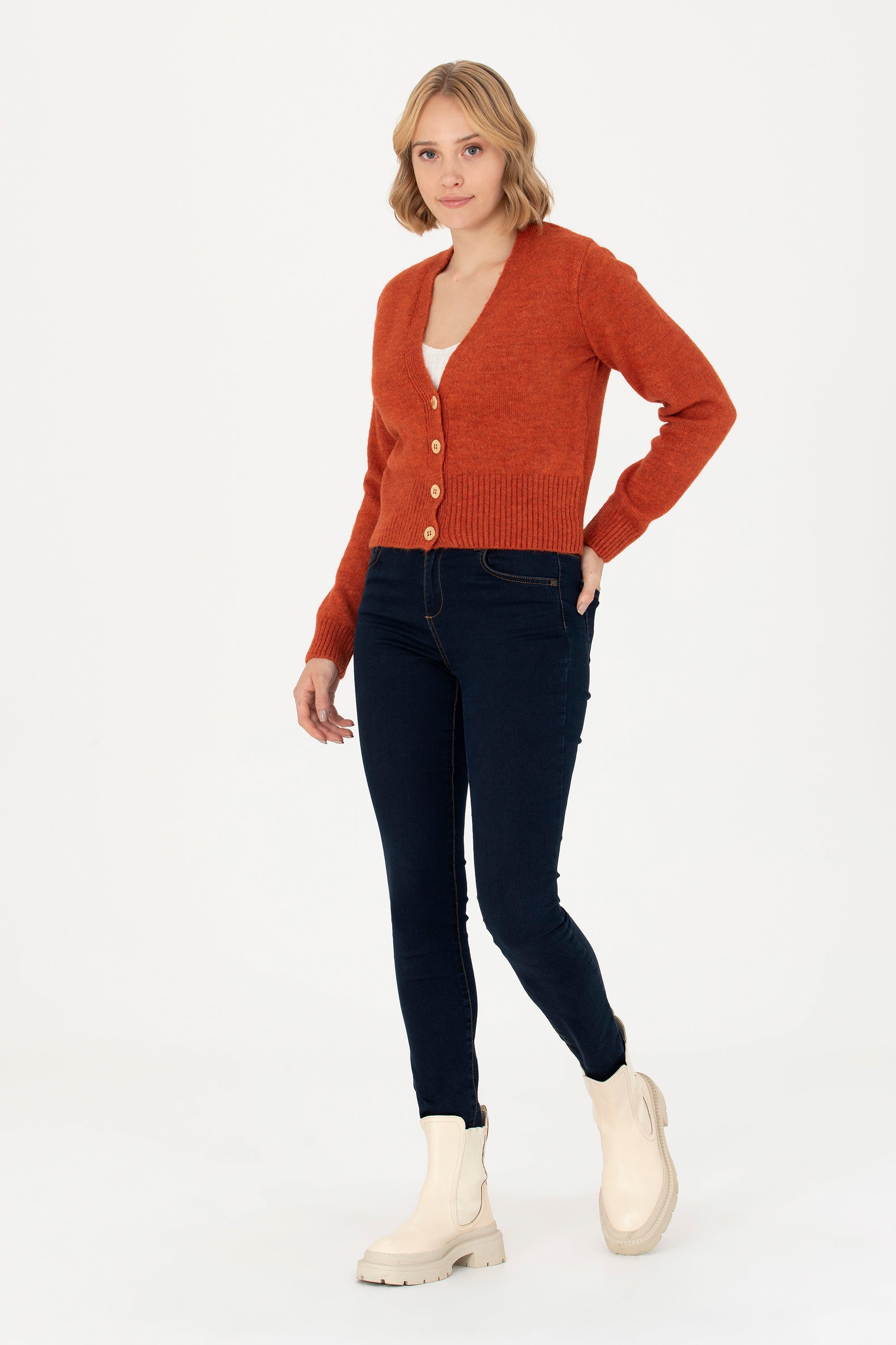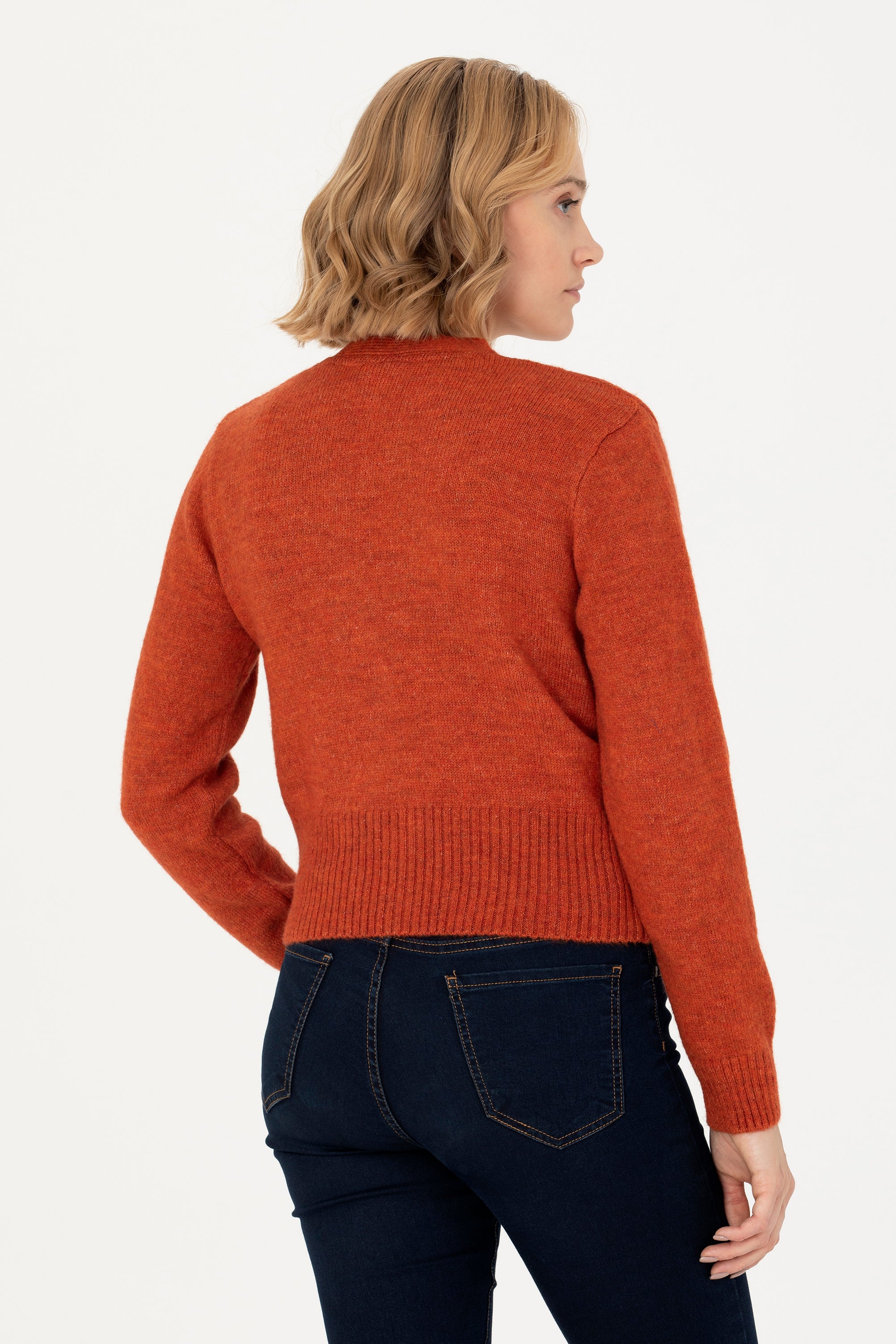 Ovaj šarmantni džemper u toploj narandžastoj boji pruža kombinaciju udobnosti i stila tokom hladnih dana. Karakteriše ga meka i prijatna tekstura koja osigurava toplotu i udobno nošenje, uz moderni kroj koji lijepo oblikuje figuru. Na prednjoj strani džempera nalaze se elegantne drvene dugmadi koja dodaju rustičan šarm i poseban detalj. Ovaj džemper je savršen za cjelodnevno nošenje, idealan za opuštene casual kombinacije, a lako se može kombinovati s različitim odjevnim predmetima poput majica, haljina ili jakni, čineći ga svestranim izborom za svaki ormar.