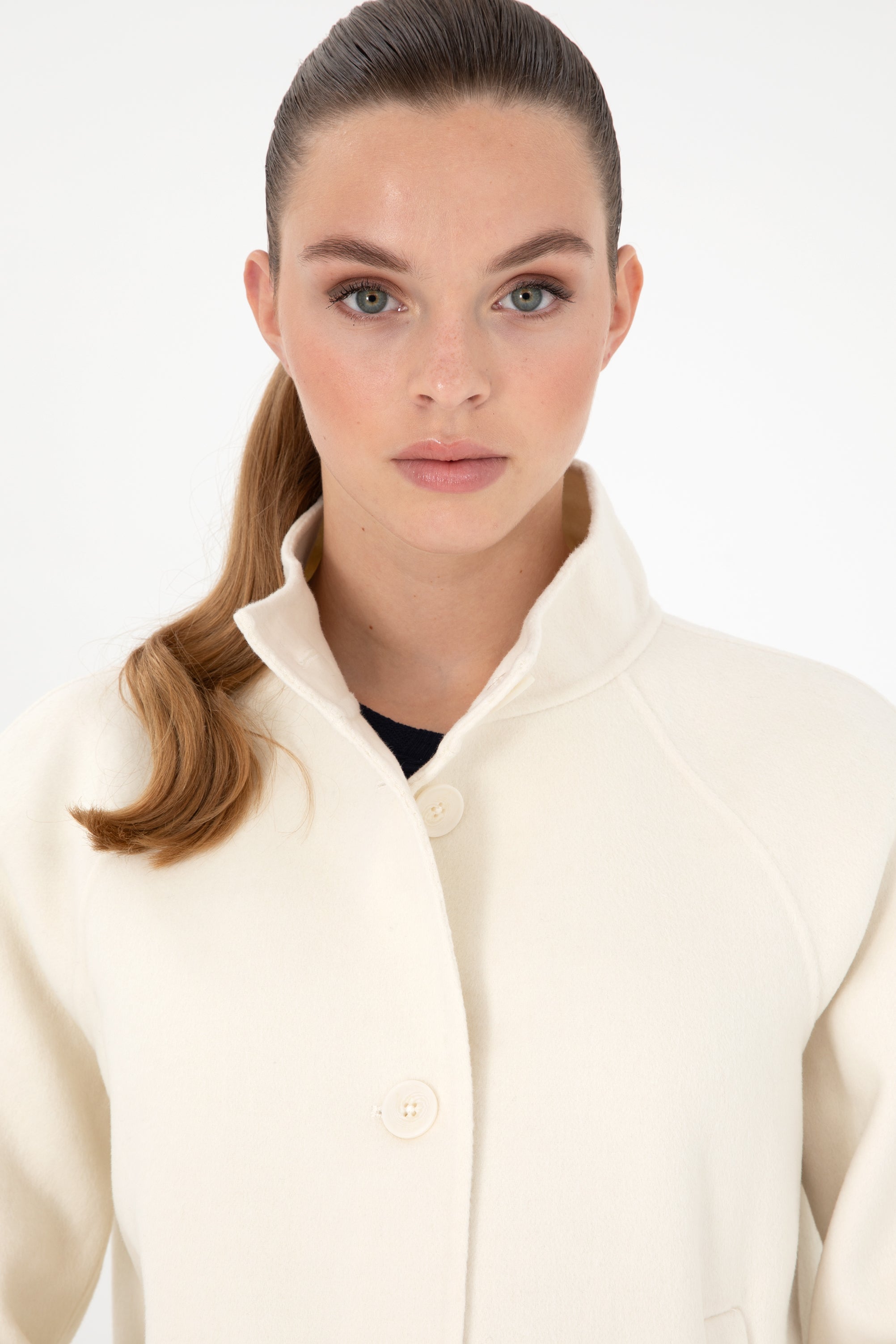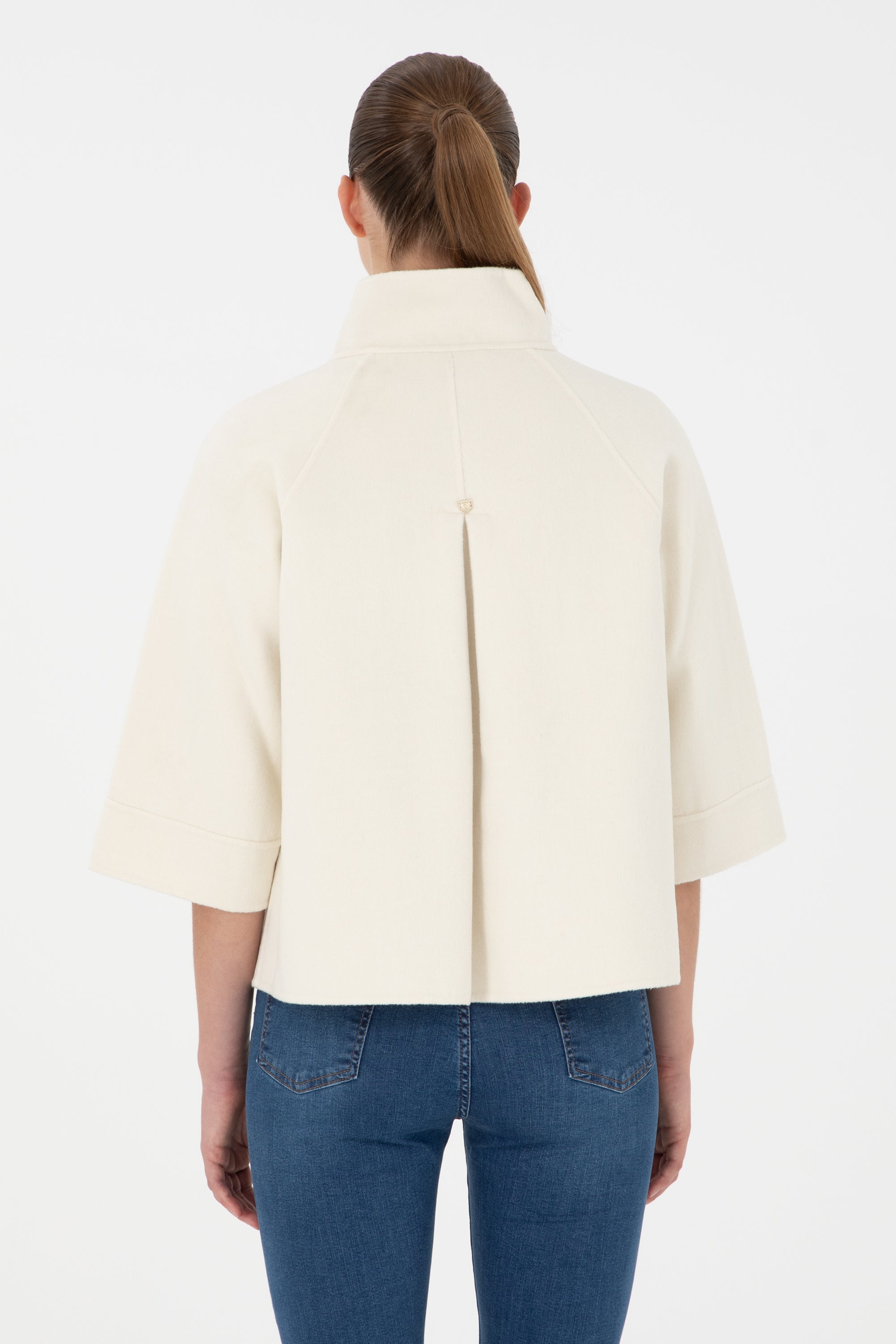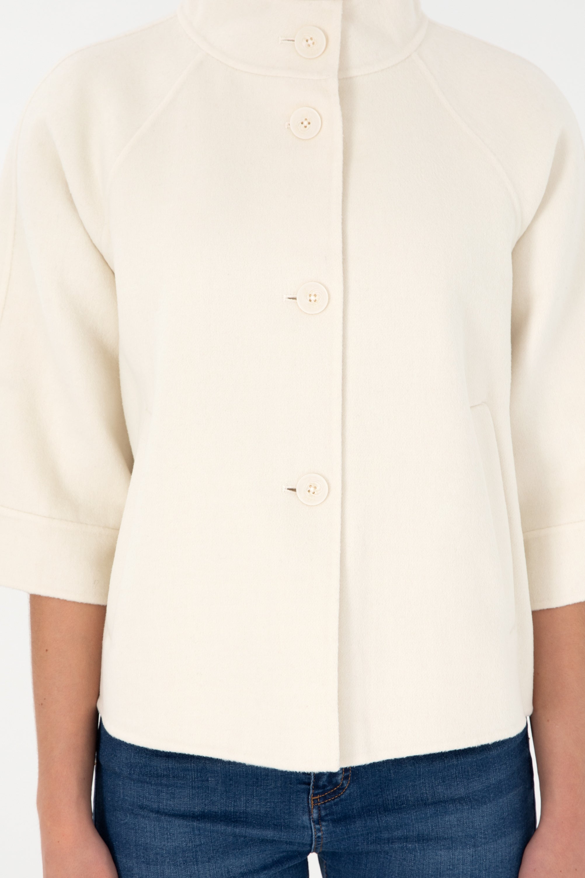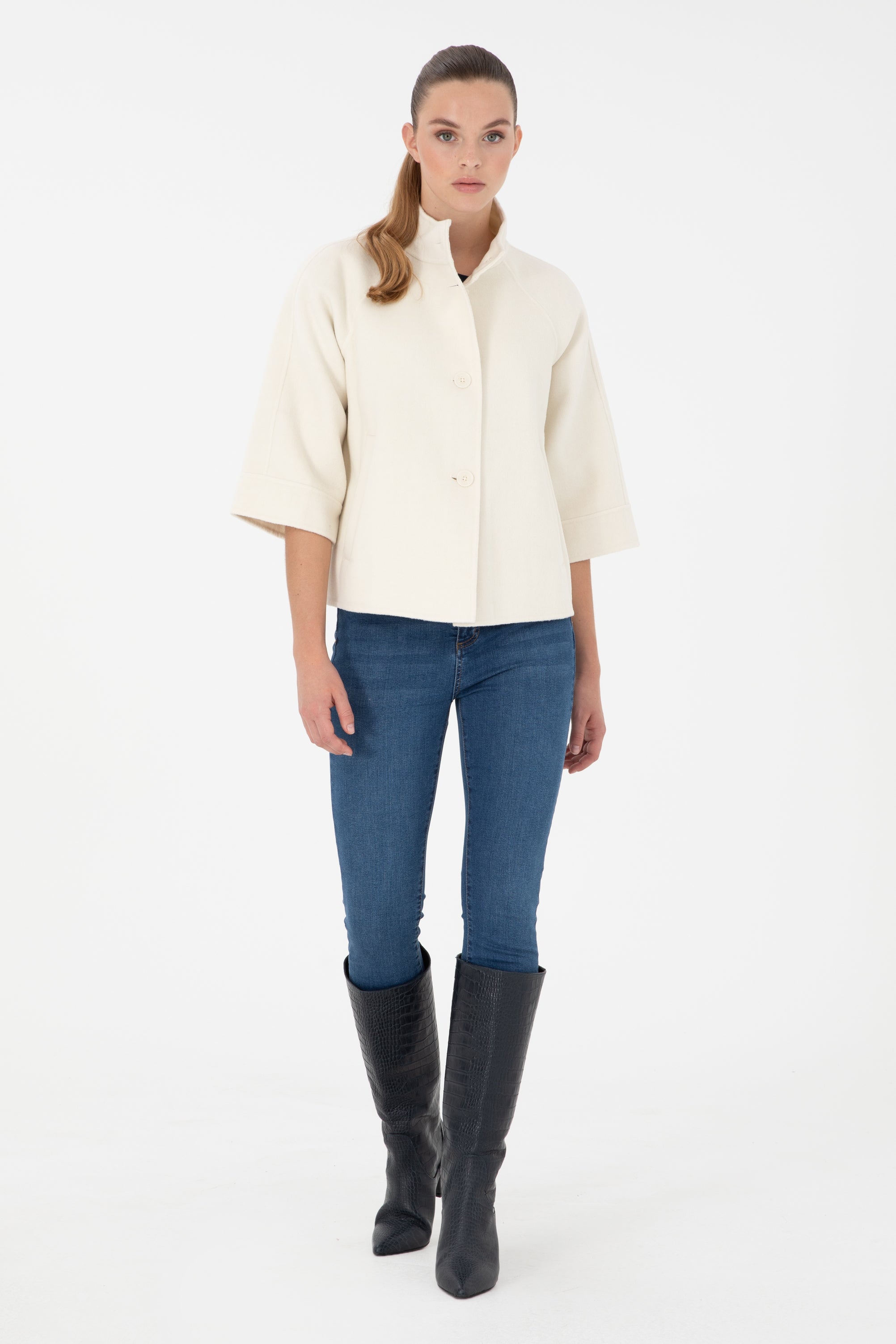 Elegantni kaput u svijetloj bež boji donosi sofisticiranost i udobnost tokom proljetnih dana. Njegov kroj ističe figuru, dok širi rukavi omogućavaju slobodu pokreta i dodatnu ventilaciju. Na prednjem dijelu kaputa nalaze se tri upečatna dugmeta koja doprinose modernom izgledu. Ovaj kaput je idealan za razne prilike, bilo da se radi o svakodnevnim izlascima ili formalnim događanjima, a lako se kombinuje sa različitim stilovima i odjevnim predmetima poput bluza, hlača ili suknji.
