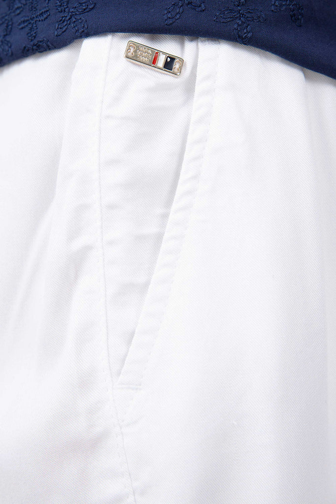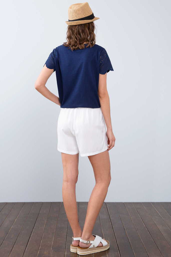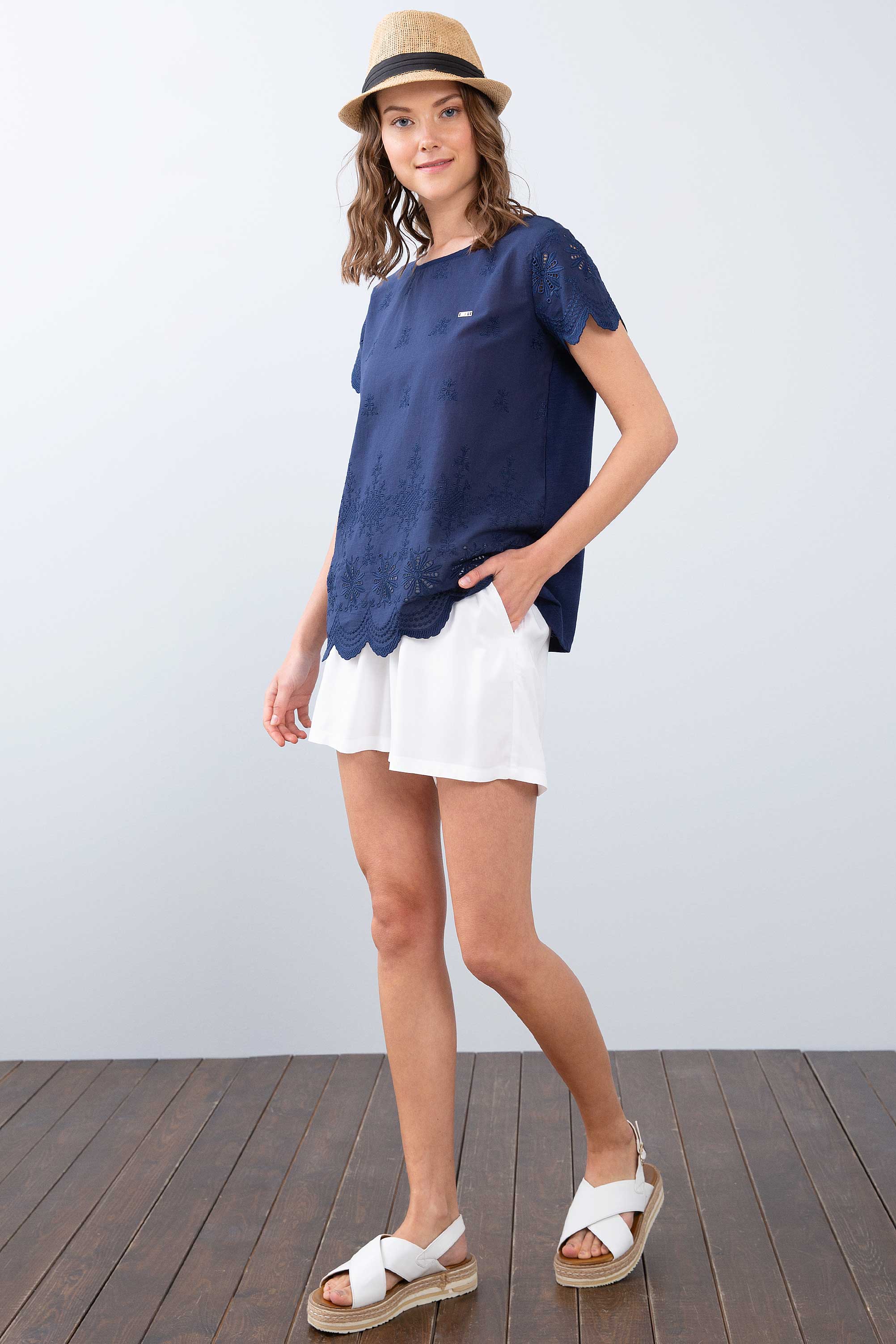 Šorc u tamno plavoj boji donosi savršen spoj udobnosti i stila za ljetne dane. Karakterišu ga lagani materijali koji omogućavaju prozračnost i lakoću, idealno za tople vremenske uslove. Donji rub šorца ukrašen je diskretnim cvjetnim detaljima koji dodatno ističu njegovu jedinstvenost. Ovaj šorc predstavlja savršen izbor za plažu ili neformalno druženje, a može se lako kombinovati s raznim majicama, topovima ili bluzama, čineći ga svestranim komadom u svakodnevnom ljetnom ormaru.